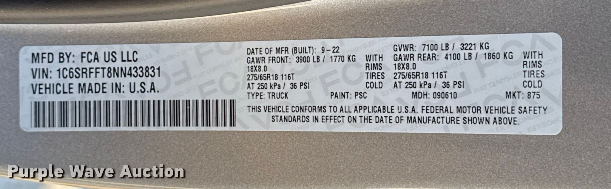Purple Wave is selling a used 1/2 Ton Pickup or Van in Oklahoma. This item is a 2022 RAM 1500 Crew Cab pickup truck with the following: Miles: 112,082 on odometer, VIN: 1C6SRFFT8NN433831, Unit #: 433831