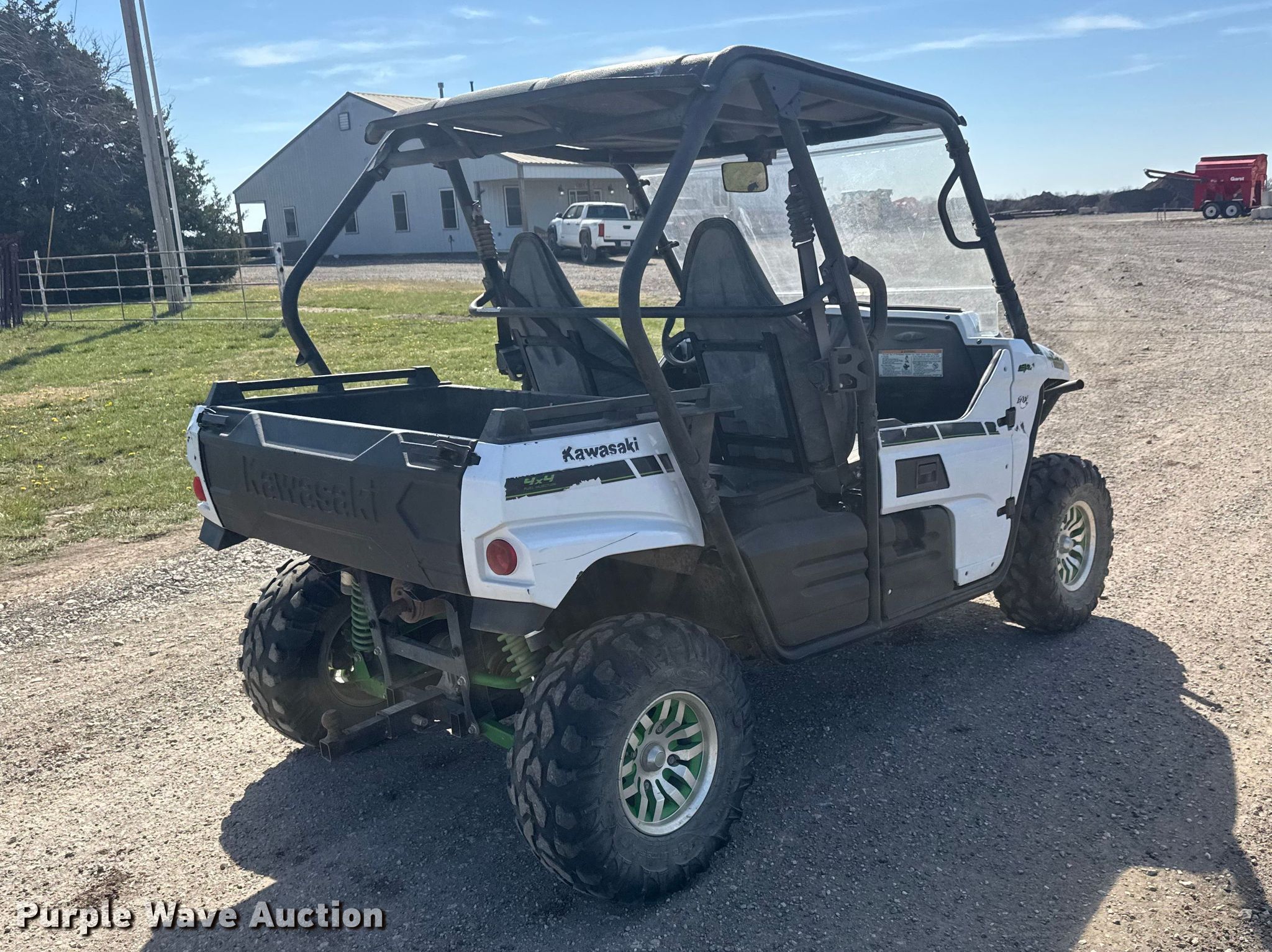 2015 Kawasaki 800 utility vehicle. Miles: 4,995 on odometer, Hours: 717 on meter, VIN: JKBRFCC18FB503595. Engine Cylinders: 2, Fuel type: Gas. Transmission Automatic. Chassis Four wheel drive/ All wheel drive. Operators station OROPS. Features Grille guard, Receiver hitch, Dump bed 32" L x 50" W, Dump bed type: Manual, Differential lock. Tires Front: 26x9.00R12, Rear: 26x11.00R12. Notes Unknown operating condition of parking brake. Kansas non-highway not intnd for road use title. Title distribution may be delayed up to 14 days from verification of funds. Stands Farms, LLC. El Dorado, KS 67042