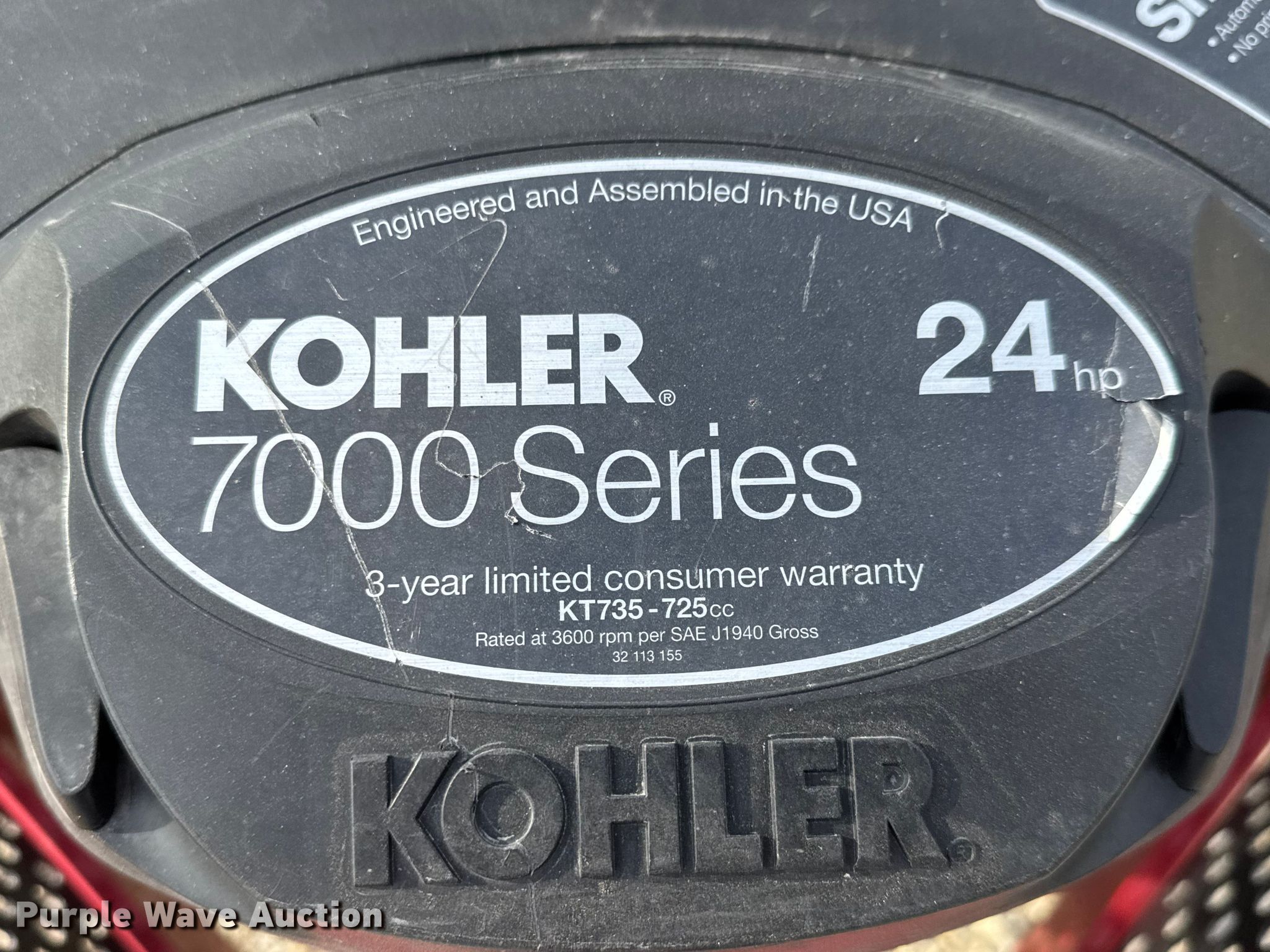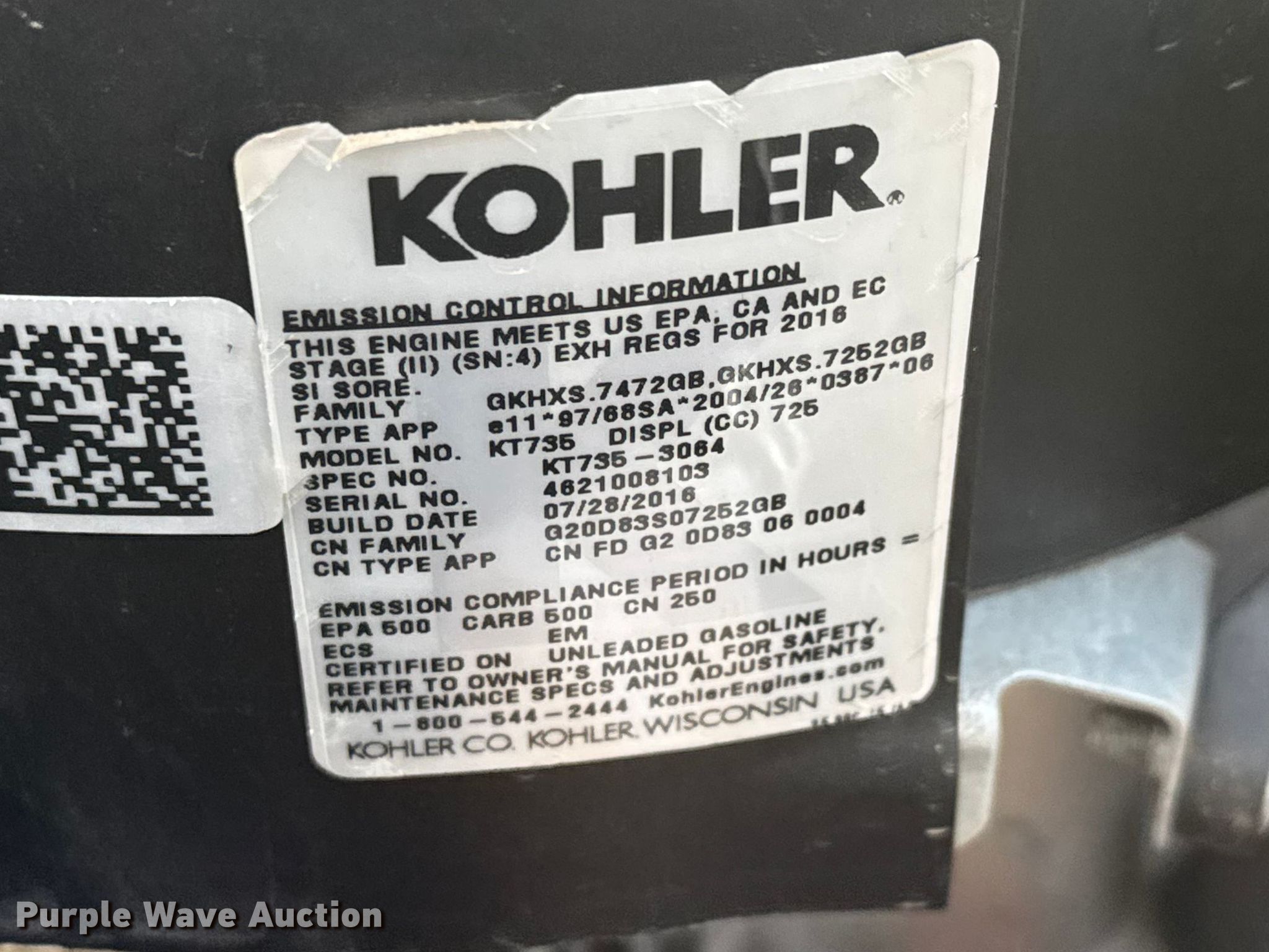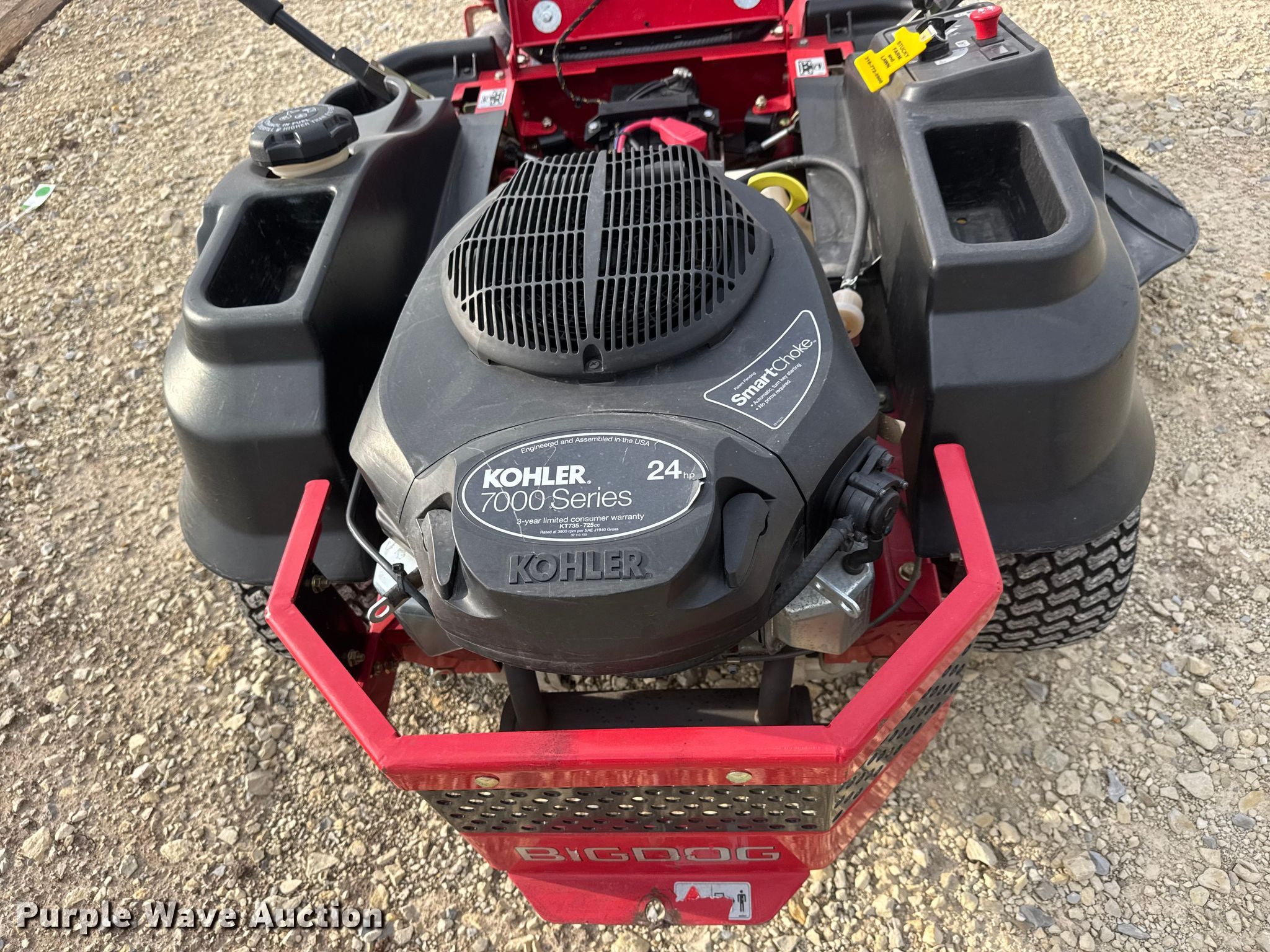 Big Dog Alpha 935999 ZTR lawn mower. Hours: 116 on meter, Cutting width: 52", Serial: 16114581. Engine Kohler KT735, Serial: 4621008103, Displacement: 725cc, Cylinders: 2, Fuel type: Gas, HP: 24. Transmission Hydrostatic. Tires Front: 11x4.00-5, Rear: 18x8.50-8. Sedgwick, KS 67135