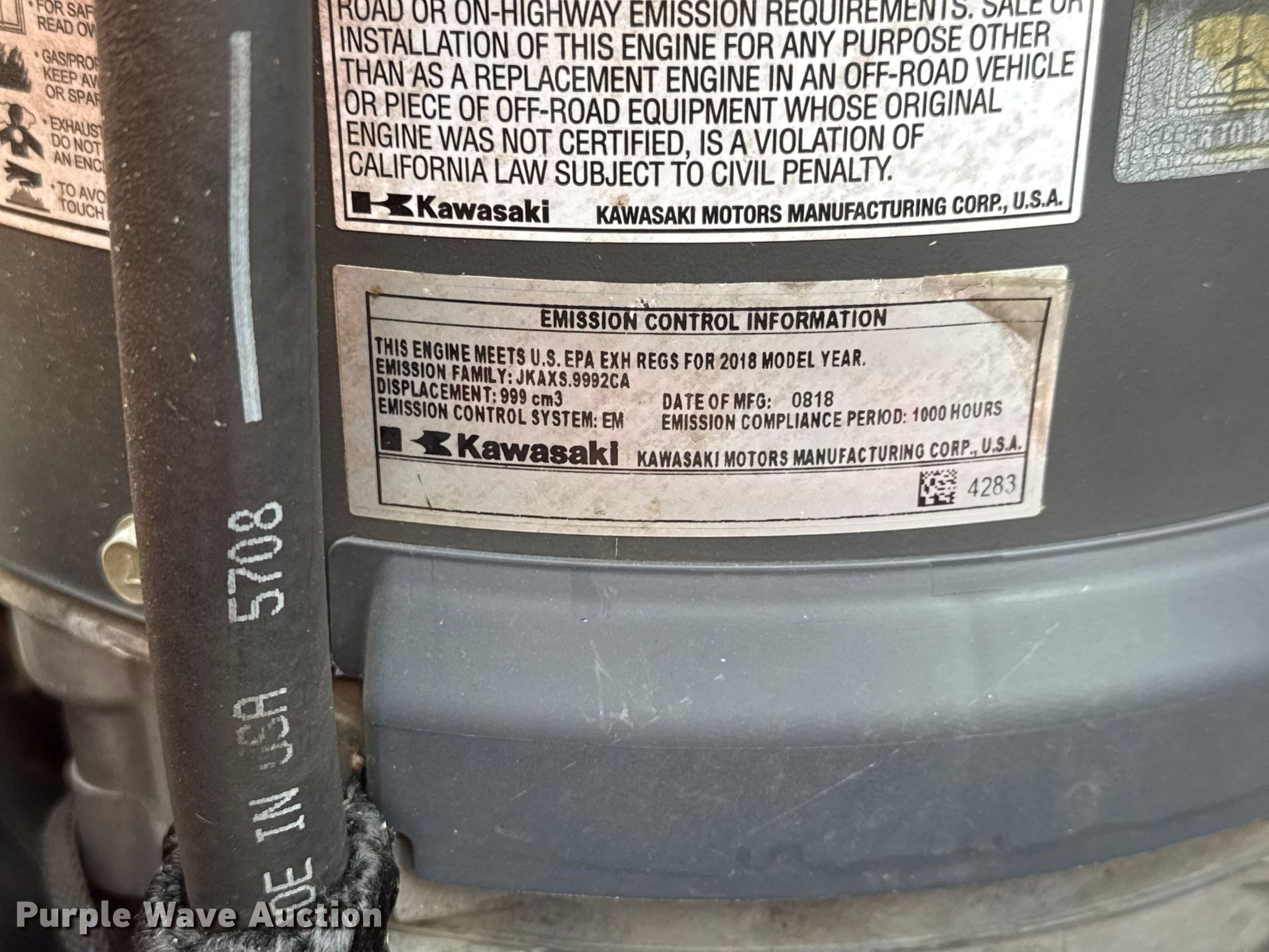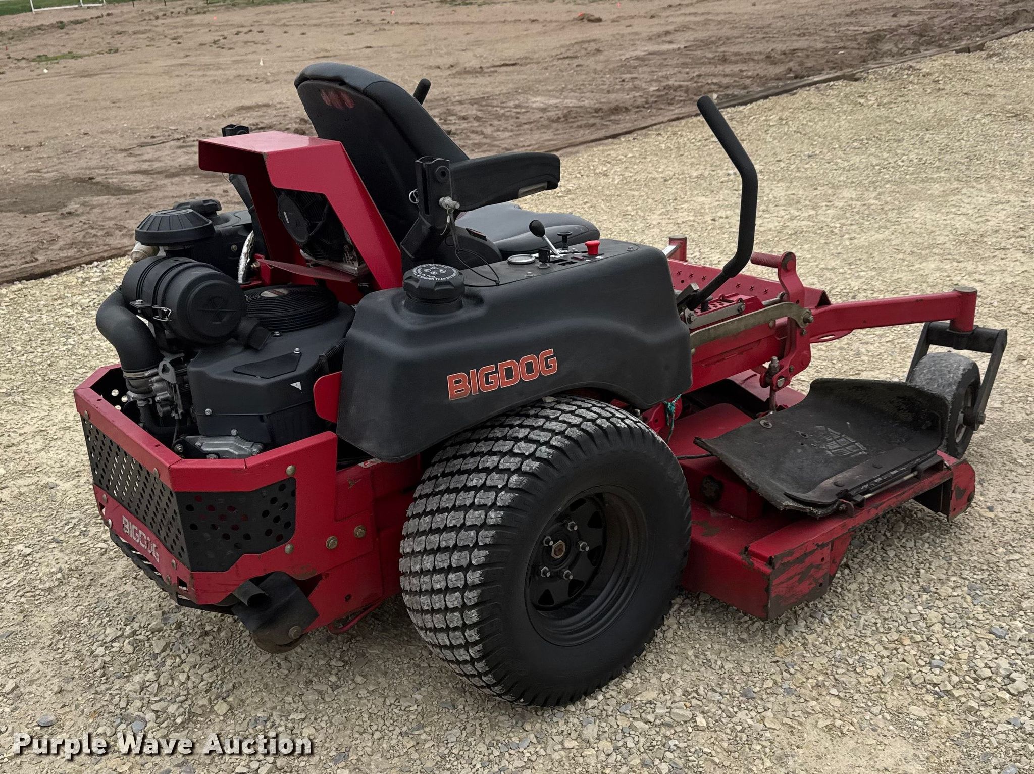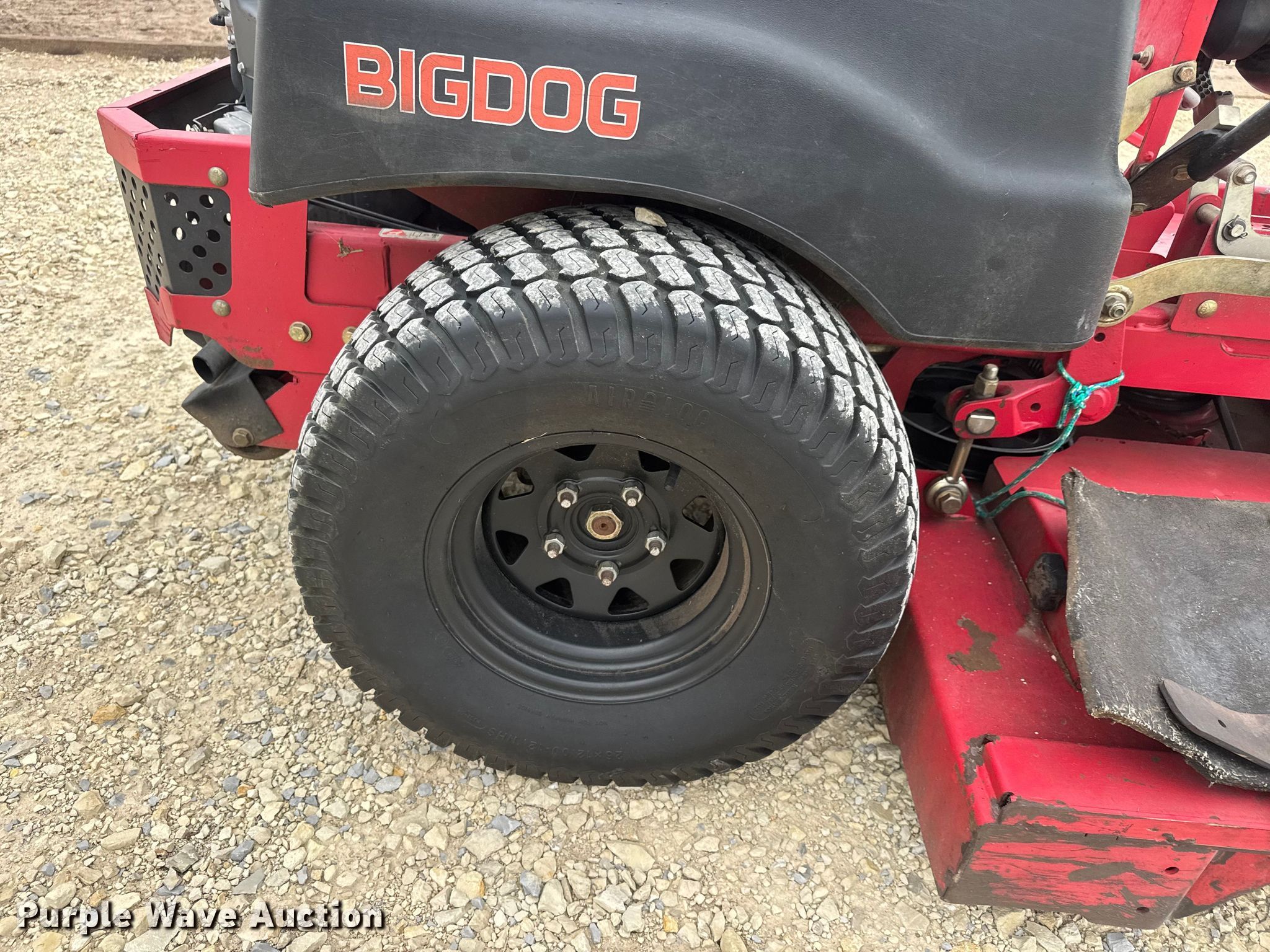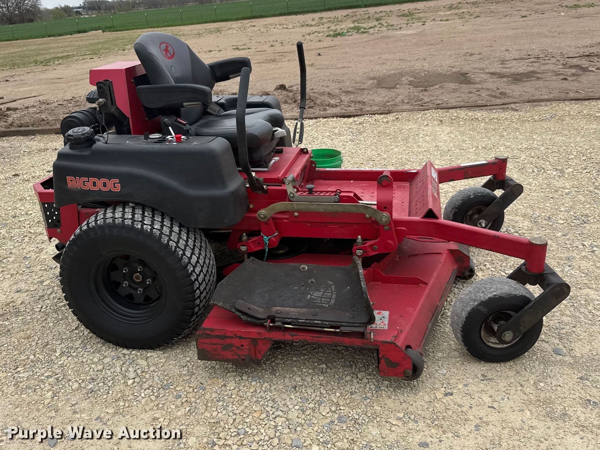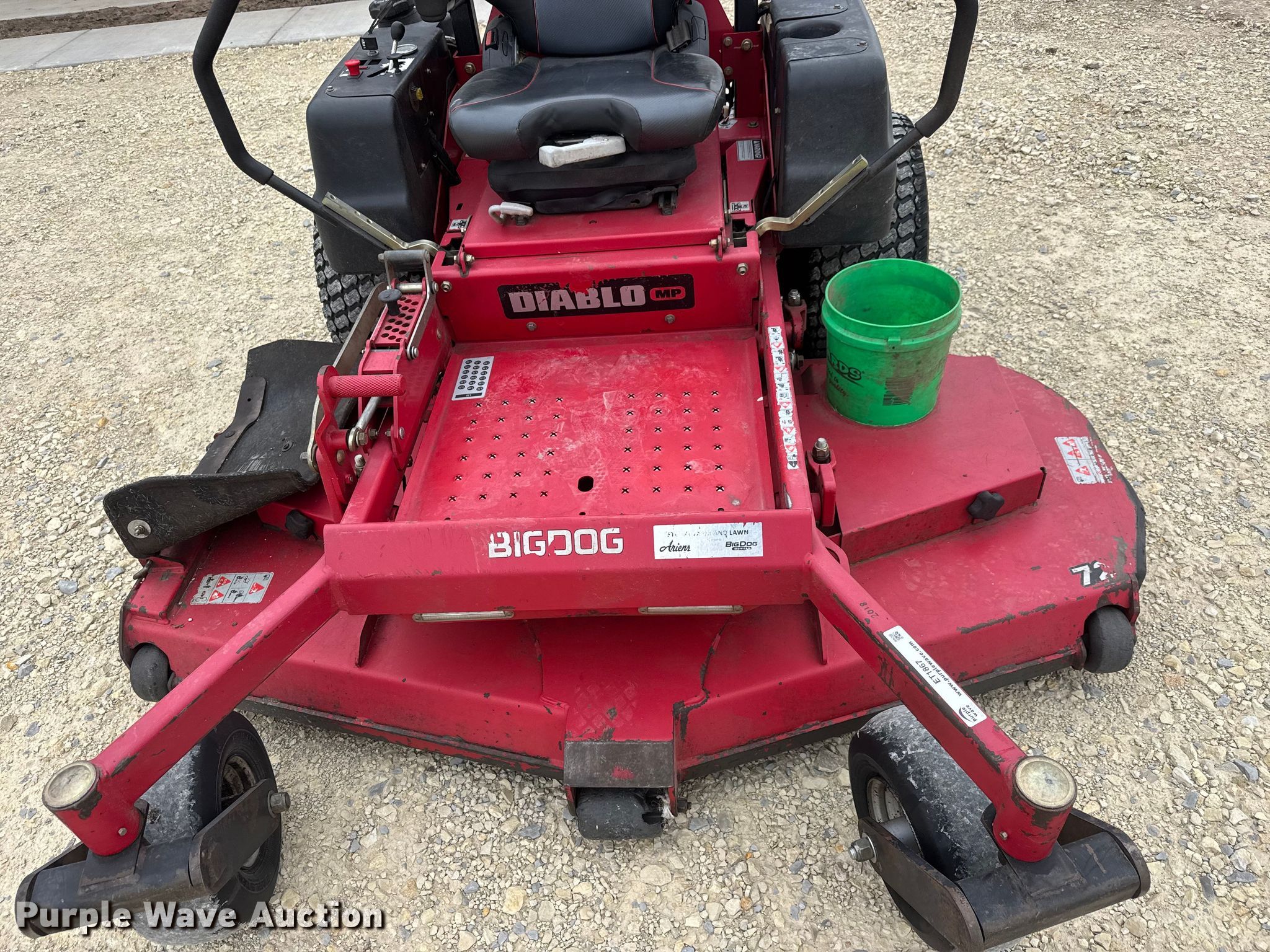 Big Dog Diablo MP ZTR lawn mower. Hours: 599 on meter, Cutting width: 72", Serial: 18093015. Engine Kawasaki, Displacement: 999cc, Cylinders: 2, Fuel type: Gas. Transmission Hydrostatic. Tires Front: 13x6.50-6, Rear: 26x12.00-12. Sedgwick, KS 67135