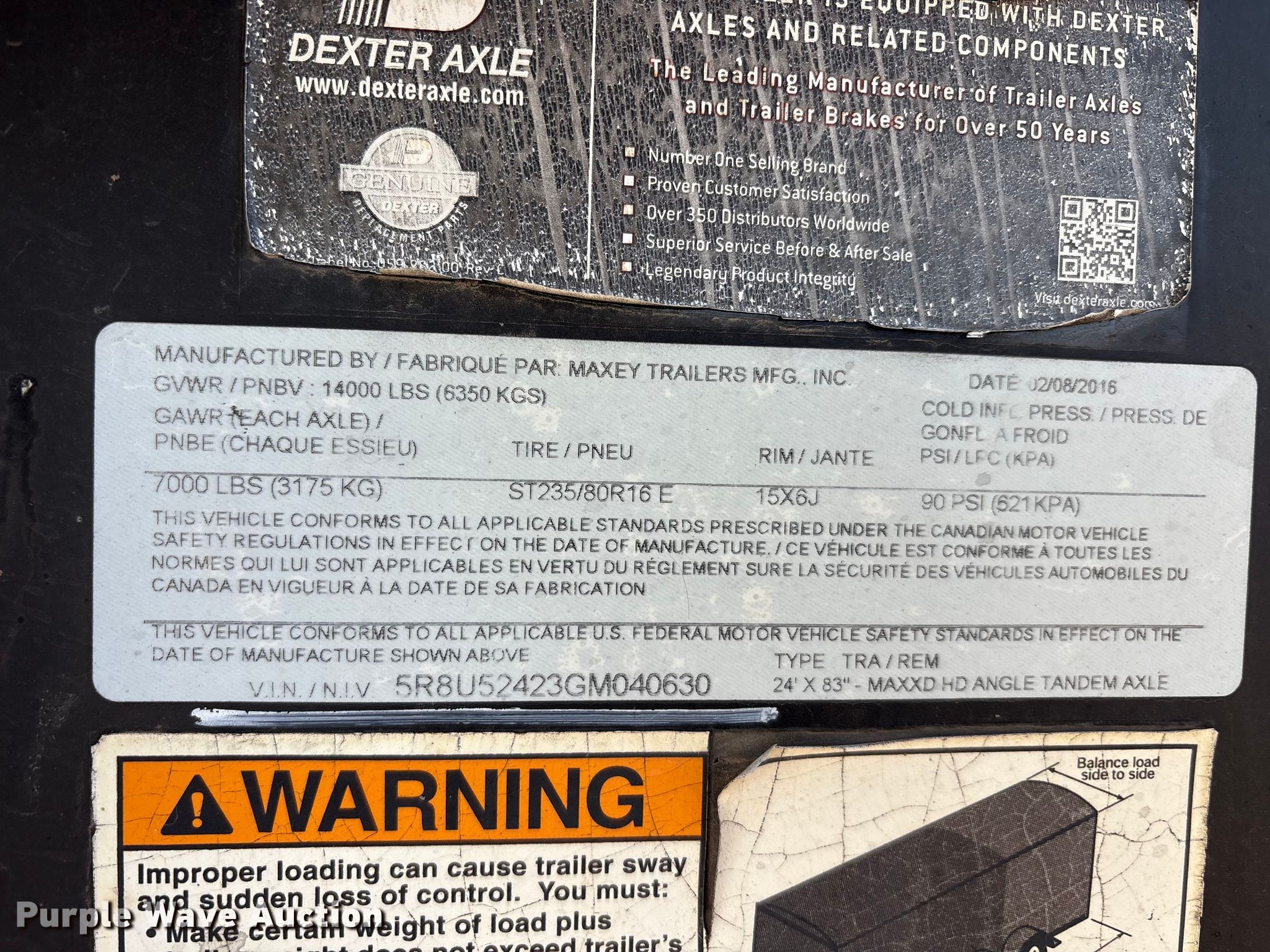 2016 Maxey equipment trailer. VIN: 5R8U52423GM040630. Dimensions Overall Length: 34', Width: 102", Deck Length: 24', Width: 84", Ramps: Manual Length: 59". Features Deck type: Wood. Chassis Hitch: Gooseneck, Landing gear: Dual, Suspension: Spring, Brakes: Electric, Axles: Tandem, GVWR: 14,000 lbs, GAWR: 7,000 lbs. Tires Steel wheels, Size: 235/80R16. Kansas title. Title distribution may be delayed up to 30 days from verification of funds. Amarillo, TX 79124