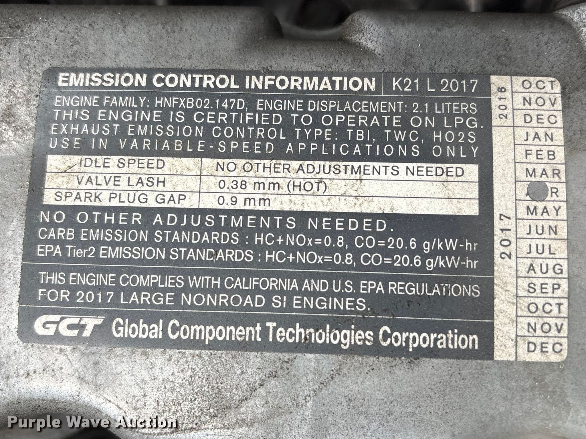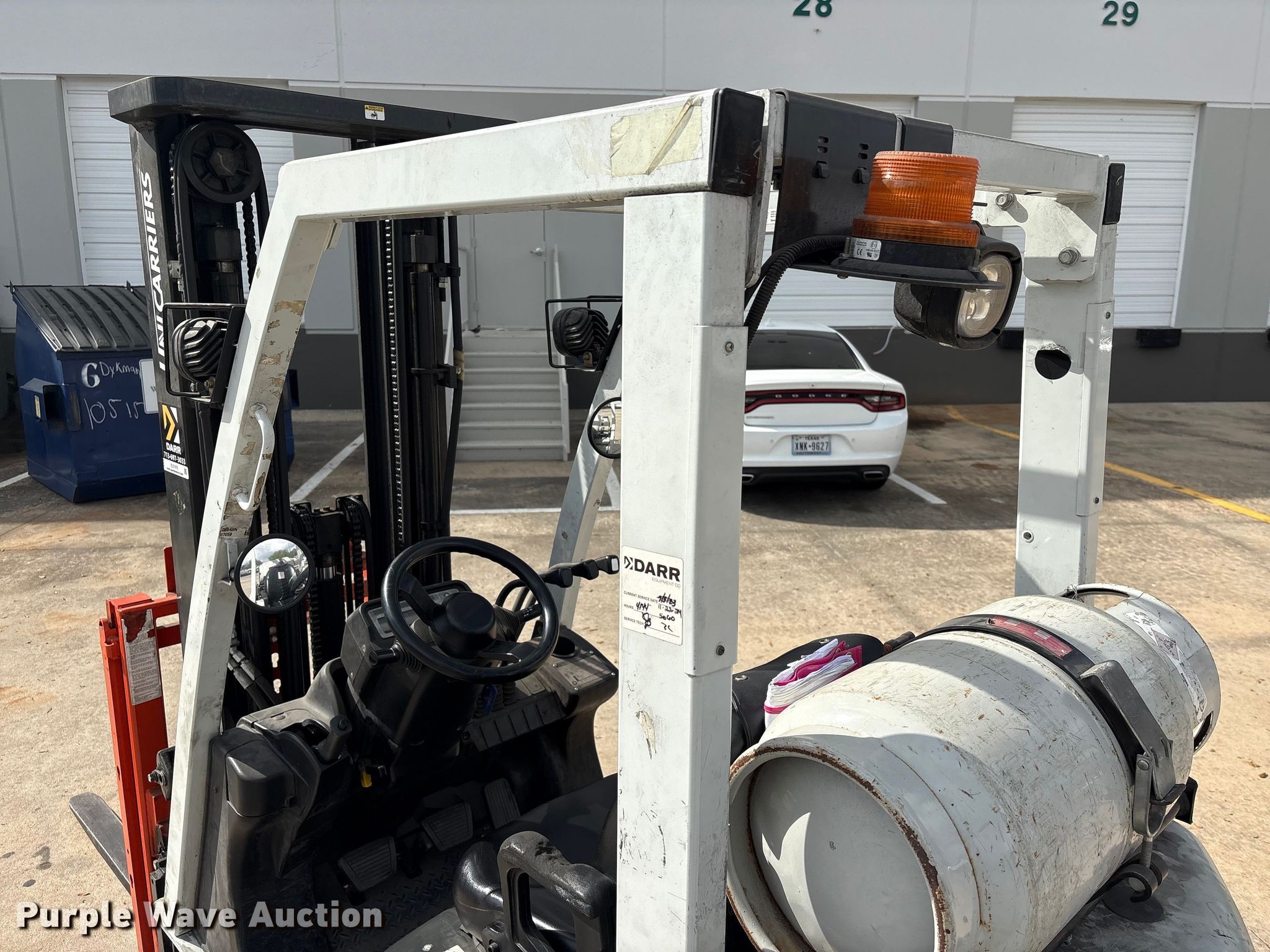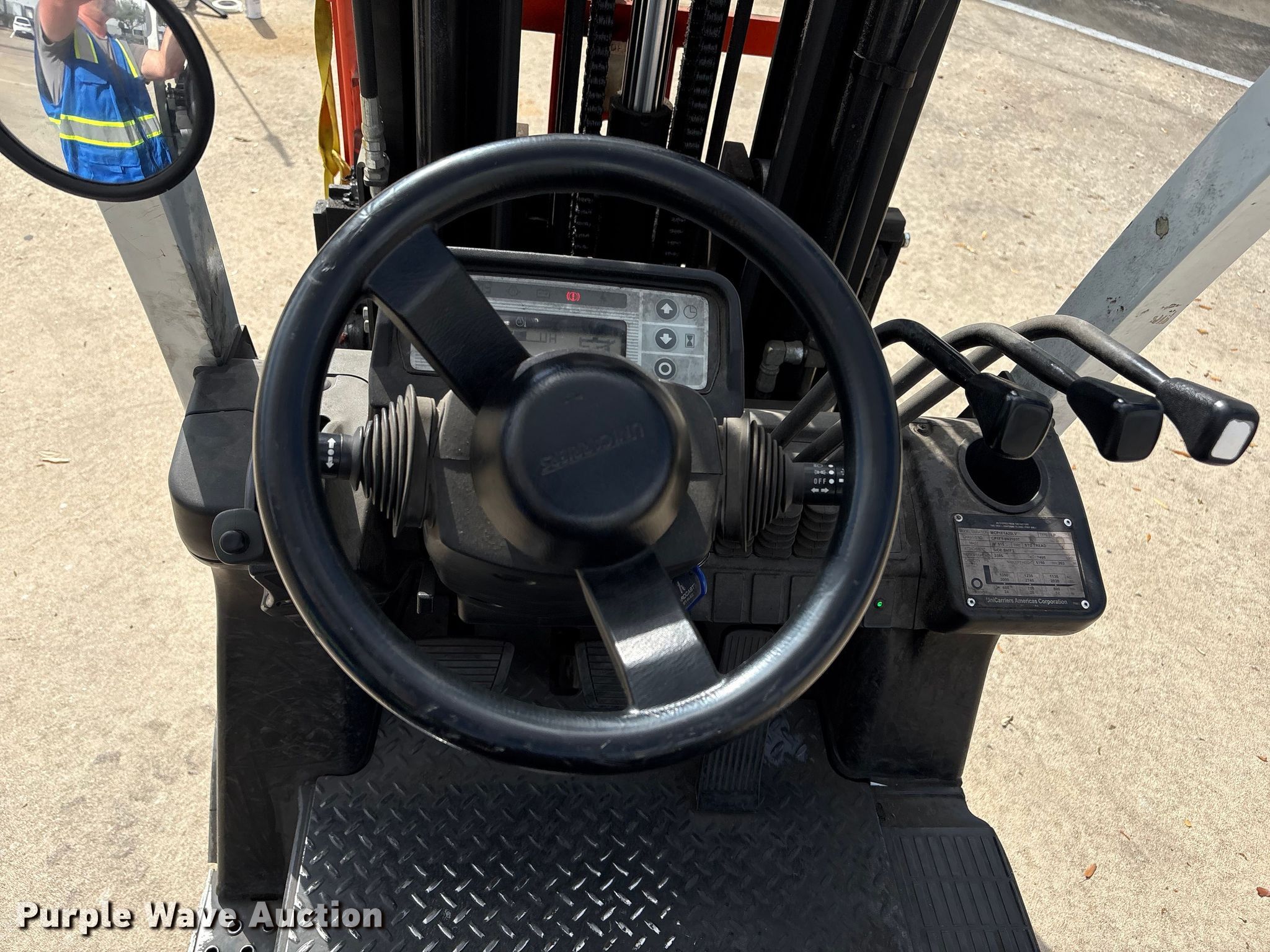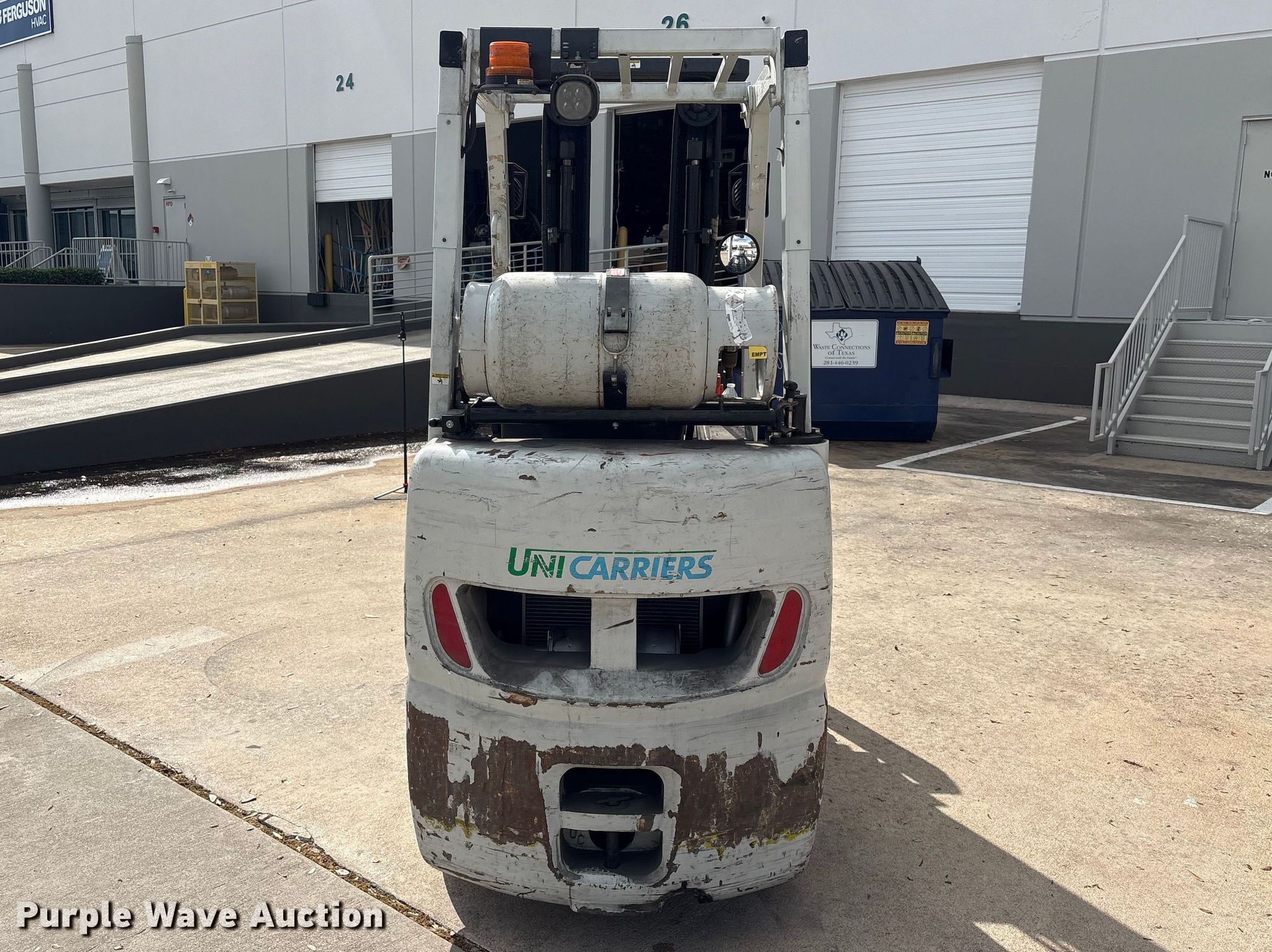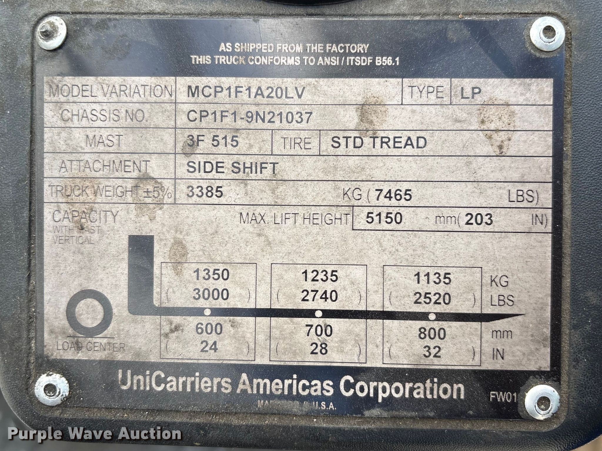 2017 UniCarriers CFS40 forklift. Hours: 5,160 on meter, Serial: CP1F1-9N21037, Unit #: SFS2574. Engine GCT, Displacement: 2.1L, Cylinders: 4, Fuel type: LPG LP bottle: Not included. Transmission Automatic. Operators station OROPS. Features Maximum lift capacity: 3,000 lbs, Maximum lift height: 203", Collapsed mast height: 87", Mast stages: 3, Side shift, Mast tilt, Fork length: 48". Tires Front: 18x6x12, Rear: 14x5x10, Solid. Ferguson. Houston, TX 77041