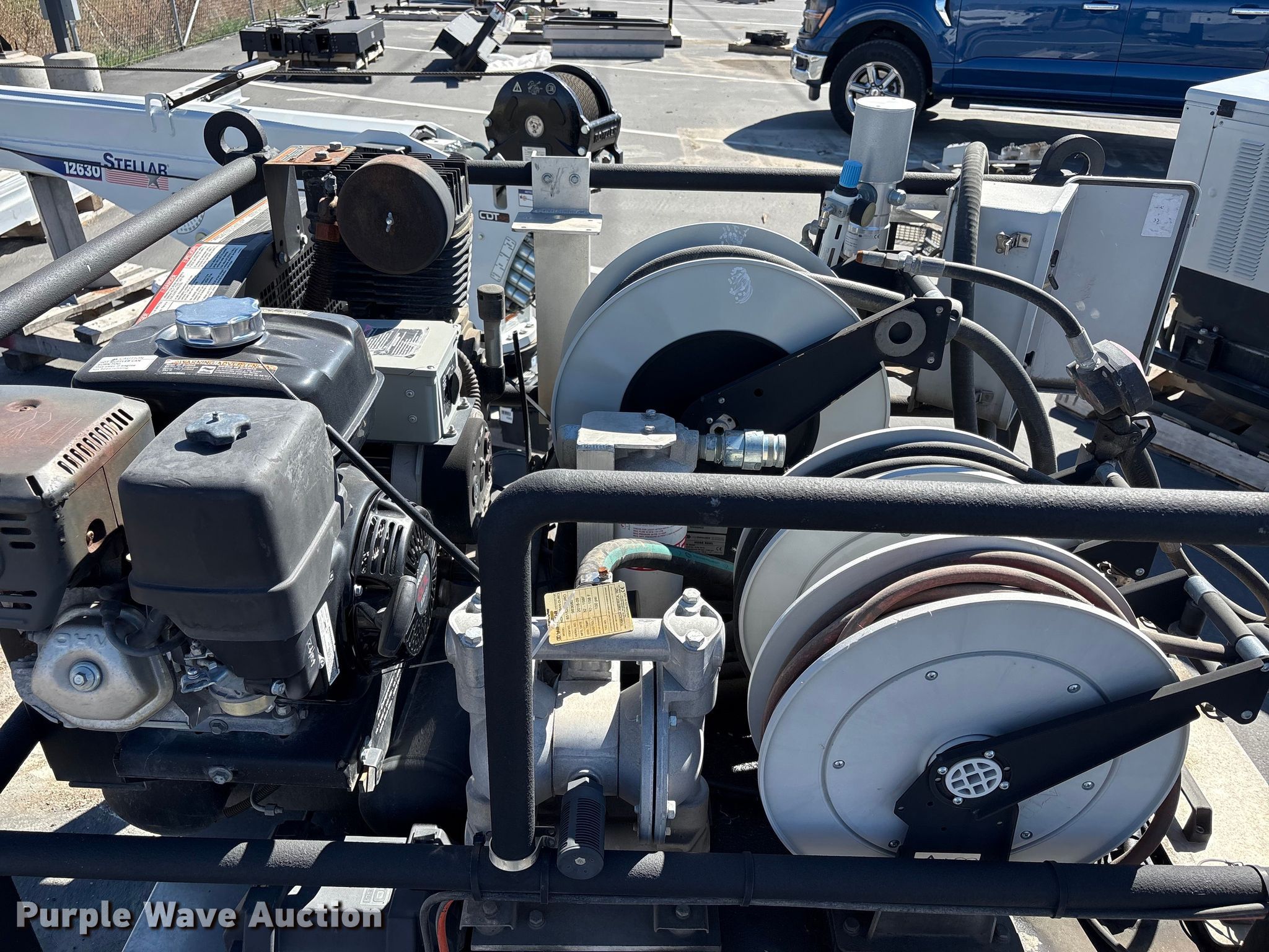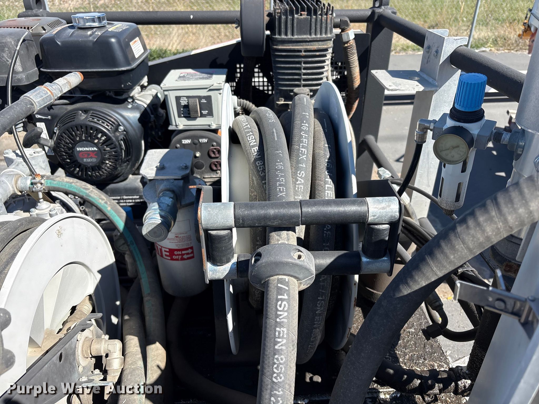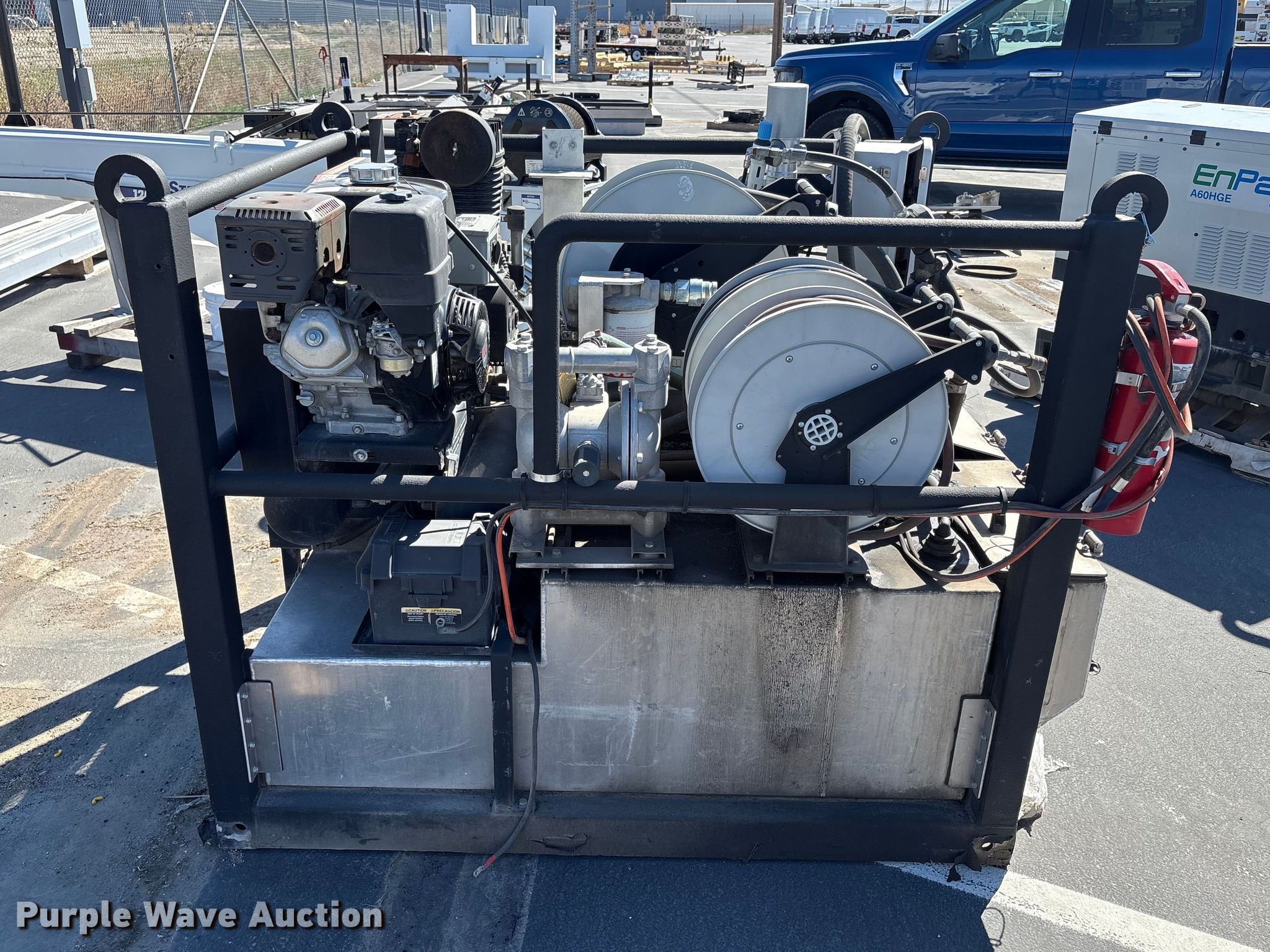 Heritage industries lube skid. Dimensions. Overall Length: 5', Width: 4', Height: 5' 2". Engine Honda GX390, Displacement: 389 cc, Fuel type: Gas. Electric Motor Serial: 0468078K, Volts: 120/240, Phase: Single. Features Air compressor/generator, (3) hose reels, Yamada diaphragm pump, Oil tank. Notes Dead battery, Unknown operating condition. Heritage Industries. Salt Lake City, UT 84104