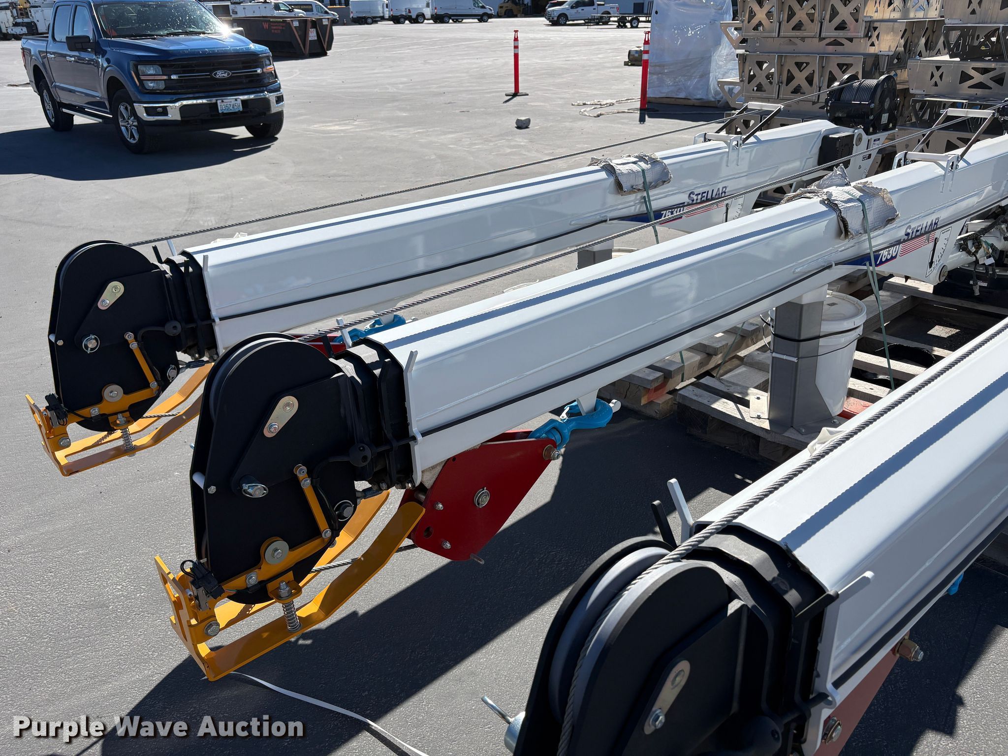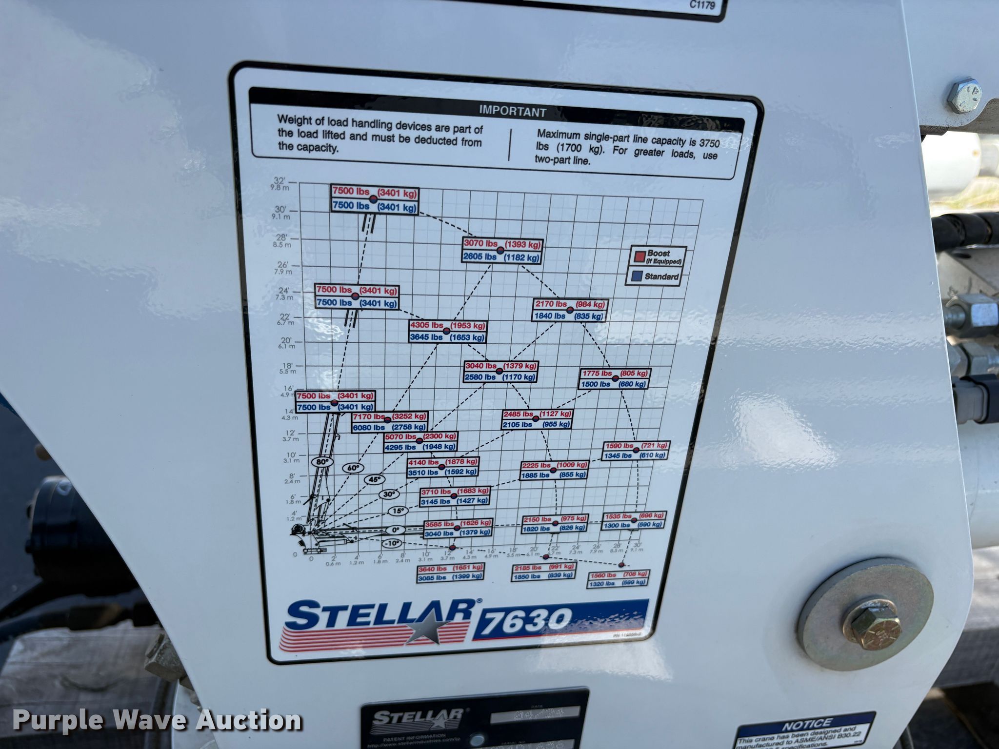 2024 Stellar 7630 crane. Serial: DIK24D1656. Features Boom Telescopic, Maximum boom length: 30' Sections: 3, Maximum lift capacity: 7,500 lbs, Maximum lift height: 31', Boom controls Ground, Crane block Sheaves: 1, Capacity: 5 tons, Lift chart. Notes Unused. Heritage Industries. Salt Lake City, UT 84104