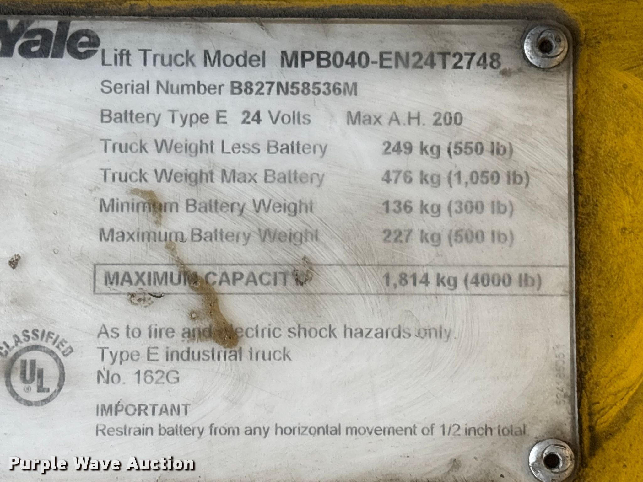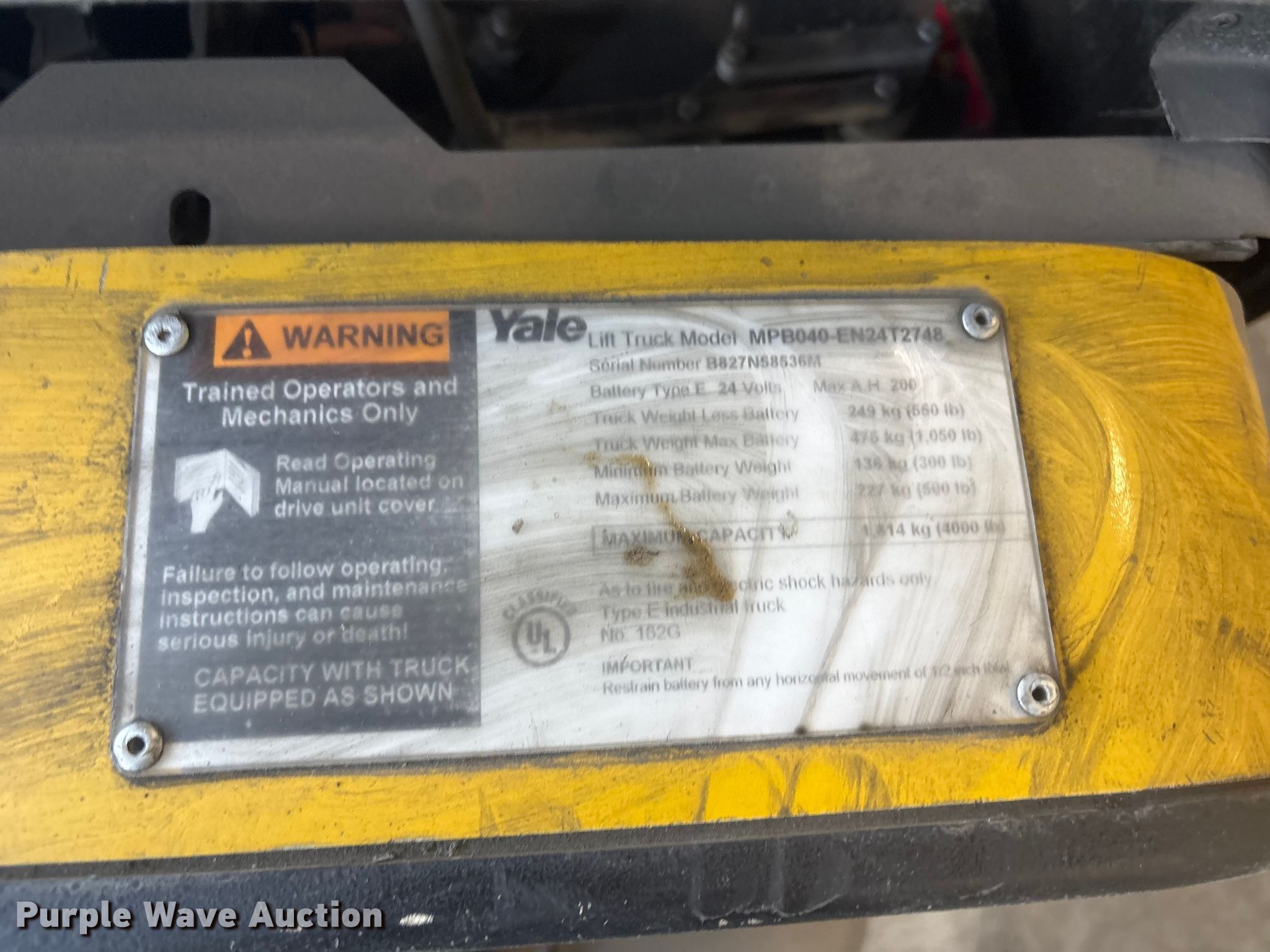 Purple Wave is selling a used Warehouse Forklift in Arkansas. This item is a Yale MPB040-EN24T2748 pallet jack with the following: Serial: B827N58536M