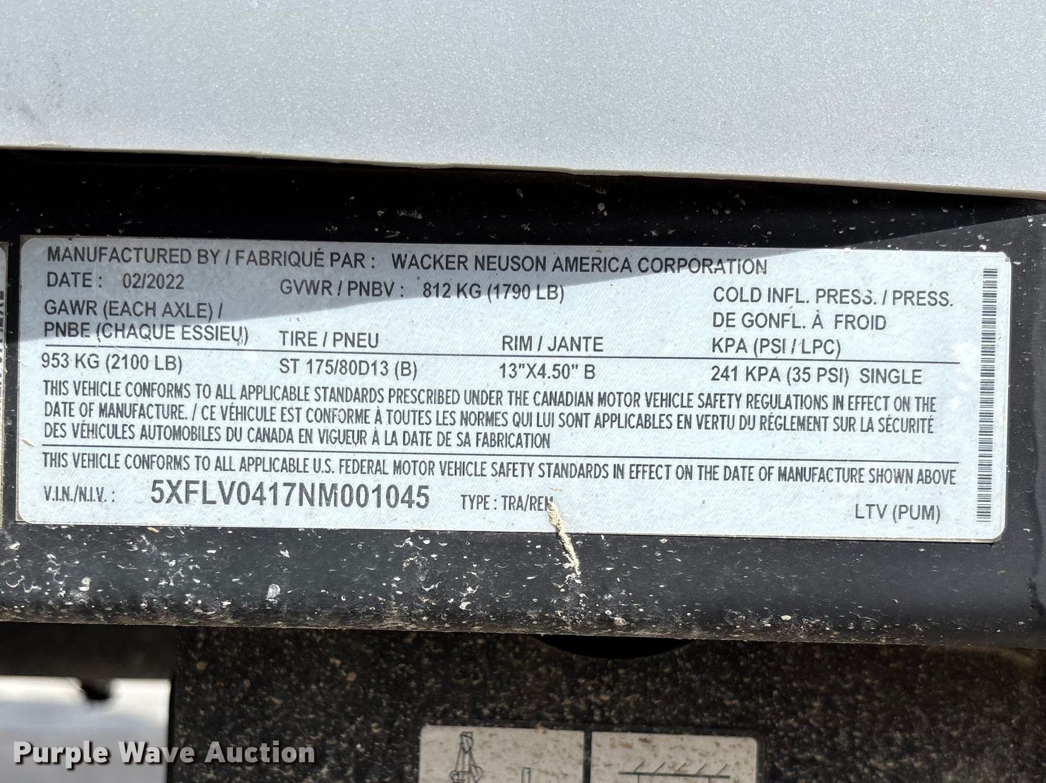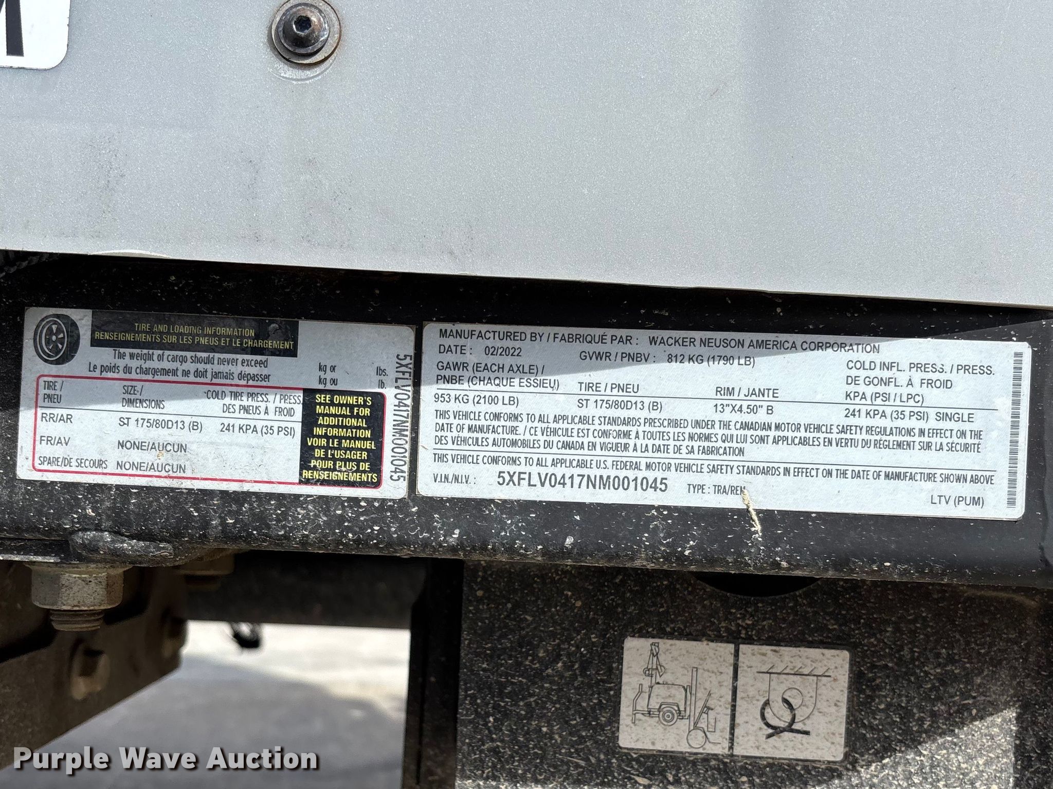 2022 Wacker Neuson LTV4 light plant. Hours: 253 on meter, VIN: 5XFLV0417NM001045. Engine Cylinders: 2, Fuel type: Diesel. Features Generator kW: 4, Electric start, Light plant Bulbs: 4, Watts: 300, Hoist: Manual, Stabilizers. Trailer 2022, 8' L x 4" W, Ball hitch size: 2", Suspension: Torsion, Axles: Single, Tire size: 175/80D13, GVWR: 1,790 lbs. Notes Fire damage, Non-operational unit. A-1 Tool & Equipment Rental. Jefferson City, MO 65101