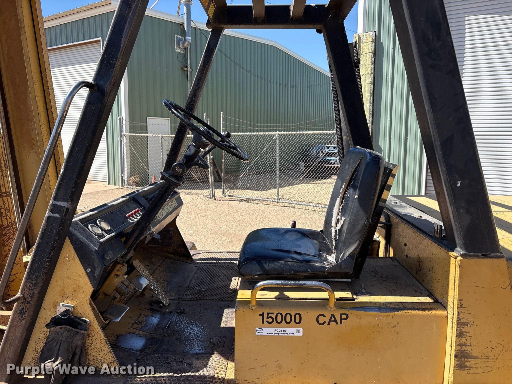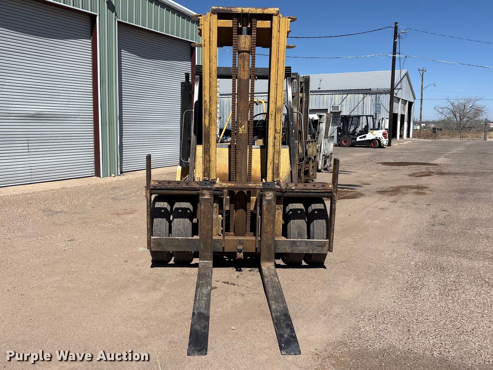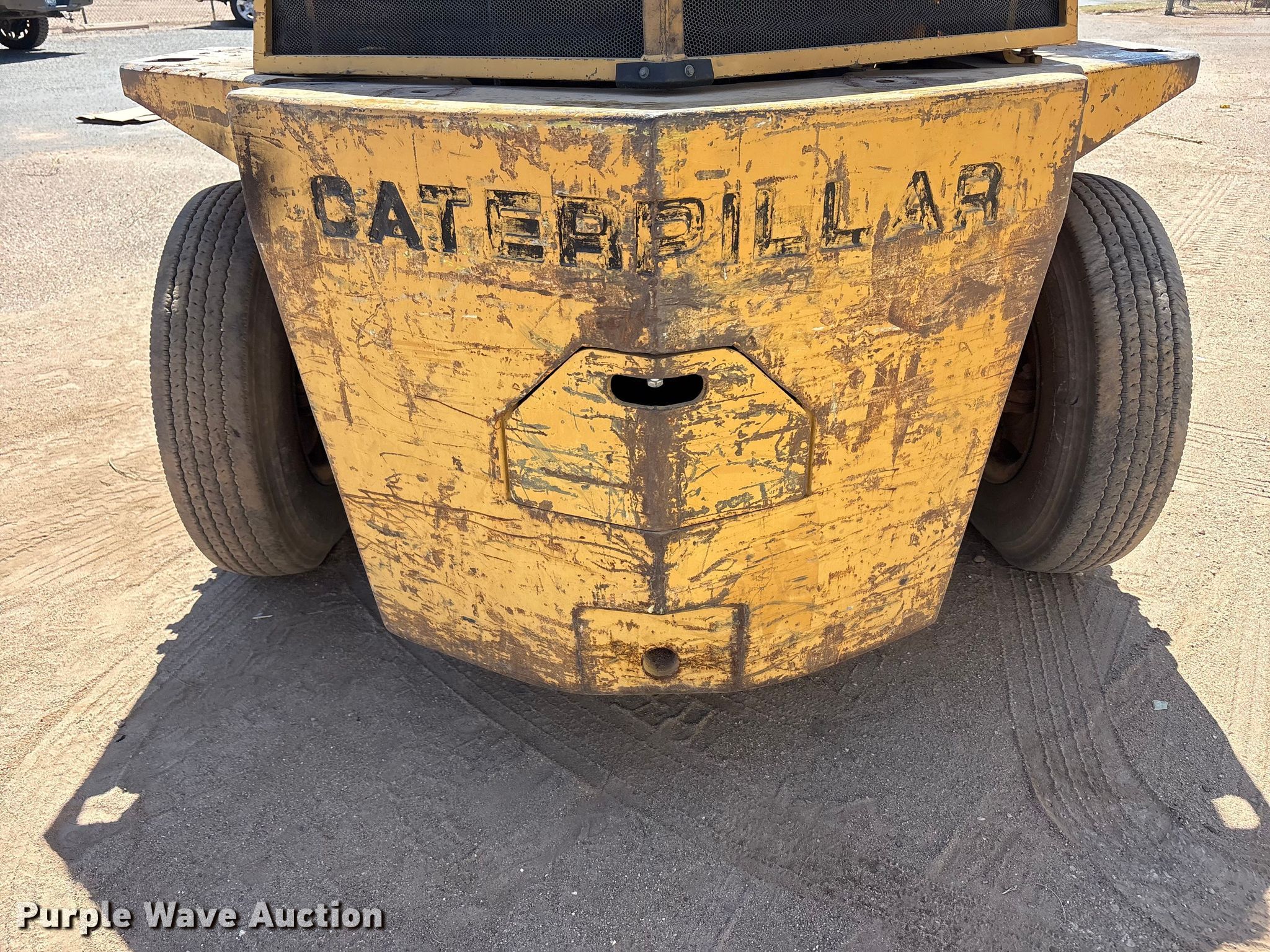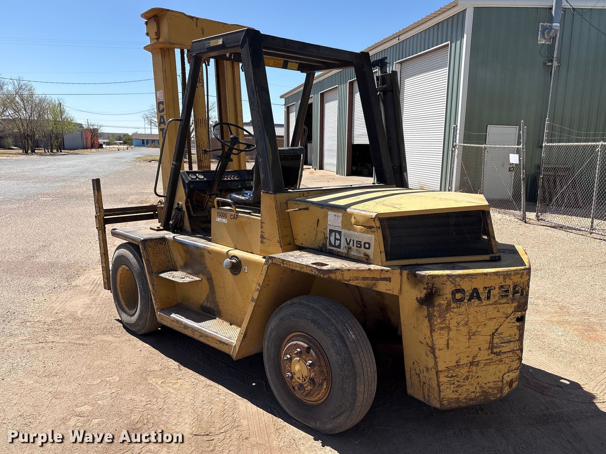 Caterpillar V150 forklift. Hours: 20,891 on meter, Miles or hours may vary, unit still in use. Engine Perkins, Cylinders: 4, Fuel type: Diesel. Transmission Manual, 2F - 2R. Operators station OROPS. Features Maximum lift capacity: 15,000 lbs, Collapsed mast height: 114", Mast stages: 2, Mast tilt, Fork length: 72". Tires Size: 8.25R15. Harmon Tank Company Inc. Lubbock, TX 79403