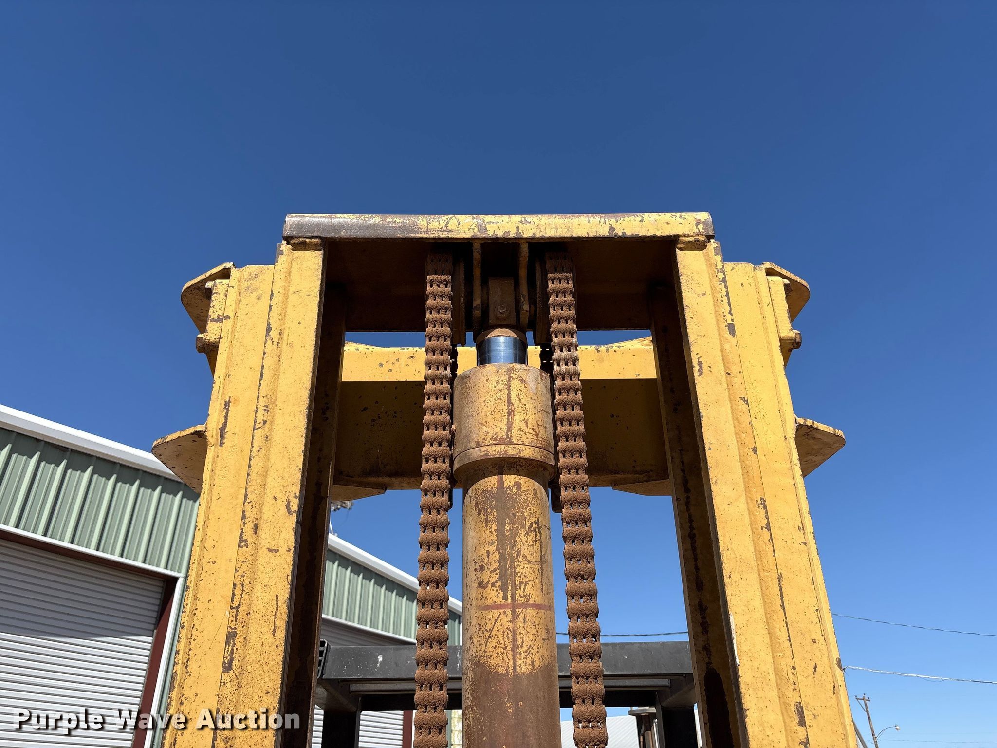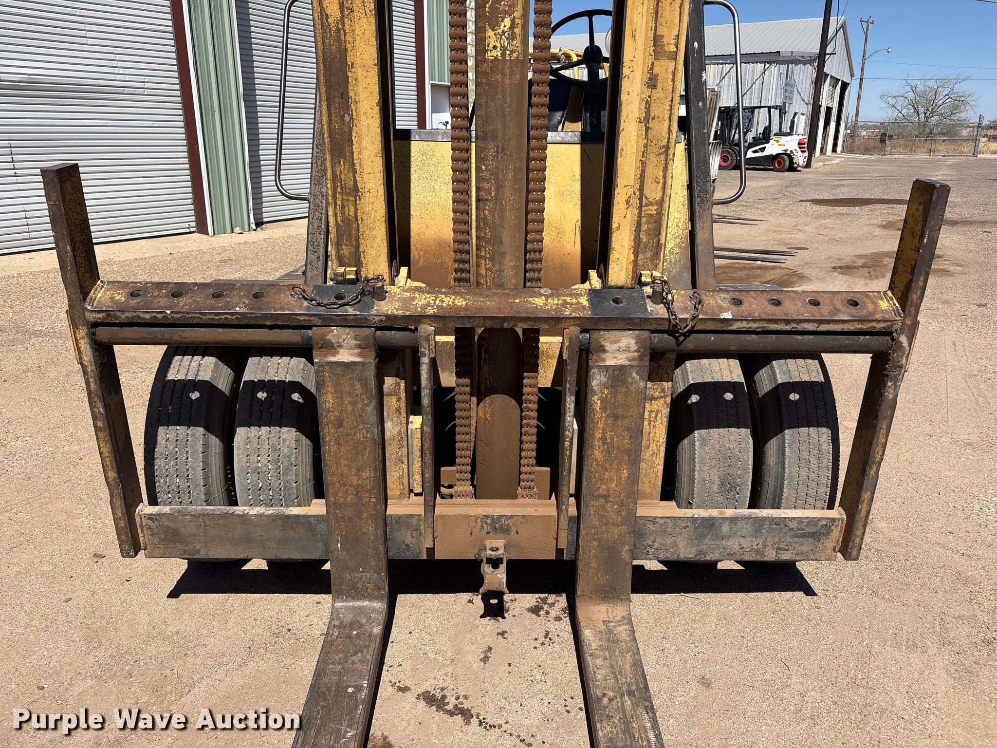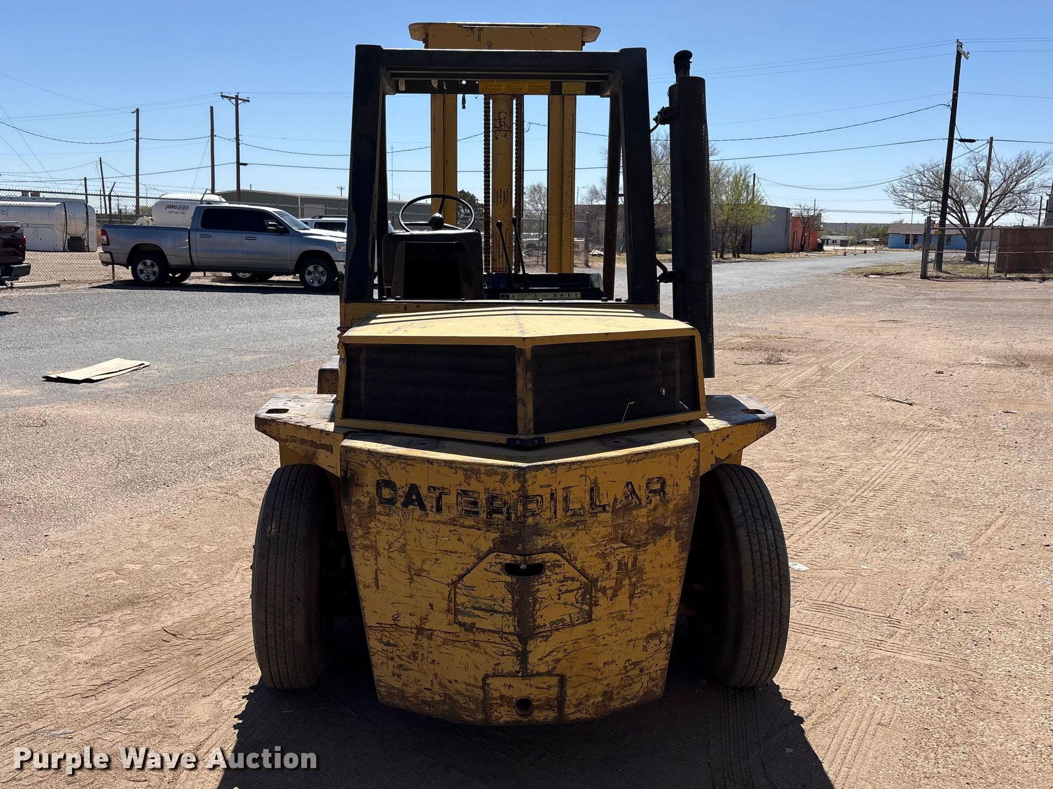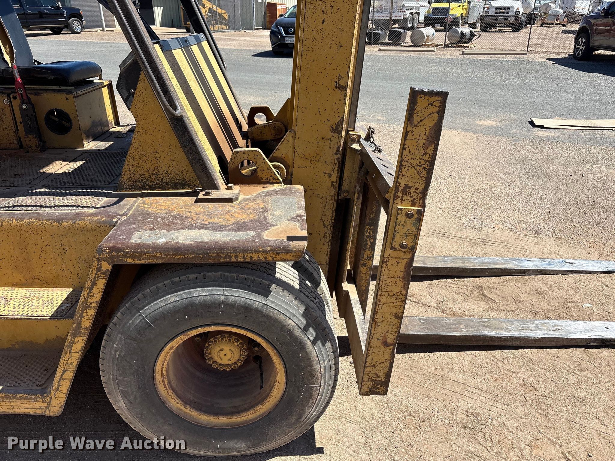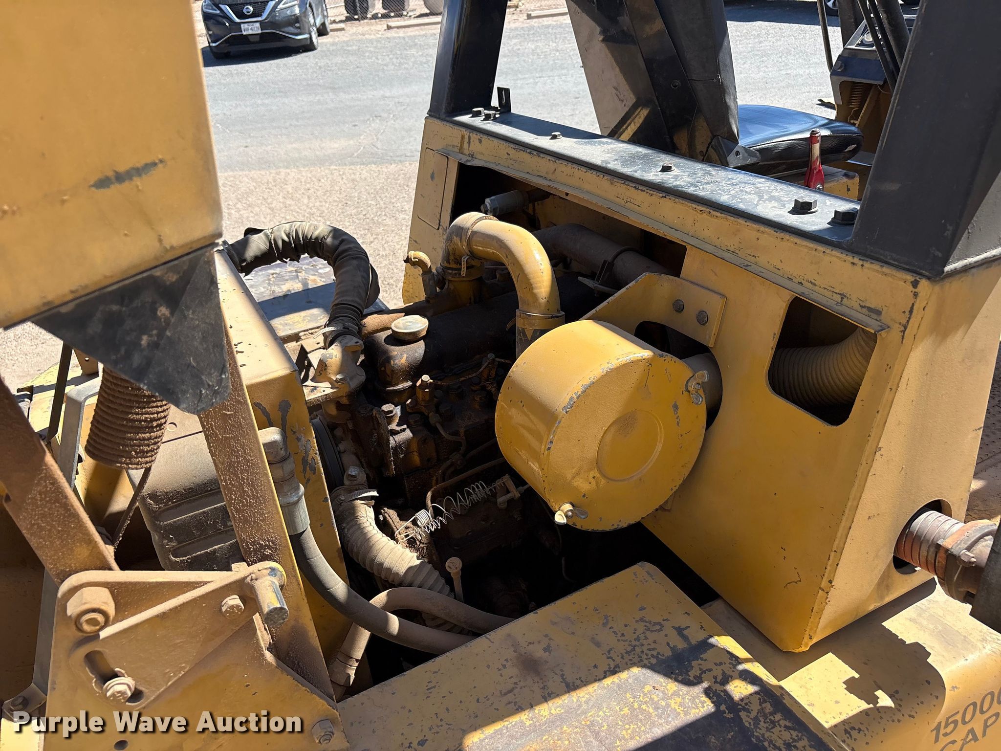 Caterpillar V150 forklift. Hours: 20,891 on meter, Miles or hours may vary, unit still in use. Engine Perkins, Cylinders: 4, Fuel type: Diesel. Transmission Manual, 2F - 2R. Operators station OROPS. Features Maximum lift capacity: 15,000 lbs, Collapsed mast height: 114", Mast stages: 2, Mast tilt, Fork length: 72". Tires Size: 8.25R15. Harmon Tank Company Inc. Lubbock, TX 79403