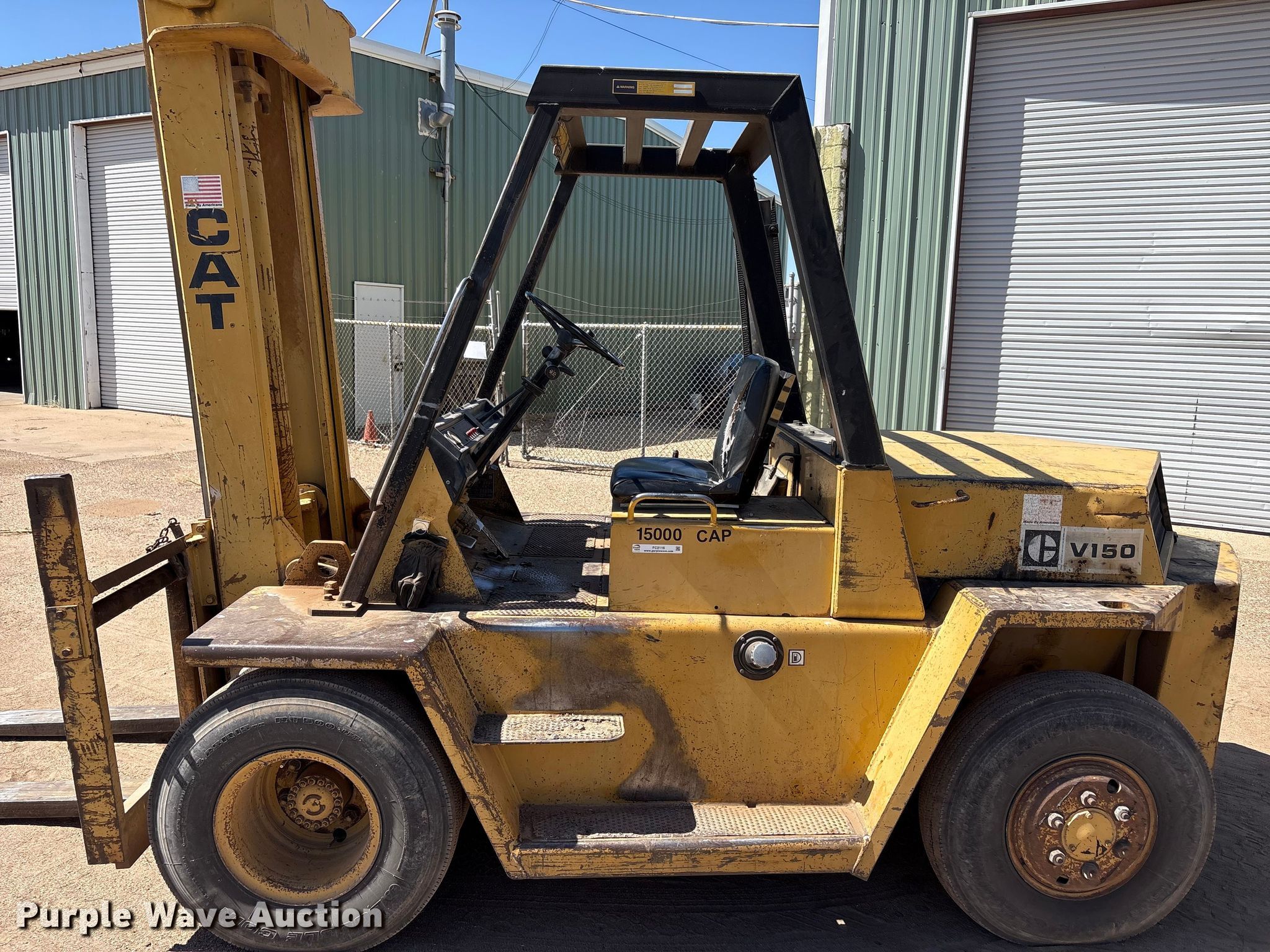 Purple Wave is selling a used Cushion Tire or Pneumatic Forklift in Texas. This item is a Caterpillar V150 forklift with the following: Hours: 20,891 on meter, Miles or hours may vary, unit still in use