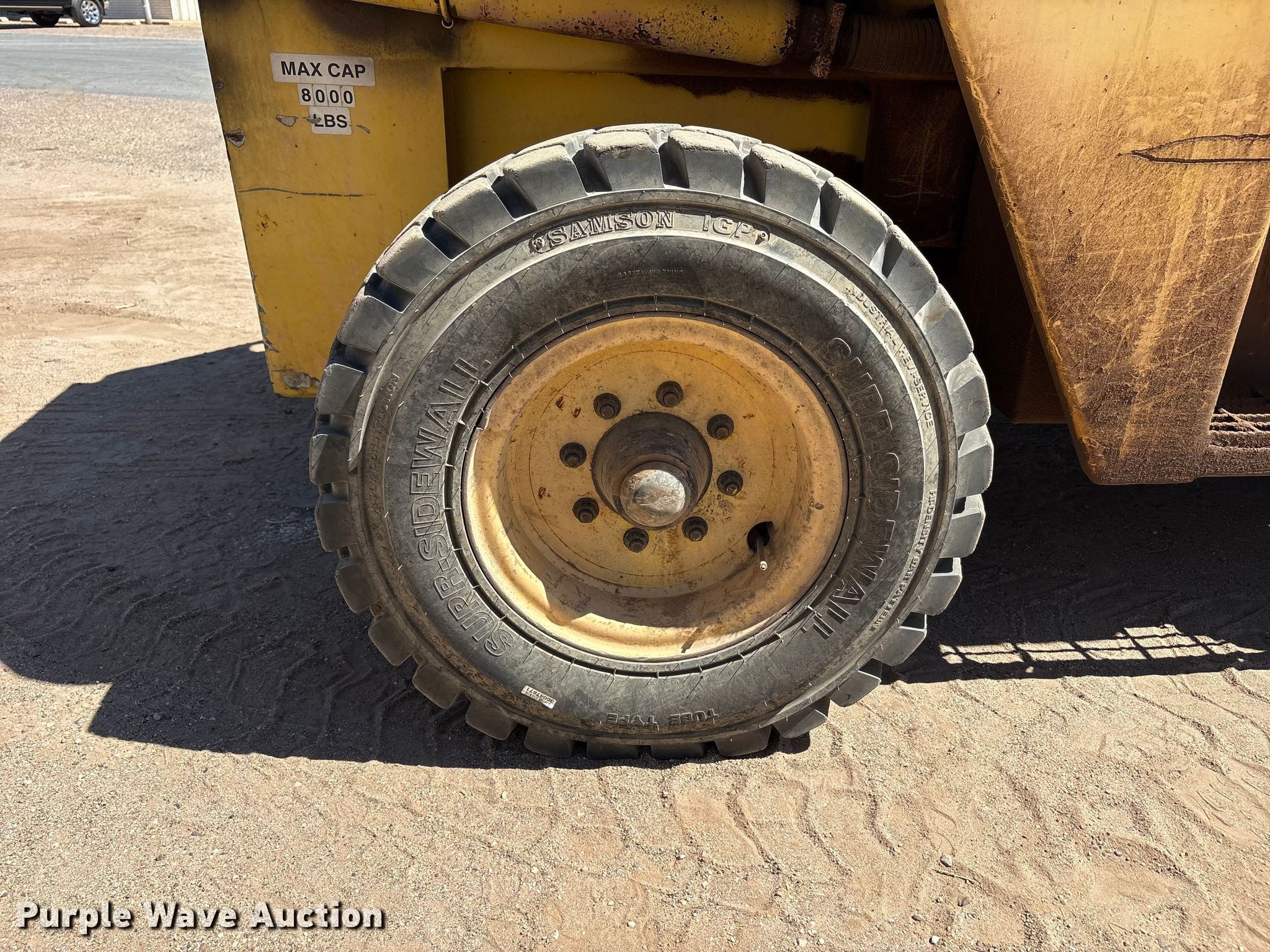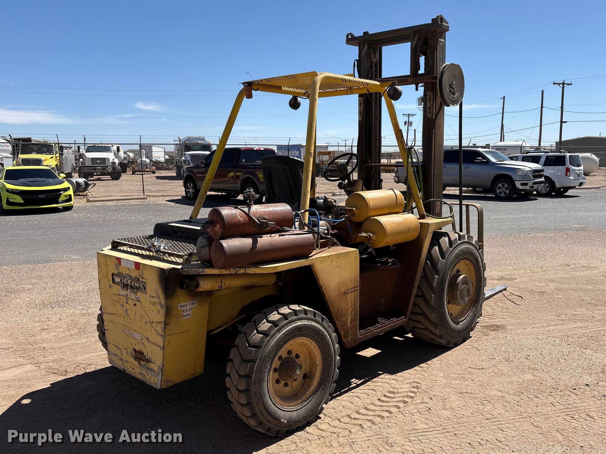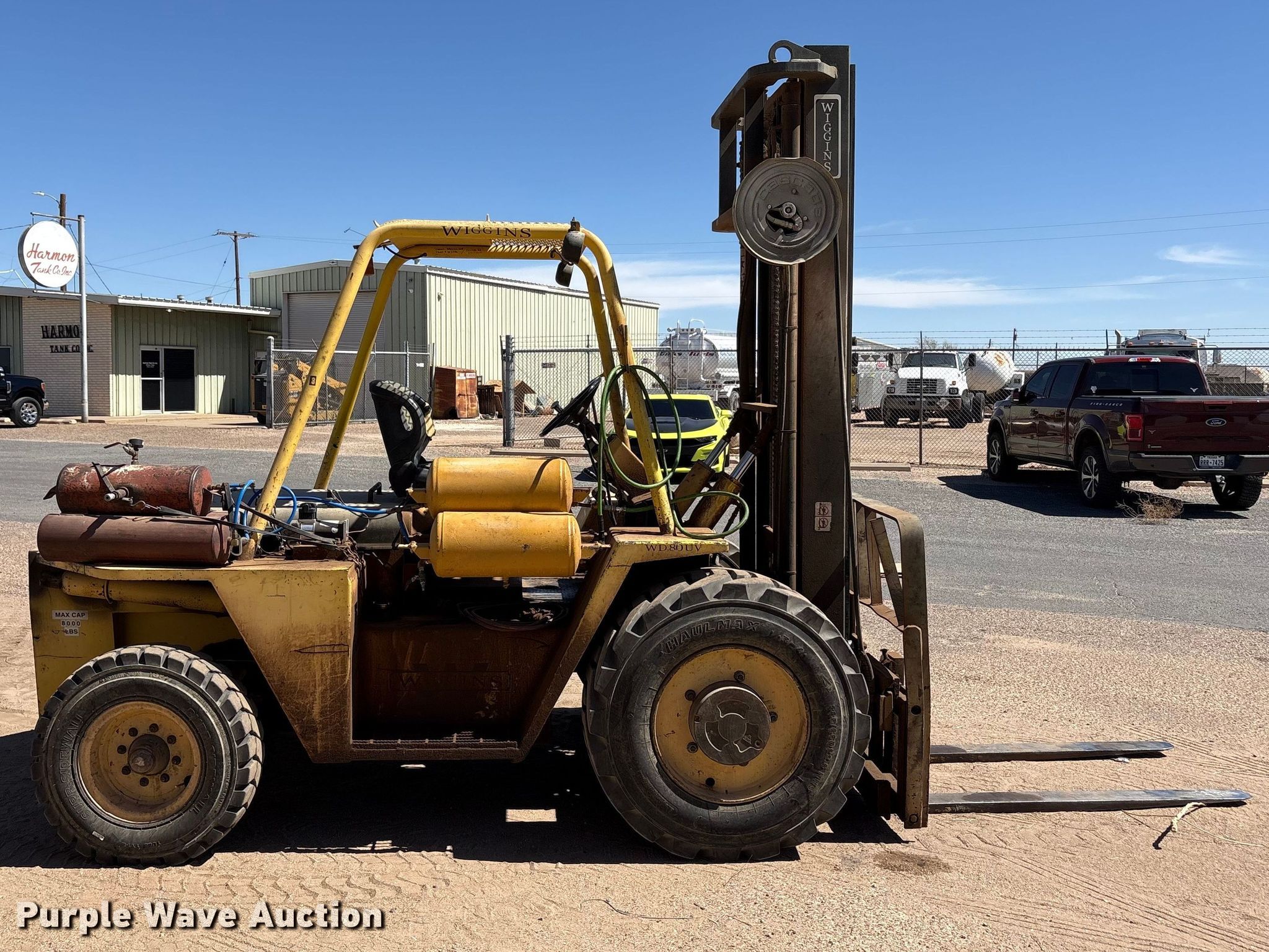 1997 Wiggins W84 VU forklift. Hours: 3,650 on meter, Serial: 97 8443. Engine Deutz, Cylinders: 4, Fuel type: Diesel. Transmission Automatic. Features Maximum lift capacity: 8,000 lbs, Collapsed mast height: 122", Mast stages: 2, Side shift, Mast tilt, Fork length: 60". Tires Front: 385/65D22.5, Rear: 825x15HNS. Harmon Tank Company Inc. Lubbock, TX 79403