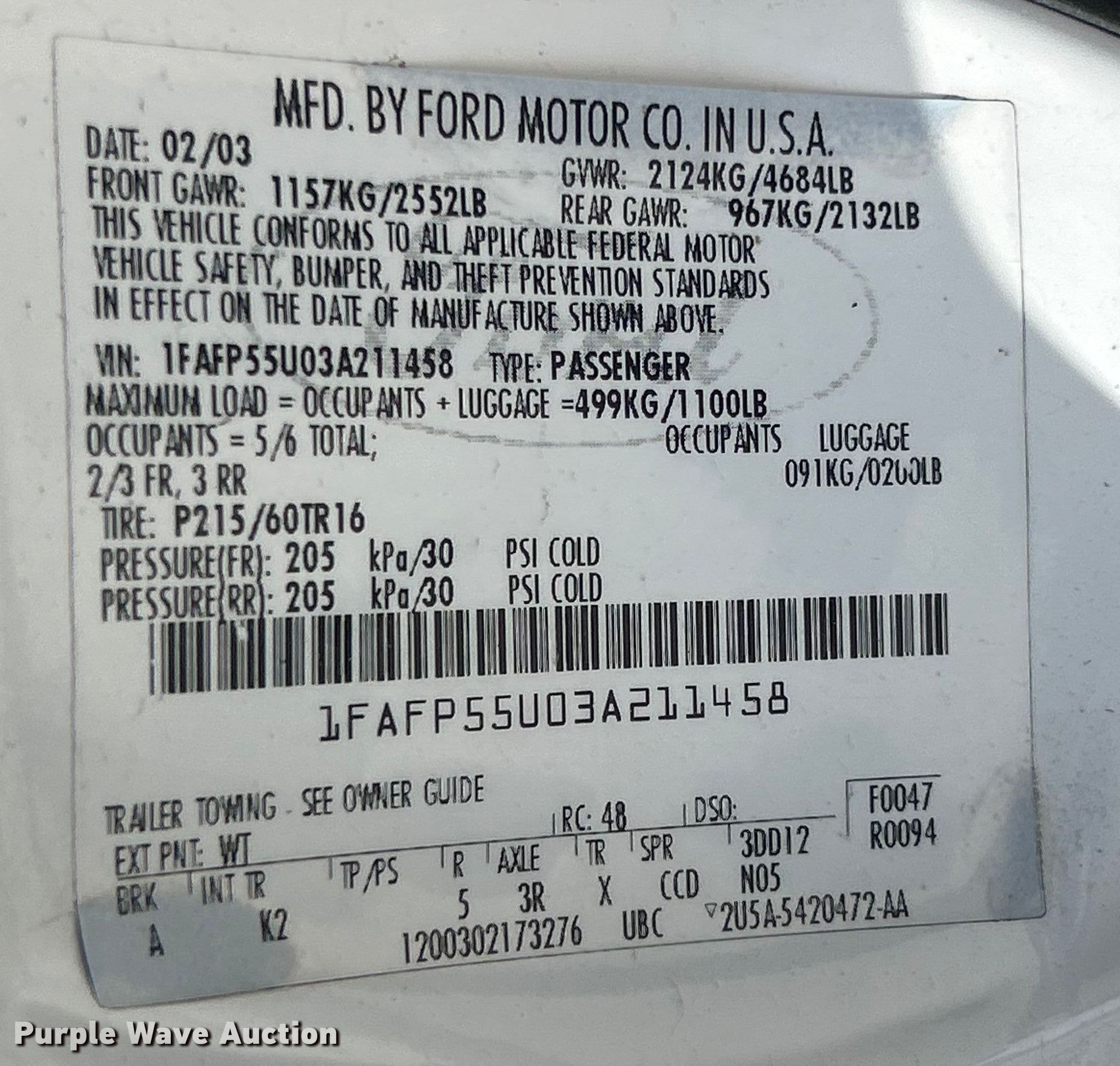 - VIN: 1FAFP55U03A211458