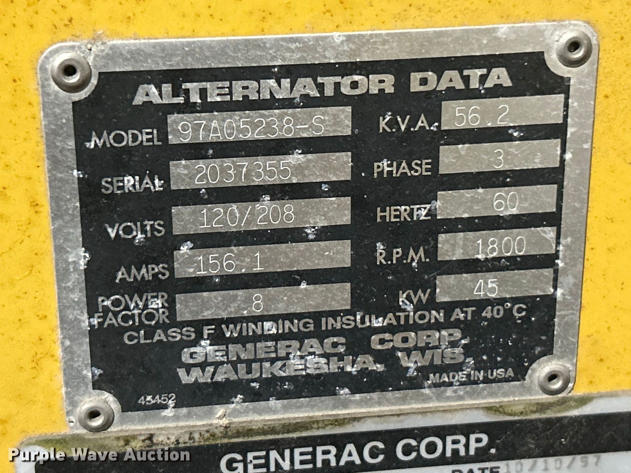 Generac 97A05238-S generator. Hours: 101 on meter, Serial: 2037355. Engine Cylinders: 8, Fuel type: LPG. Features Generator Generac Corp, kVA: 56, kW: 45, Phase: Three, Generac transfer switch Volts: 120/240v. Bridgeton, MO 63044
