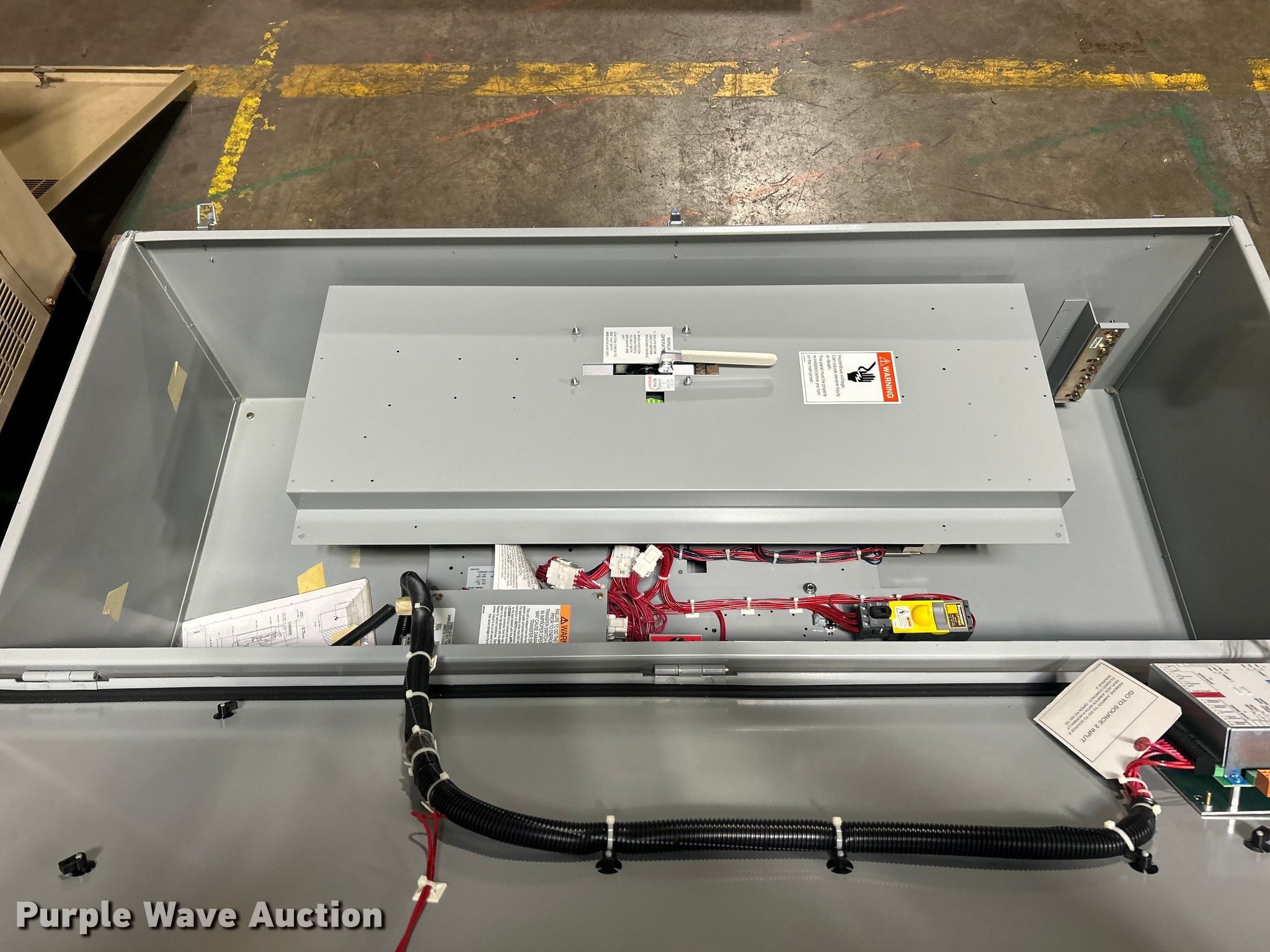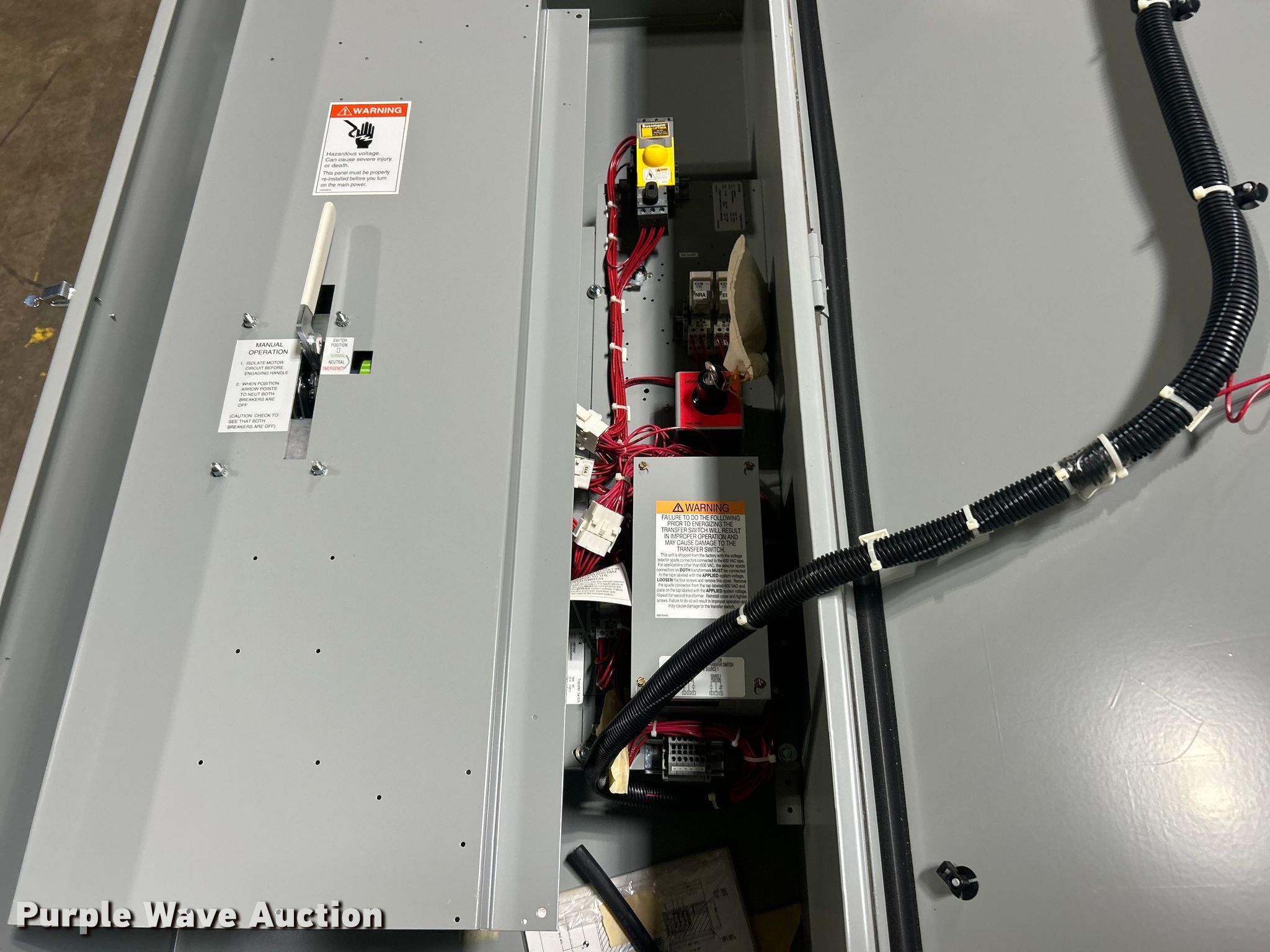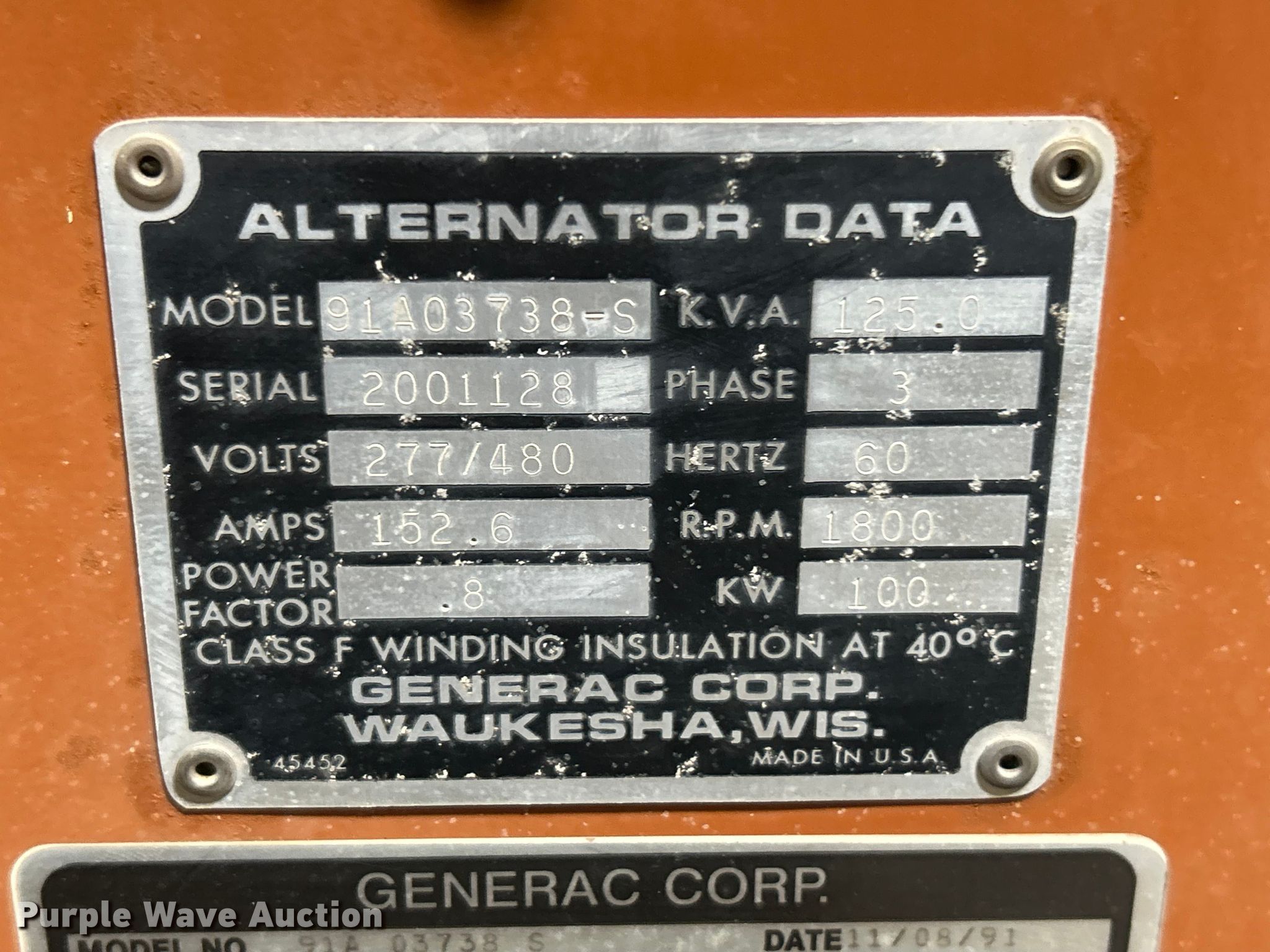 Generac Corp 91A03738-S generator. Hours: 96 on meter, Serial: 2001128. Engine Generac, Displacement: 7.4L, Cylinders: 8, Fuel type: LPG. Features Generator Generac Corp, kVA: 125, kW: 100, Phase: Three, Eaton transfer switch Phases: three, Volts: 100/600. Bridgeton, MO 63044