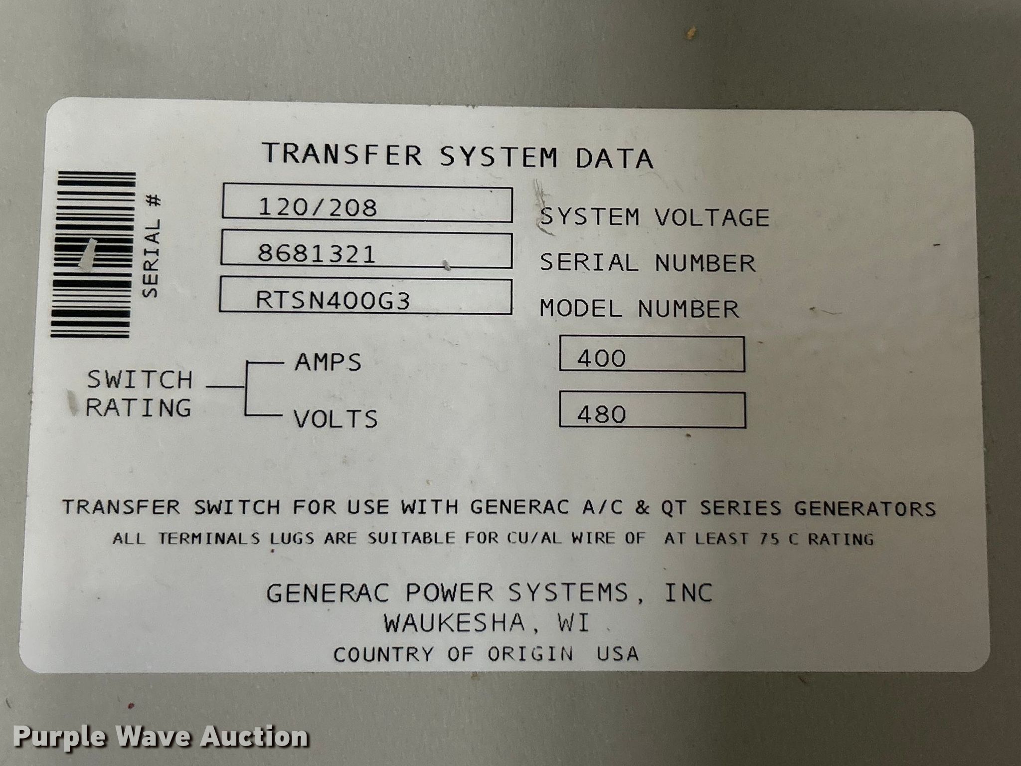 Purple Wave is selling a used Building Materials in Missouri. This item is a Generac transfer switch with the following: Volts: 120/208, Serial: 8681321
