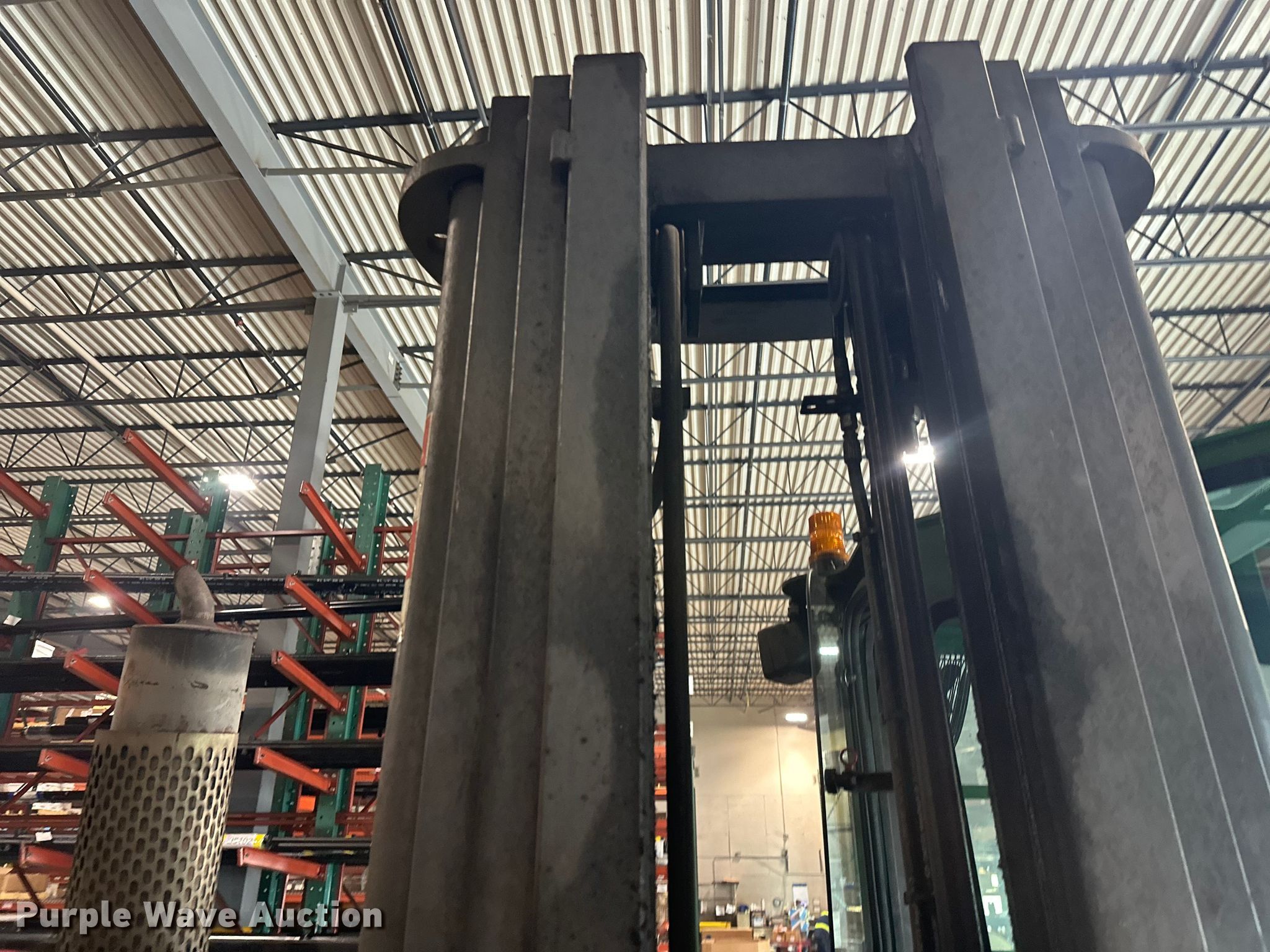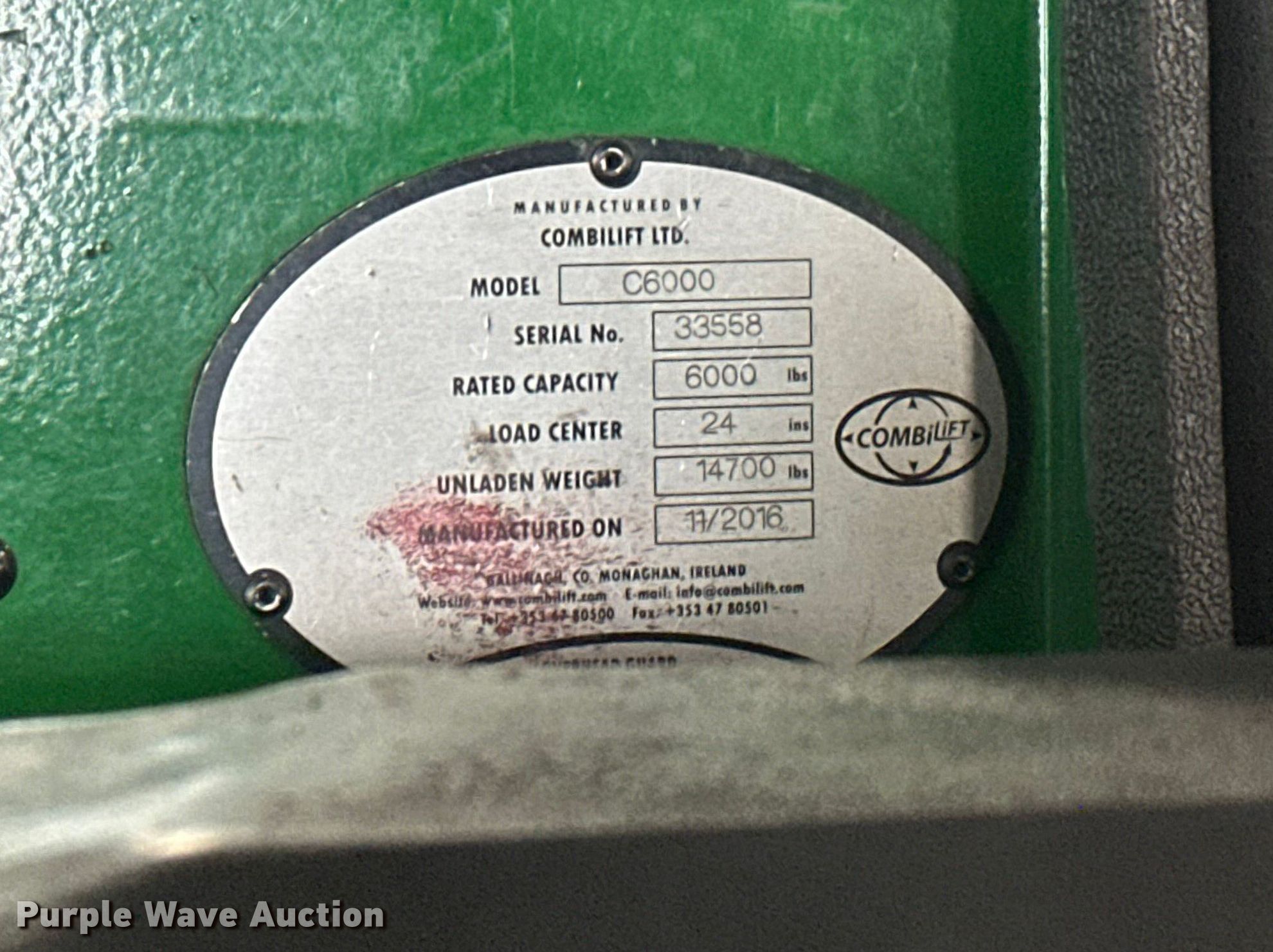 2016 CombiLift C6000 forklift. Hours: 7,418 on meter, Serial: 33558, Unit #: SFS3114. Engine Cylinders: 4, Fuel type: LPG LP bottle: Not included. Transmission Automatic. Operators station OROPS. Features Maximum lift capacity: 6,000 lbs, Maximum lift height: 240", Collapsed mast height: 110", Mast stages: 3, Side shift, Mast tilt, Fork positioner, Reach / retract, Fork length: 46". Tires Front: 200/50-10, Rear: 27x10-12, Solid. Ferguson. Brooklyn Center, MN 55429