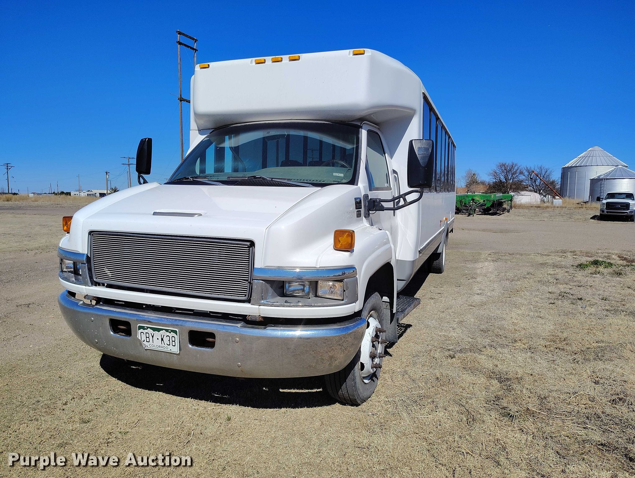 2007 Chevrolet C5500 shuttle bus. Miles: 376,377 on odometer, VIN: 1GBE5V1967F421167. Engine Displacement: 6.6L, Cylinders: 8, Fuel type: Diesel. Transmission Automatic. Chassis Axles: Single, Suspension: Spring, Brakes: Hydraulic, GVWR: 19,500 lbs. Interior AC, Heat, Cruise control, Electric passenger sliding door, Passengers: 20. Tires Size: 245/75R19.5. Notes Unknown operating condition of sliding door. Colorado title. Title distribution may be delayed up to 14 days from verification of funds. Sanders Farms. Sheridan Lake, CO 81071