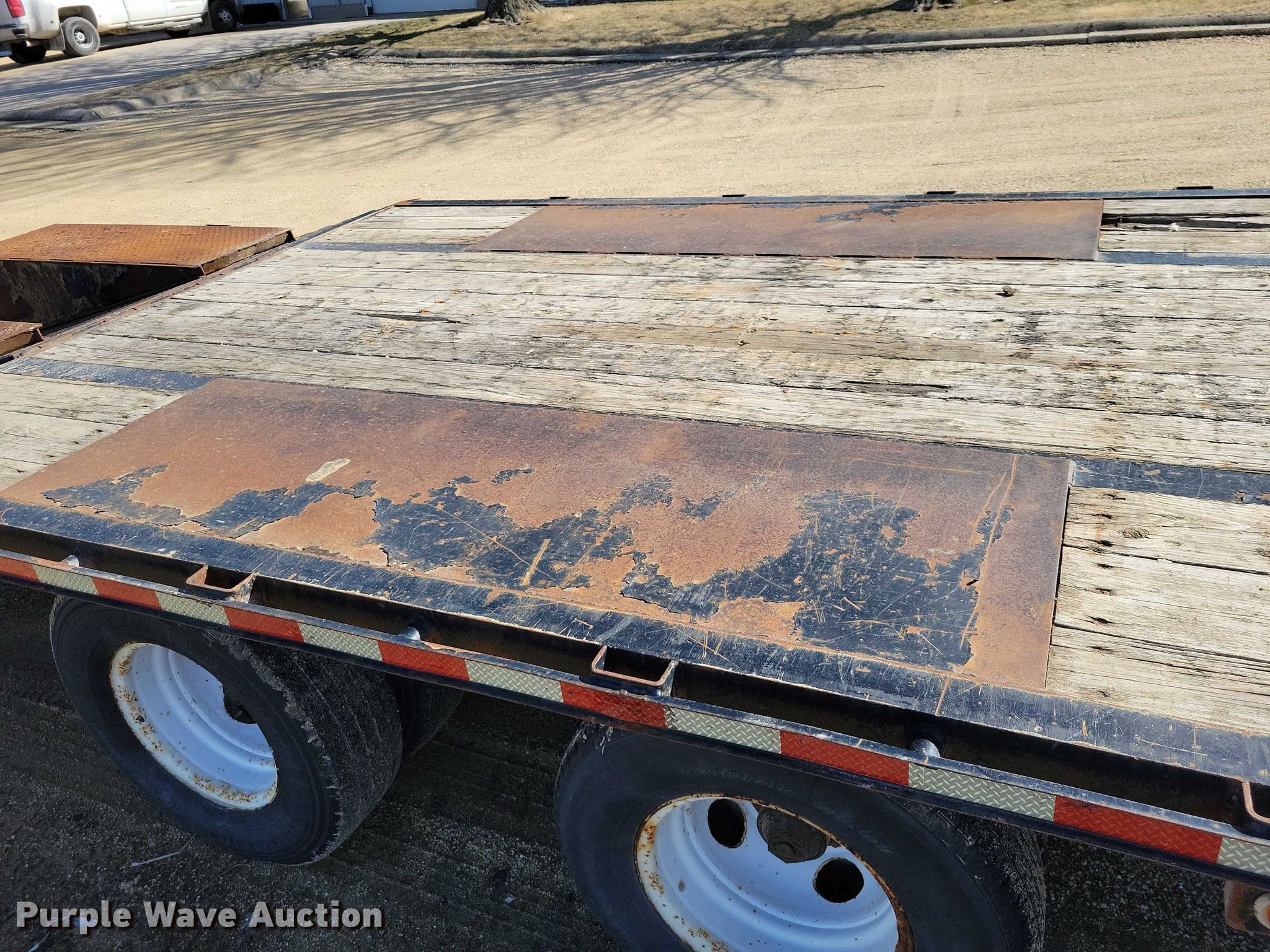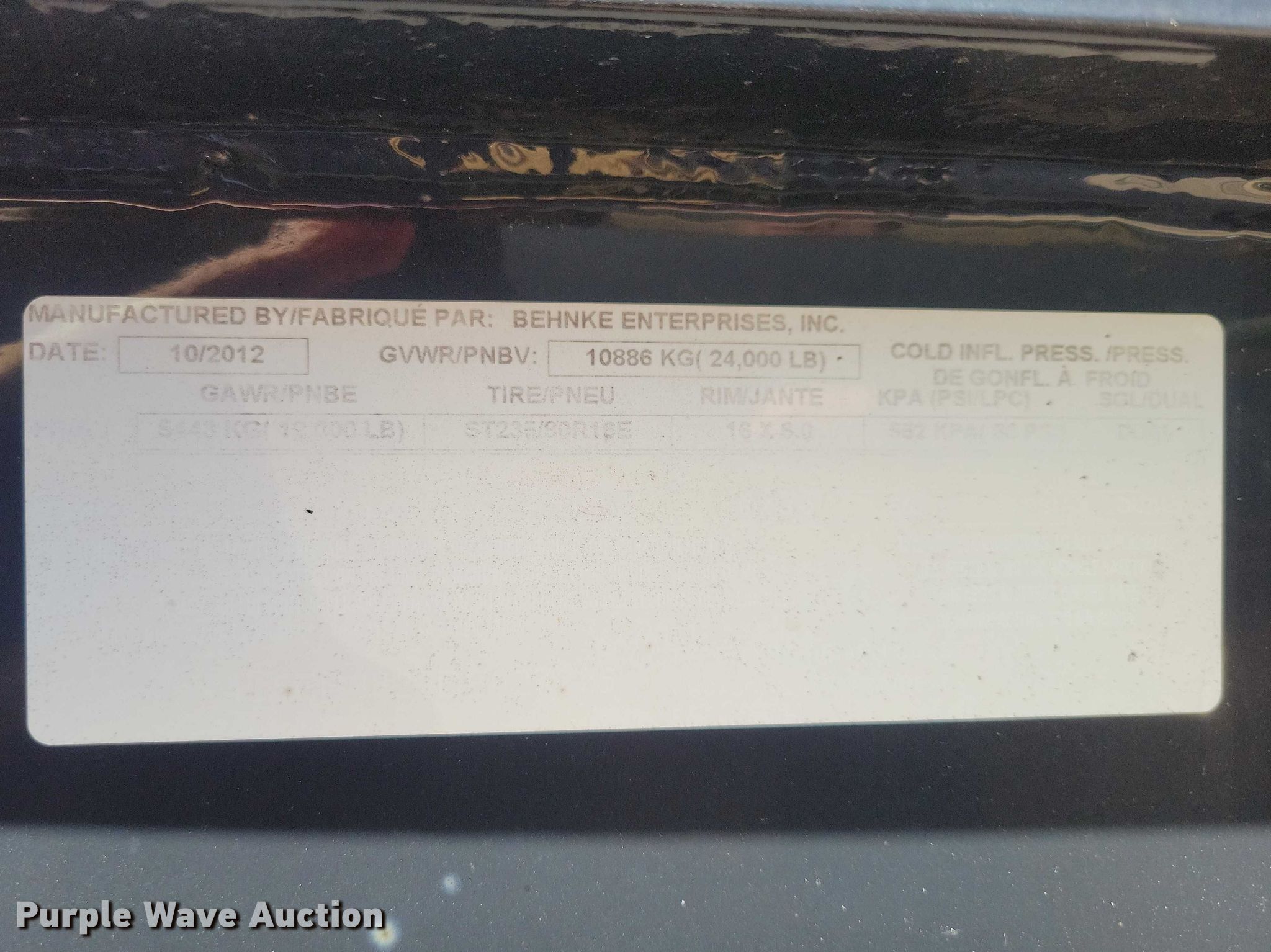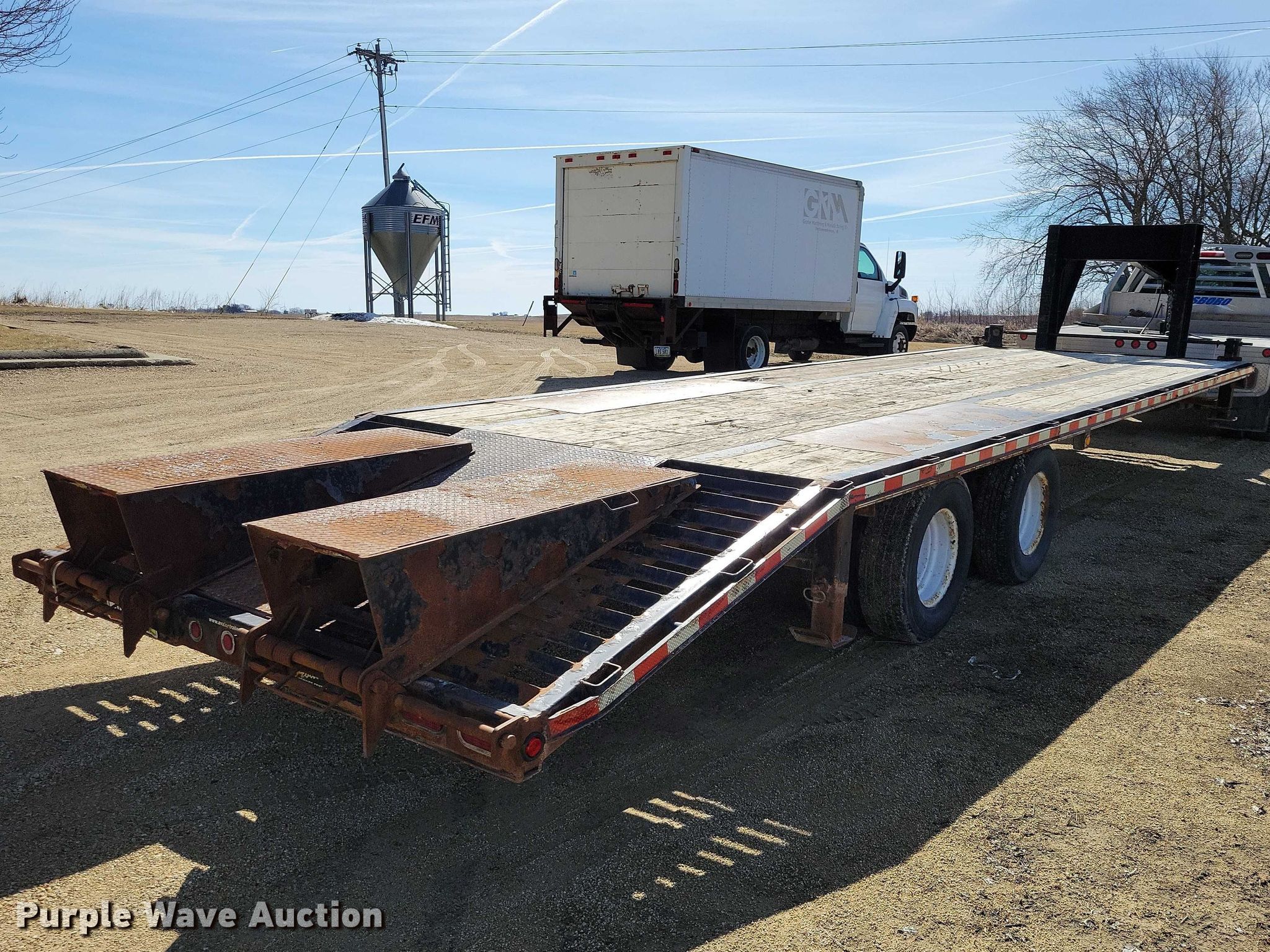 2013 Behnke equipment trailer. VIN: 4L5FB3822DF027225. Dimensions Overall Length: 38', Width: 102", Deck Length: 25', Deck height: 34", Tail length: 5', Ramps: Manual Length: 5'. Features Deck type: Wood. Chassis Hitch: Gooseneck, Landing gear: Dual, Suspension: Spring, Brakes: Electric, Axles: Tandem, GVWR: 24,000 lbs, GAWR: 12,000 lbs. Tires Steel wheels, Size: ST235/80R16. Notes Truck not included. Iowa title. Title distribution may be delayed up to 30 days from verification of funds. EFM Construction. Strawberry Point, IA 52076