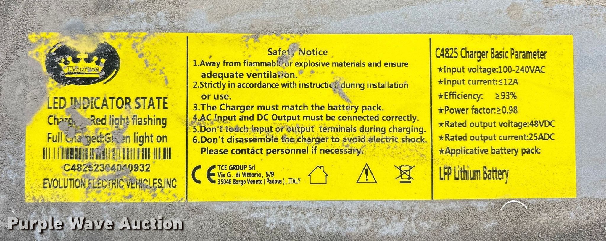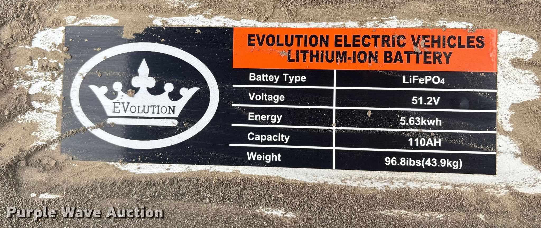 Evolution Lithium LifePO4 golf cart. Hours: Unknown, Serial: 202332197, Unit #: 77004454. Electric Motor Volts: 51.2. Transmission Automatic. Operators station Canopy. Tires Size: 215/35R14. Notes Dead battery, Key not included, Non-operational unit. Repossessed item, stored at a secured facility. Please review REQUIRED REMOVAL INSTRUCTIONS. Lender Owned. Brookhaven, NY 11719
