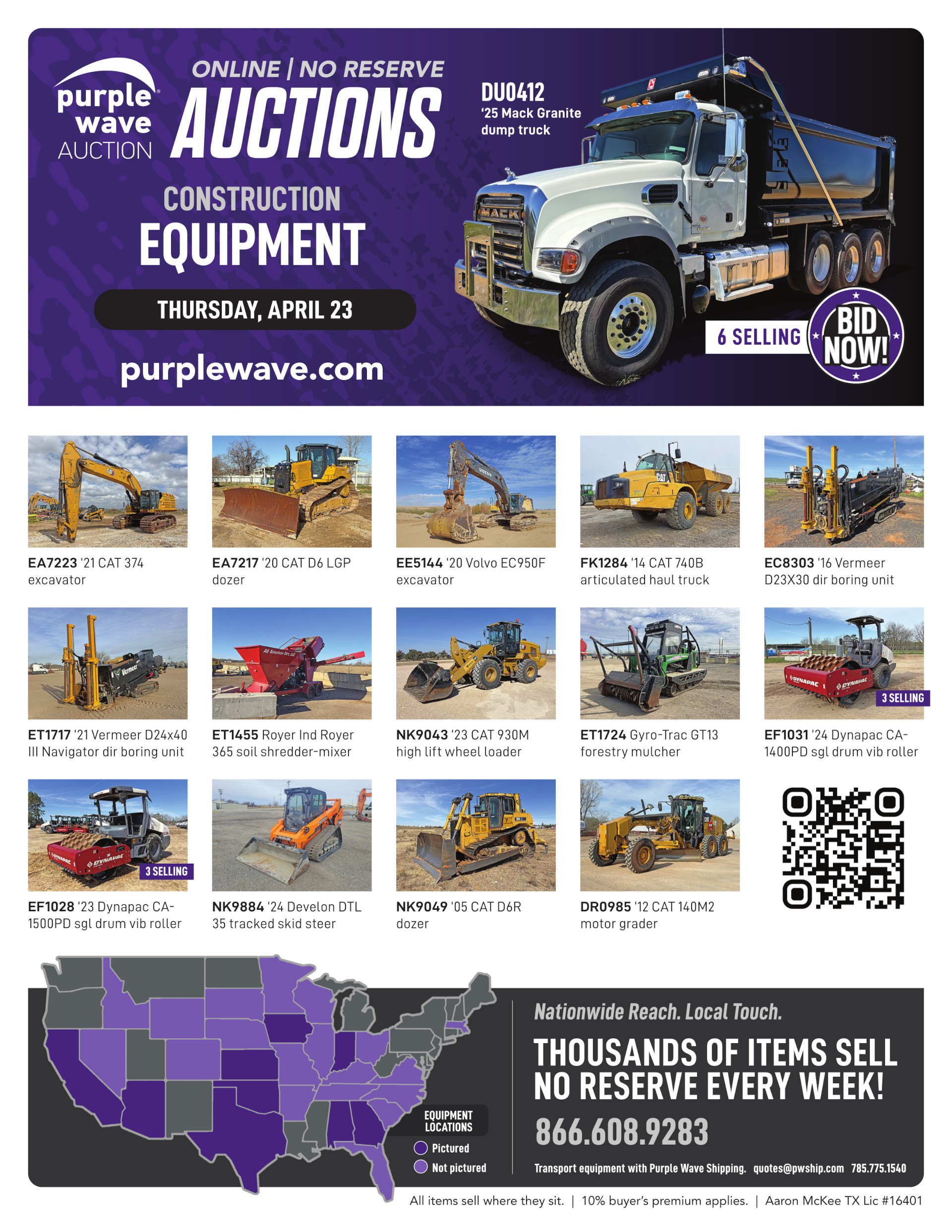 This auction is conducted by Purple Wave, Inc., whose home office is 825 Levee Drive, Manhattan, Kansas. Aaron McKee, Texas auctioneer license # 16401, operates Purple Wave, Inc. Complaints against us may be directed to the Texas Department of Licensing and Regulation, P.O. Box 12157, Austin, Texas 78711, (512) 463-6599. For additional required information, see the attached document.