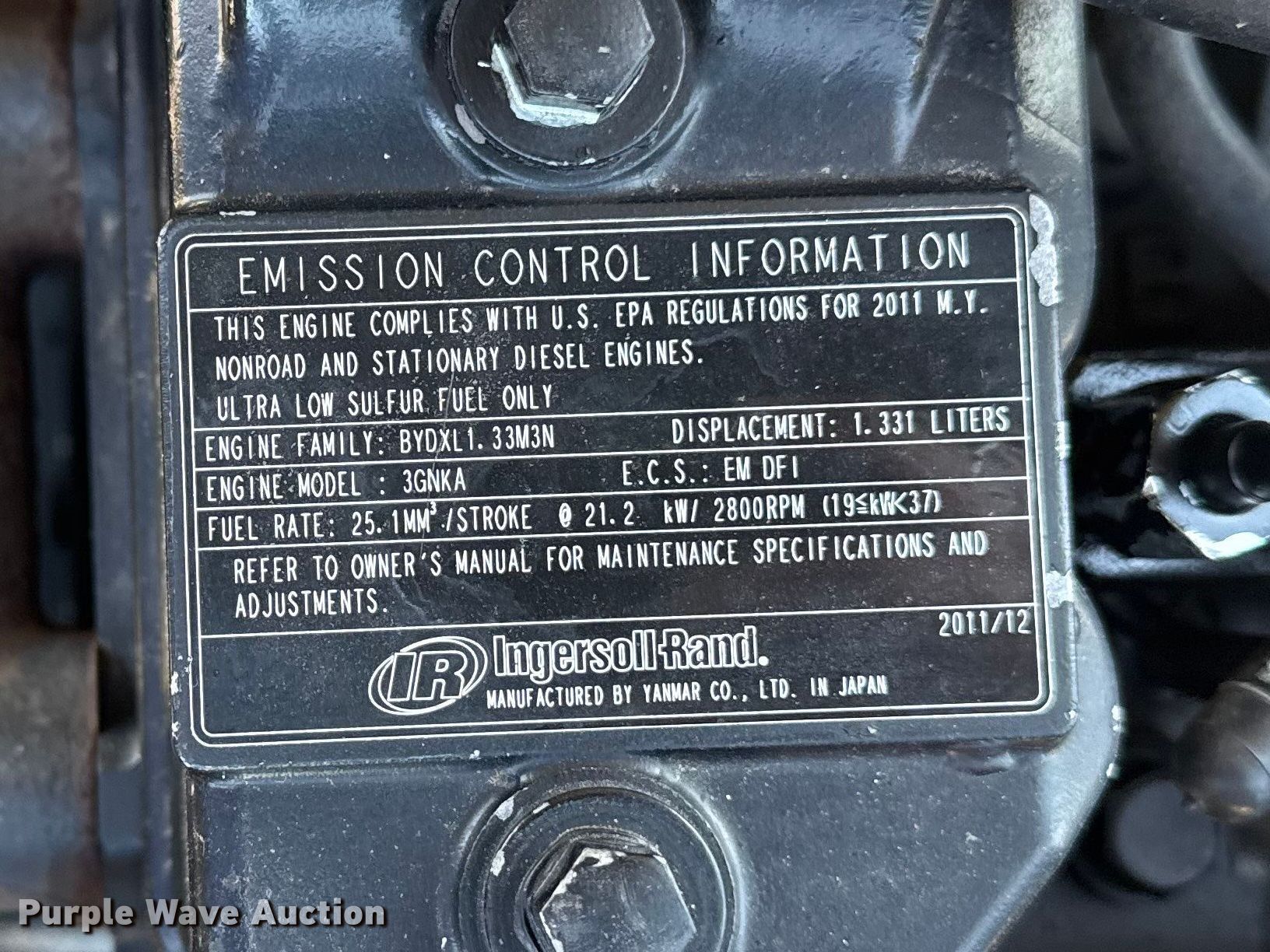 2012 Doosan P90BWIRU air compressor. Hours: 175 on meter, Serial: UN5P90UTMCY109125. Engine Ingersoll Rand 3GNKA, Displacement: 1.331L, Cylinders: 3, Fuel type: Diesel. Collinsville, OK 74021