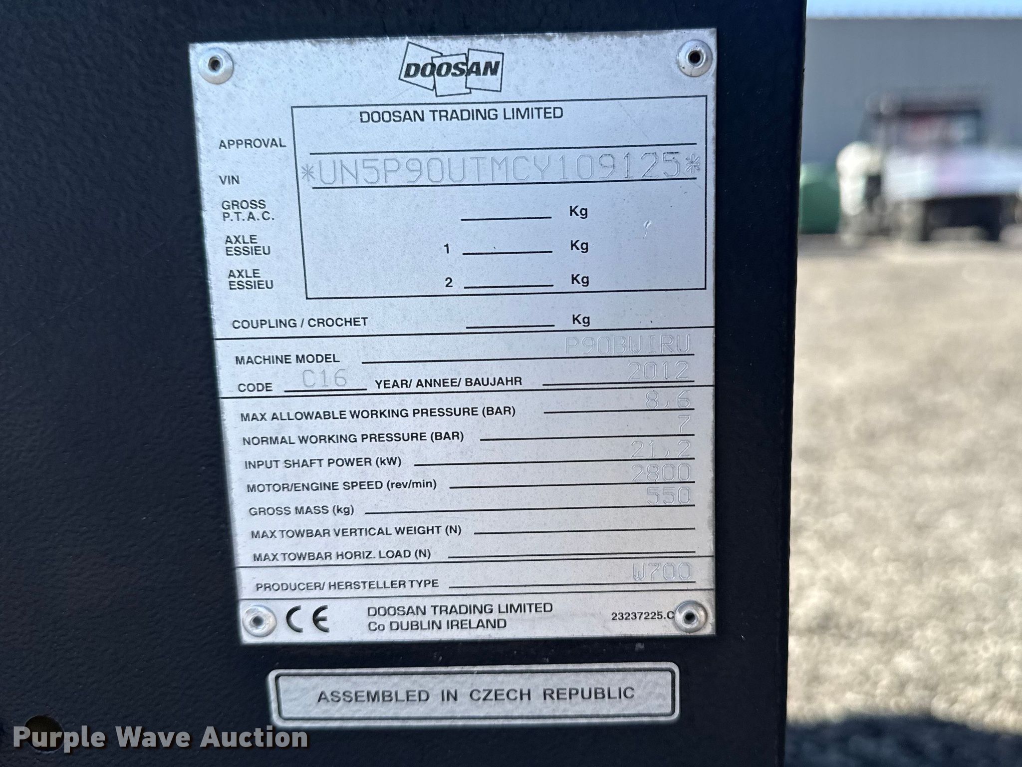 Purple Wave is selling a used Air Compressor in Oklahoma. This item is a 2012 Doosan P90BWIRU air compressor with the following: Hours: 175 on meter, Serial: UN5P90UTMCY109125