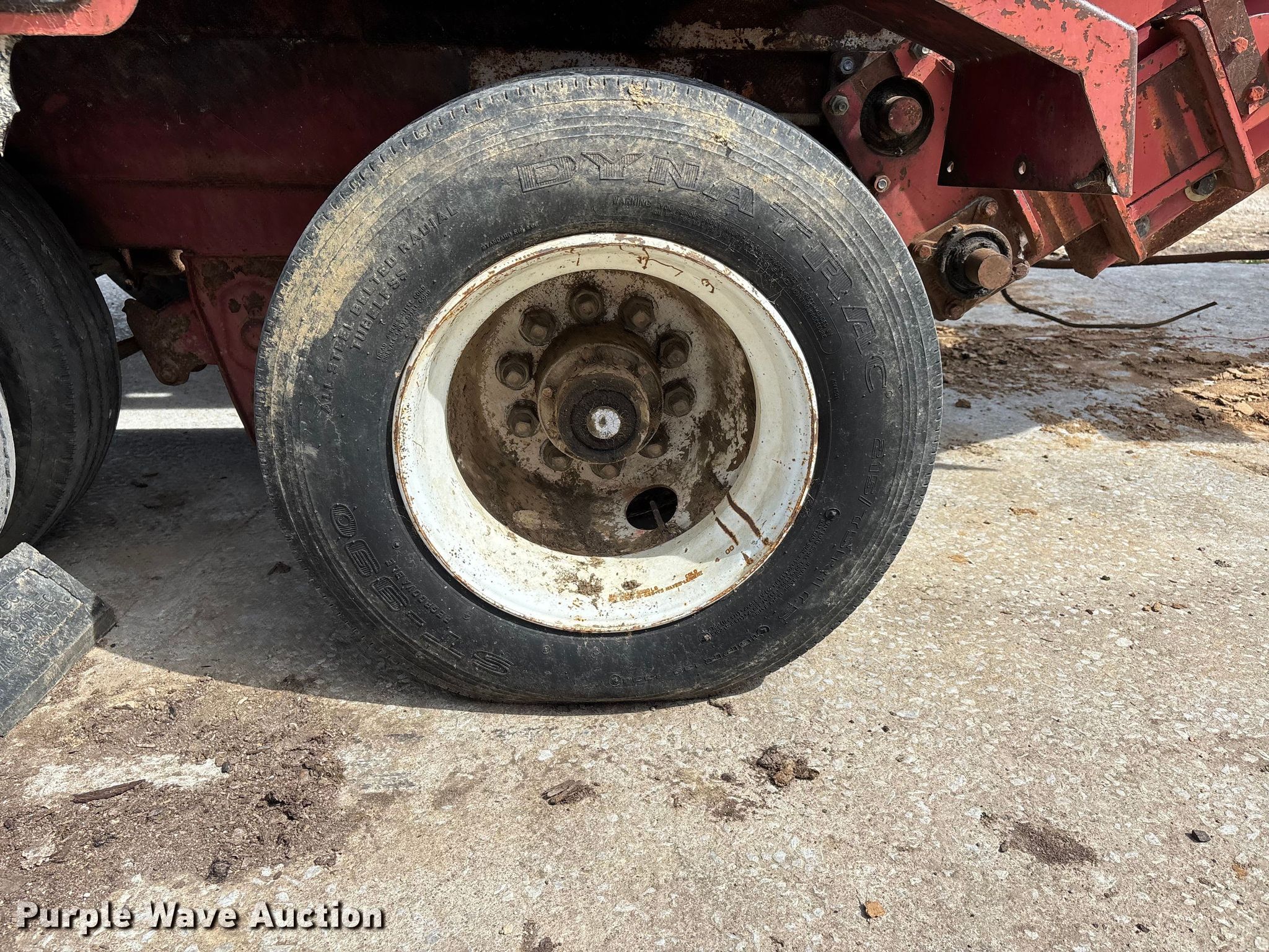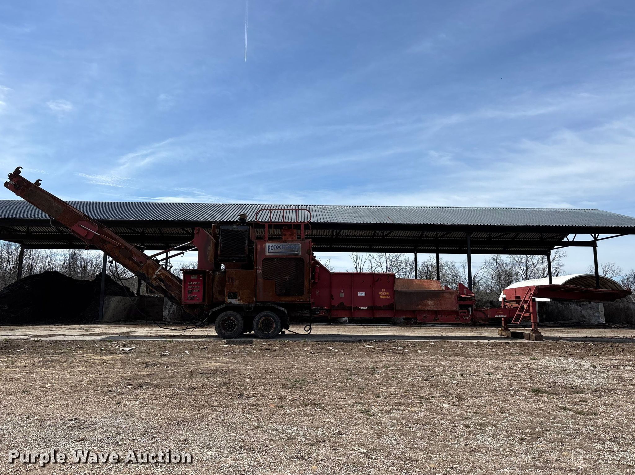 Rotochopper MC 156 horizontal grinder. Hours: Unknown. Dimensions Overall Length: 49', Width: 8' 3", Height: 12'. Features Conveyor approx. dimensions: 18' L x 55" W, Feed drum: 55", Unloading conveyor: 20' L, Belt missing. Tires Size: 215/75R17.5. Notes Fire damage , Right front dual missing oil cap, Unit must be hauled , Non-operational unit. Geringer Construction LLC. Perryville, MO 63775