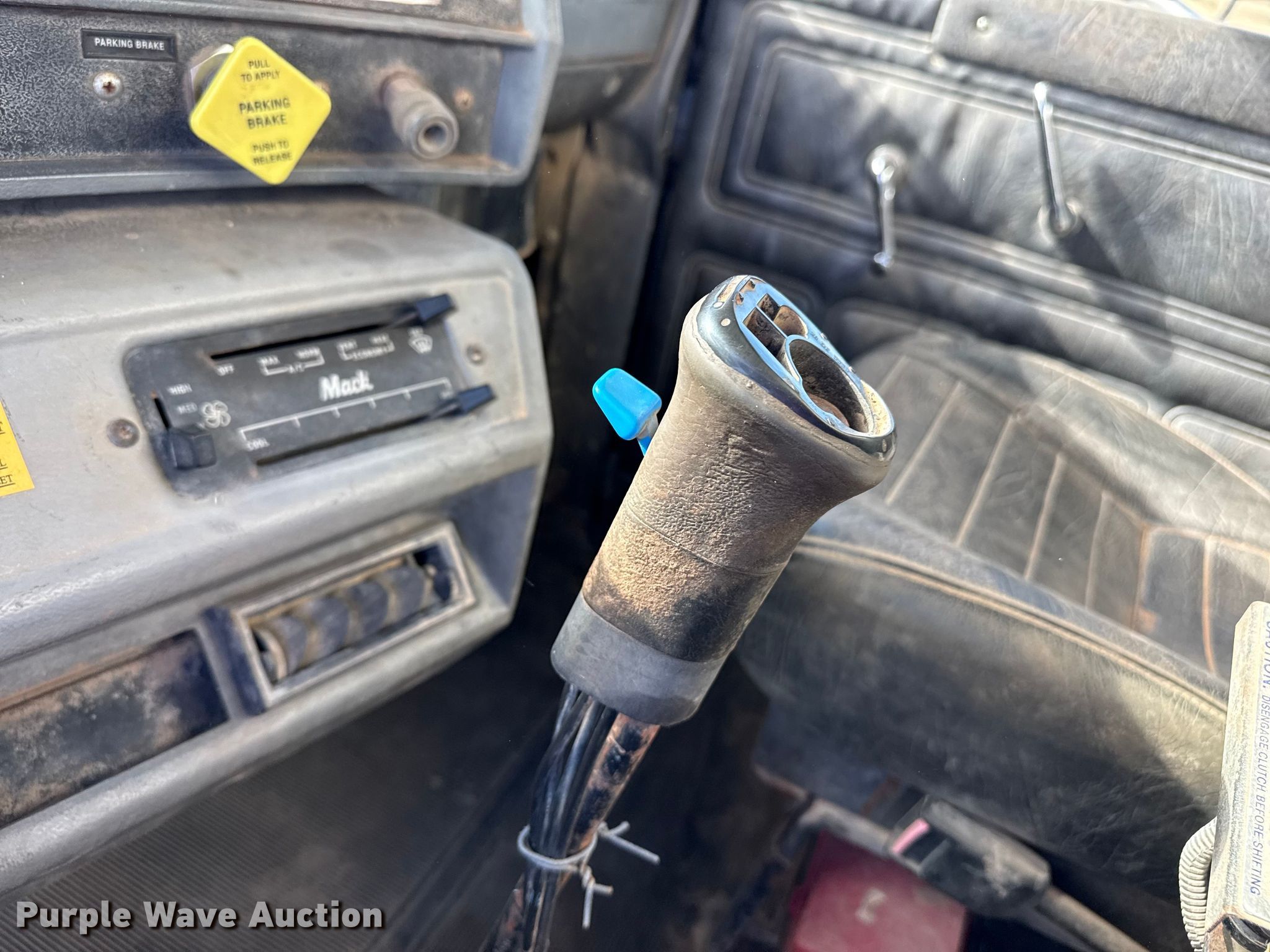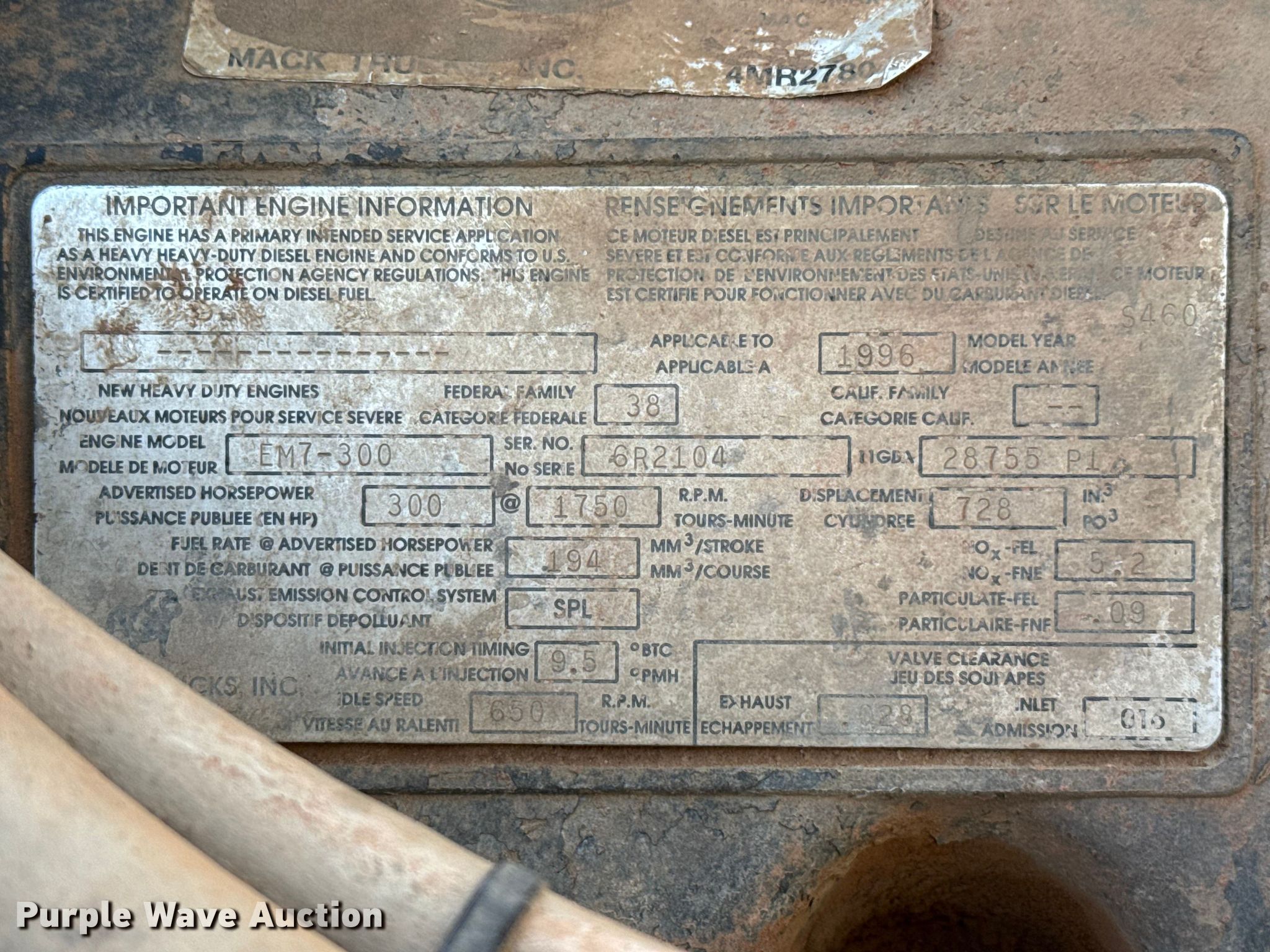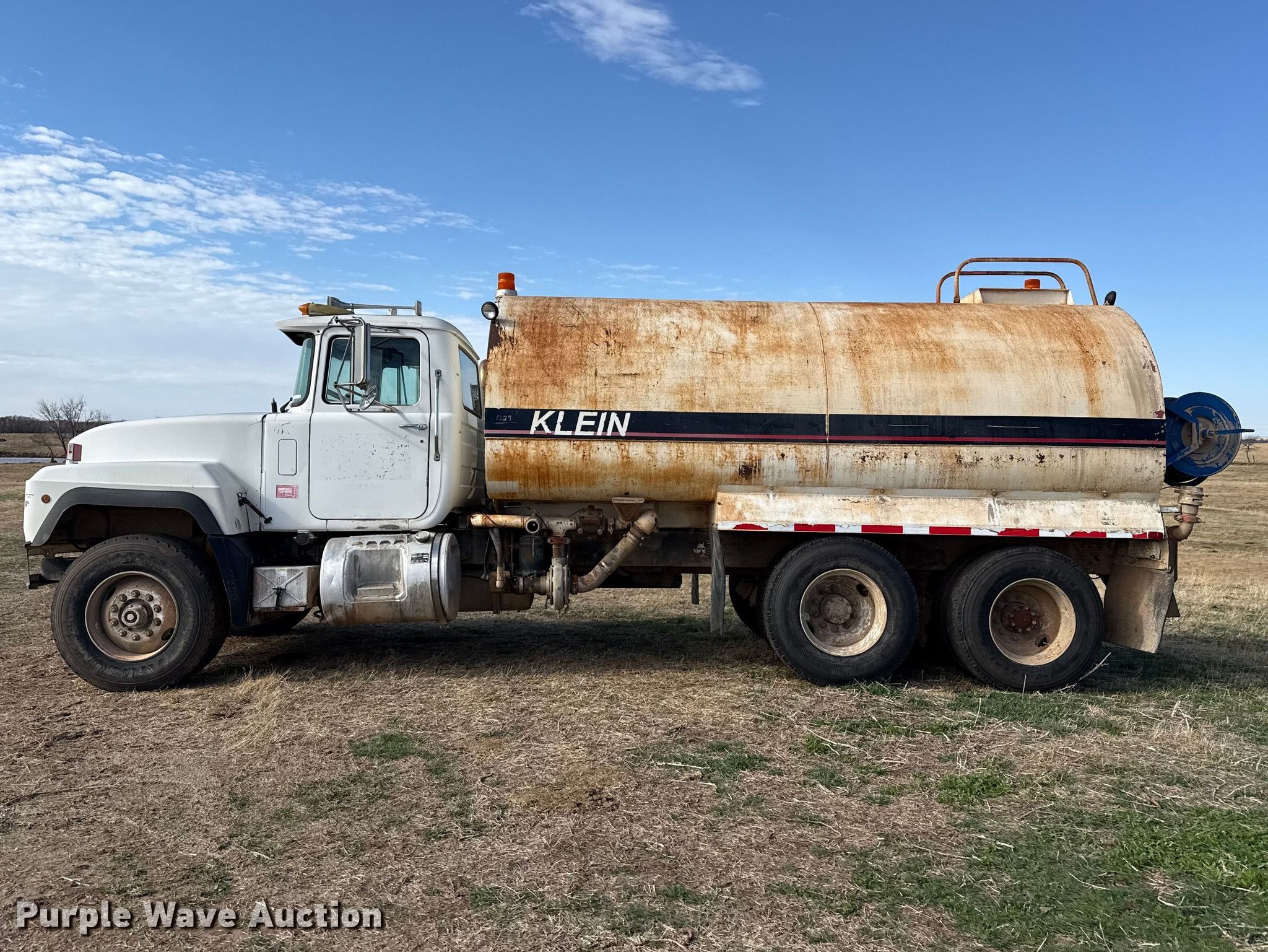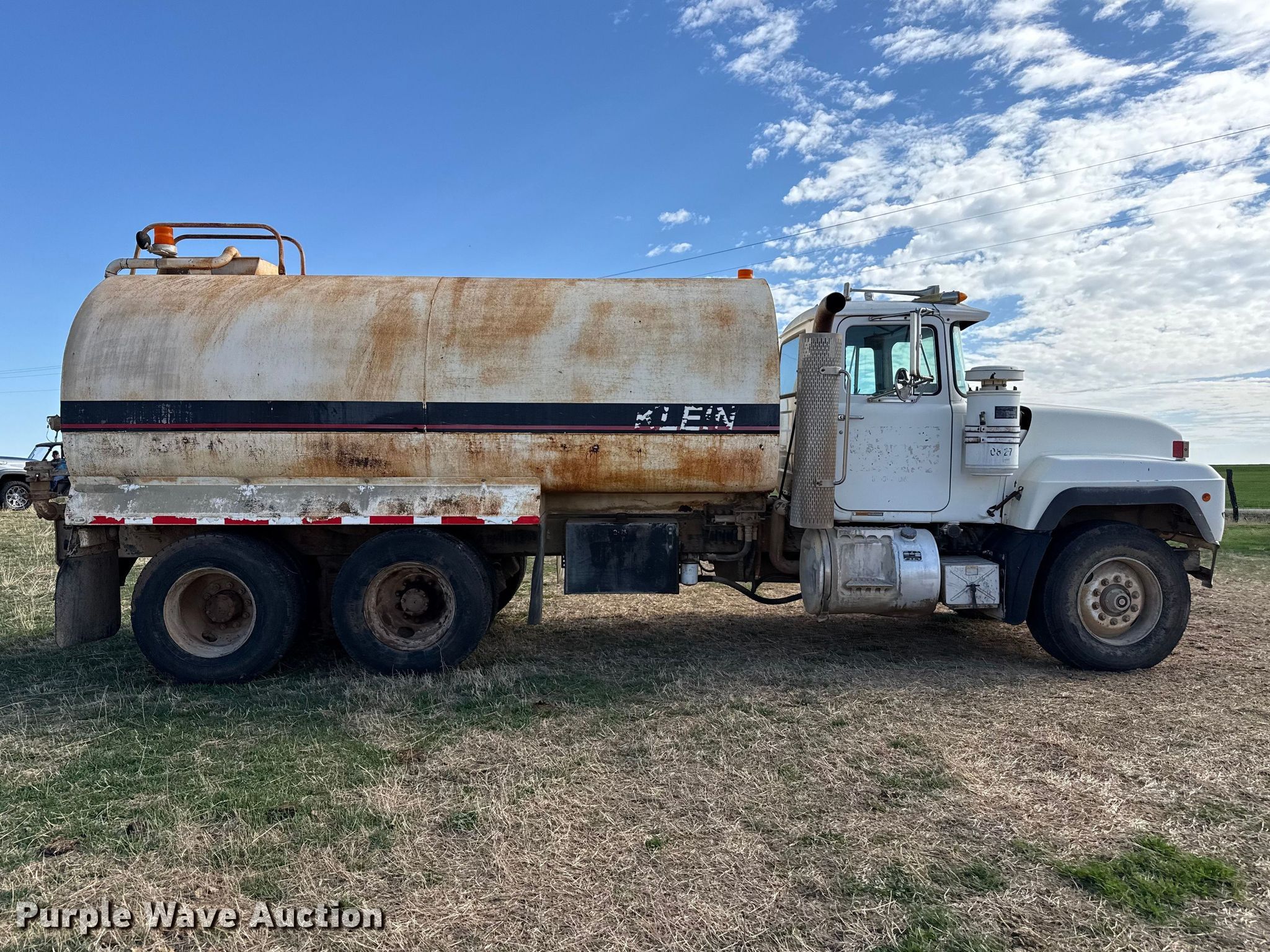 1997 Mack RD690S water truck. Miles: 394,051 on odometer, Hours: 25,956 on meter, VIN: 1M2P264C9VM023031. Engine Mack EM7-300, Serial: 6R2104, Displacement: 11.9L, Cylinders: 6, Fuel type: Diesel. Transmission Mack Maxitorque, Manual, Speed: 7. Chassis Axles: Tandem, Differential lock: Inter-axle, Suspension: Camelback, Brakes: Air, PTO. Interior AC, Heat. Features Bed Tank bed, Klein, Length: 15' 3", Width: 96", Spray bar: Rear, Side discharge, Hose reel, Top fill, Rear drain: 3". Tires Front: 385/65R22.5, Rear: 11R22.5. Oklahoma classic title. Title distribution may be delayed up to 30 days from verification of funds. Shirley Farms. Alva, OK 73717