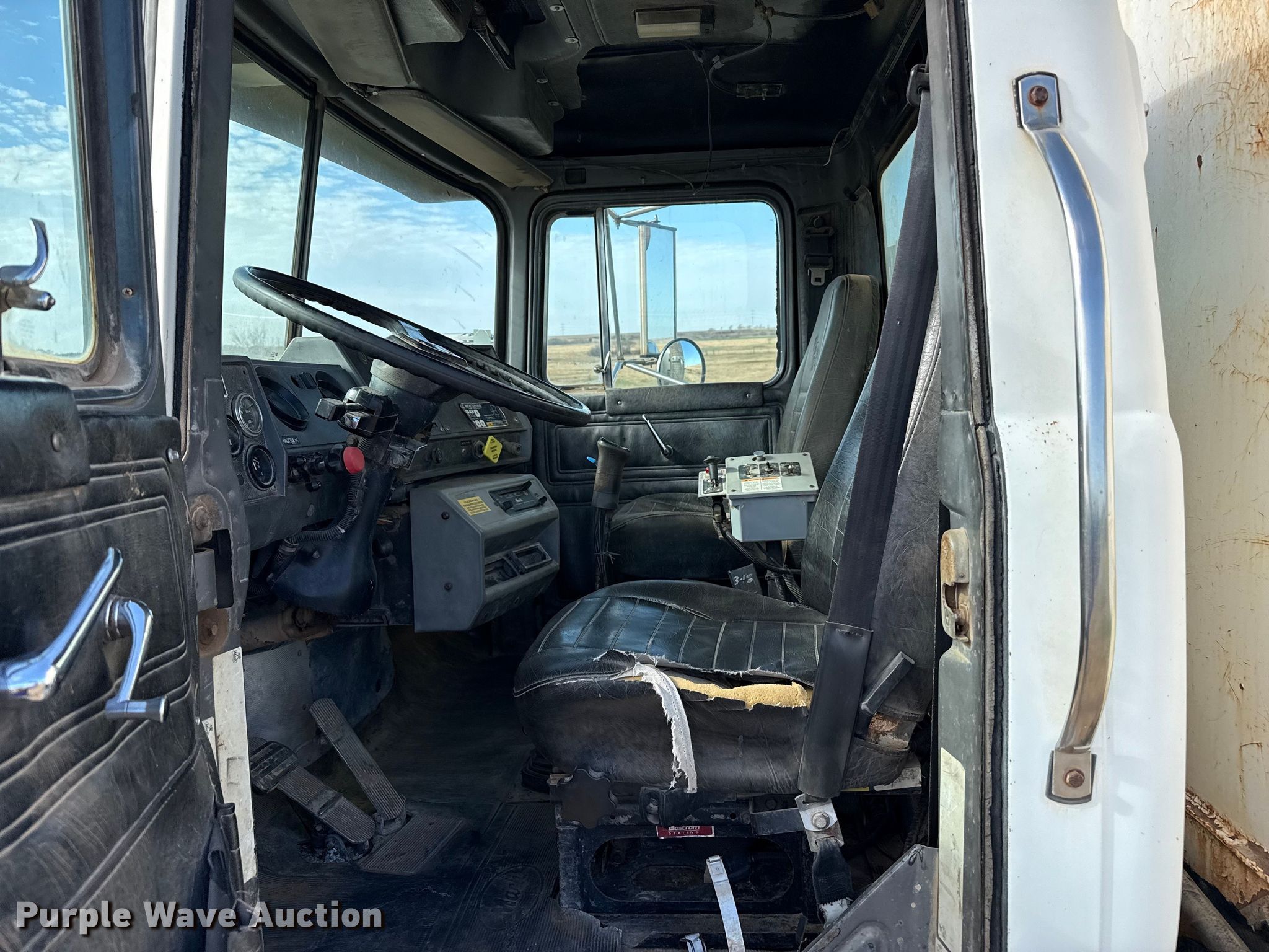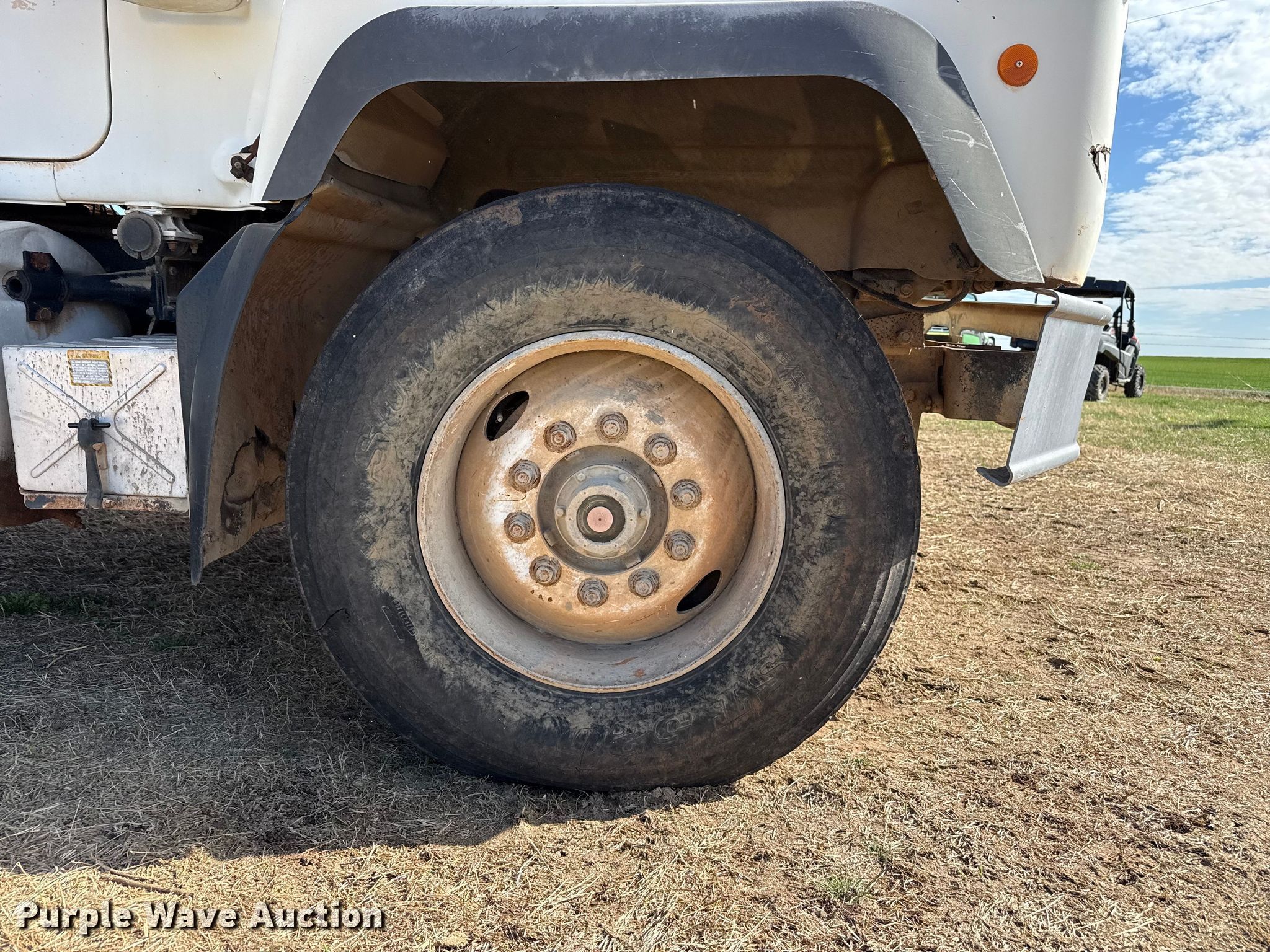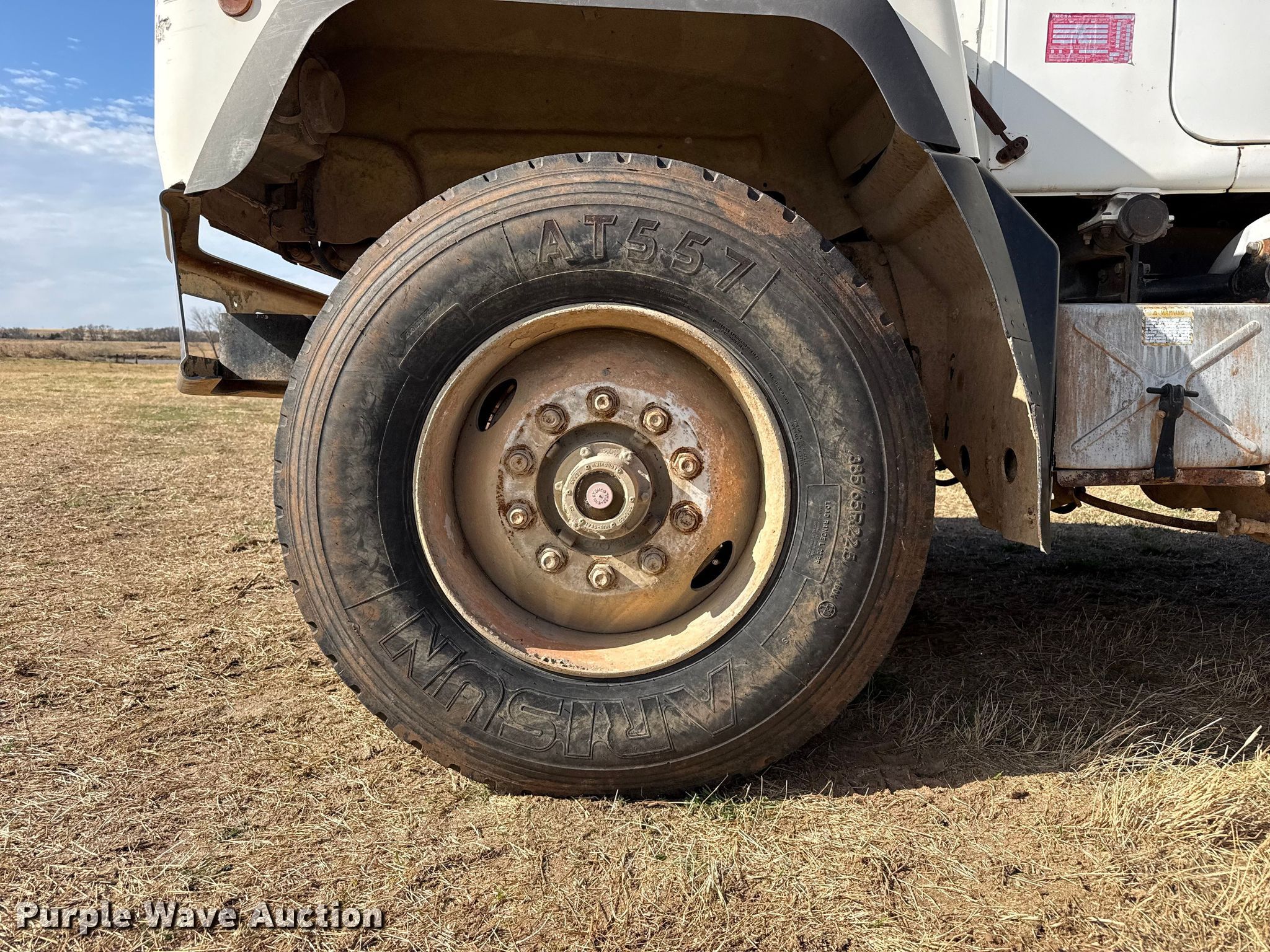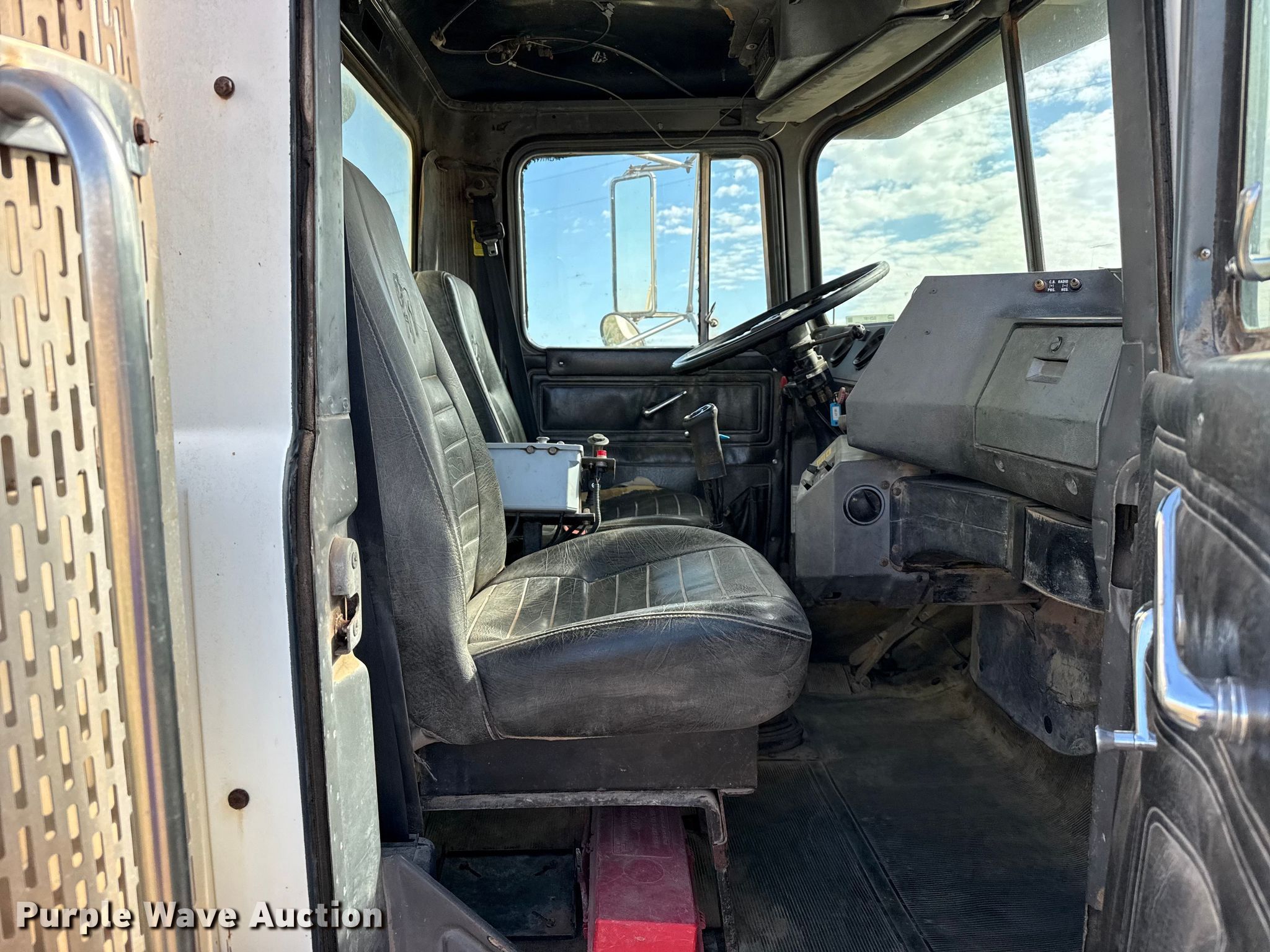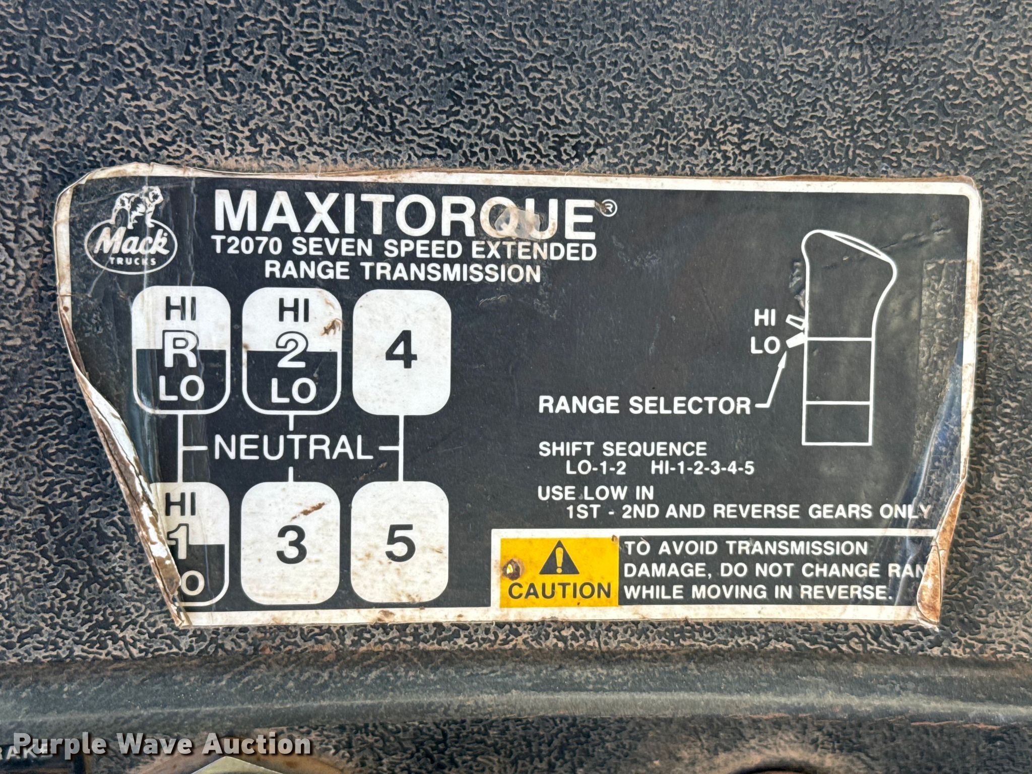1997 Mack RD690S water truck. Miles: 394,051 on odometer, Hours: 25,956 on meter, VIN: 1M2P264C9VM023031. Engine Mack EM7-300, Serial: 6R2104, Displacement: 11.9L, Cylinders: 6, Fuel type: Diesel. Transmission Mack Maxitorque, Manual, Speed: 7. Chassis Axles: Tandem, Differential lock: Inter-axle, Suspension: Camelback, Brakes: Air, PTO. Interior AC, Heat. Features Bed Tank bed, Klein, Length: 15' 3", Width: 96", Spray bar: Rear, Side discharge, Hose reel, Top fill, Rear drain: 3". Tires Front: 385/65R22.5, Rear: 11R22.5. Oklahoma classic title. Title distribution may be delayed up to 30 days from verification of funds. Shirley Farms. Alva, OK 73717
