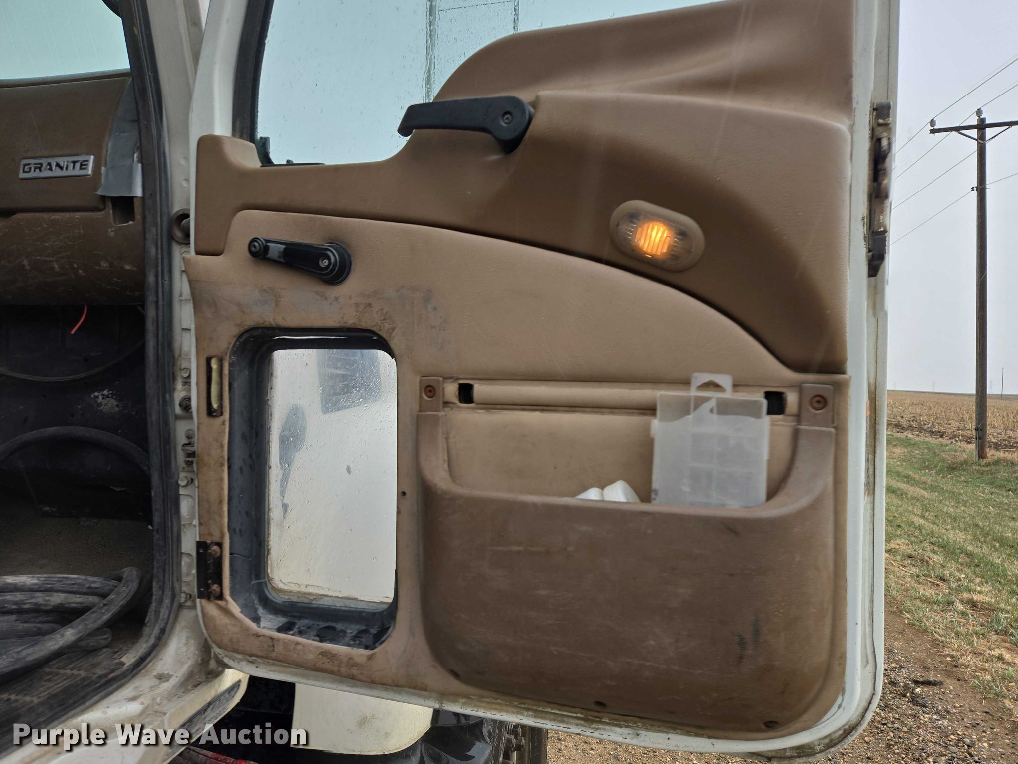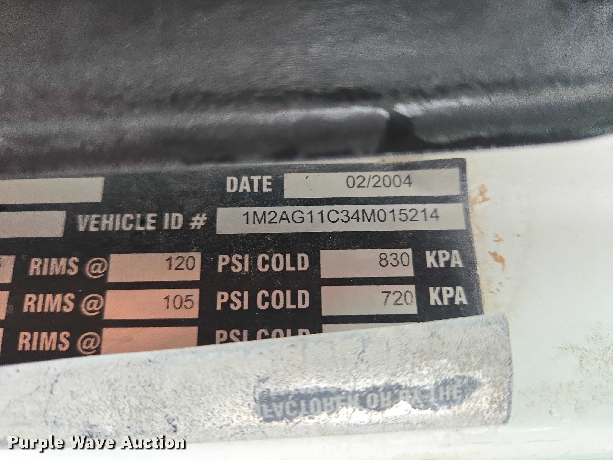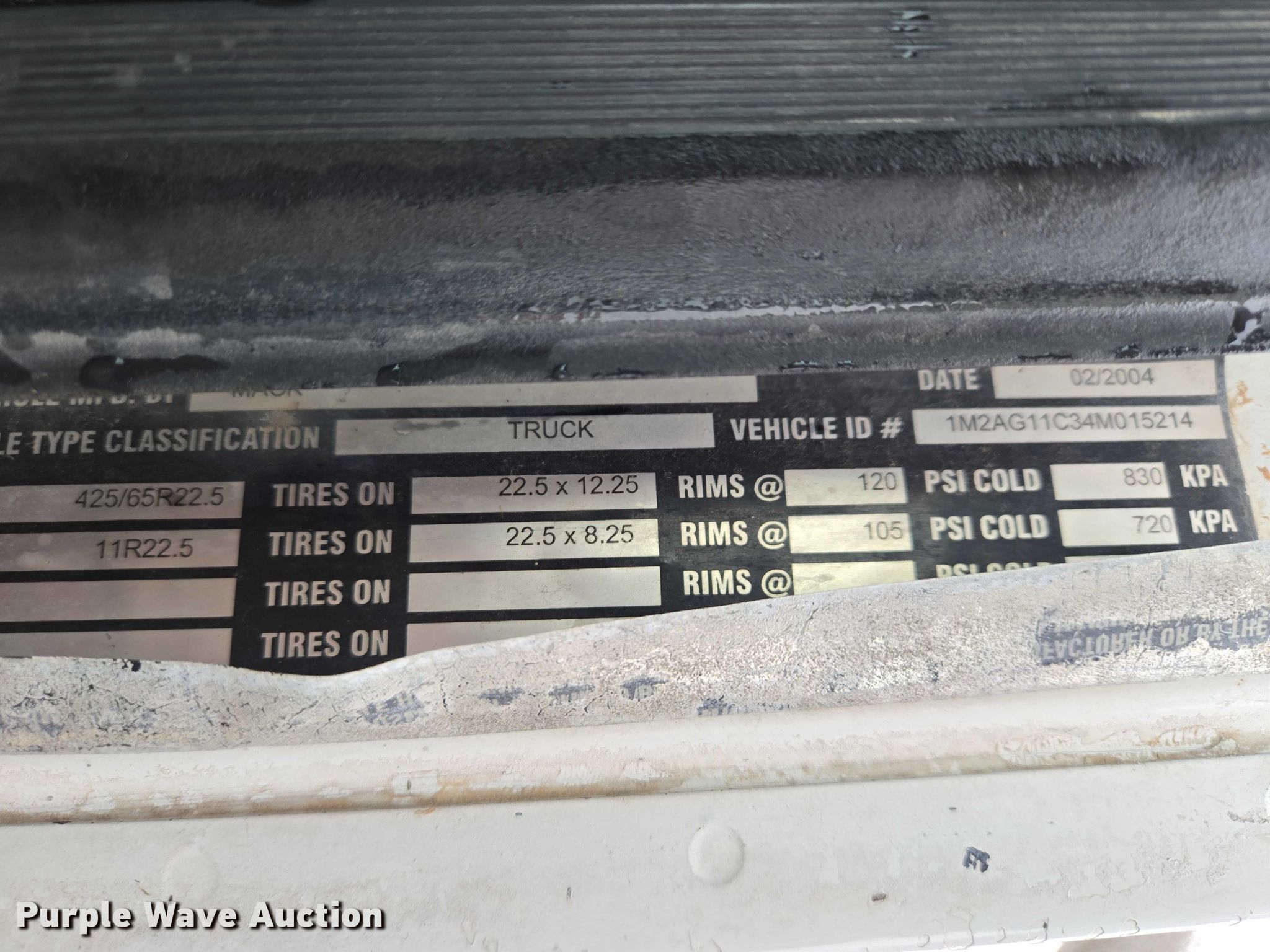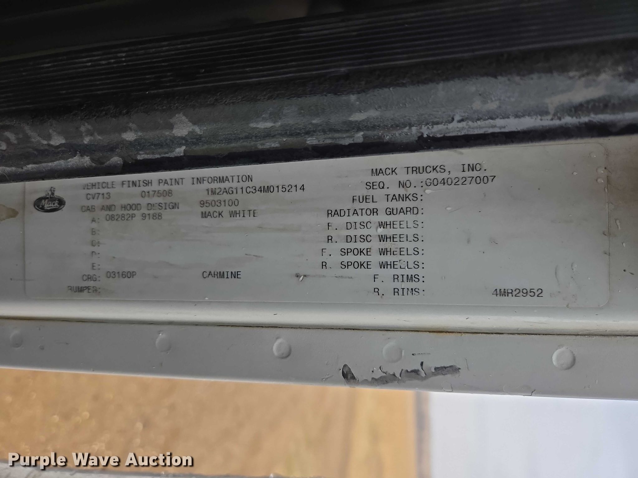 2004 Mack Granite CV713 ready mix truck. Miles: 295,561 on odometer, Hours: 30,043 on meter, VIN: 1M2AG11C34M015214. Engine Mack, Displacement: 12.0L, Cylinders: 6, Fuel type: Diesel, HP: 335. Transmission Allison, Automatic. Chassis Axles: 4, Pusher axle Steerable, Tag axle Steerable, Suspension: Spring over walking beam, Brakes: Air, PTO. Interior AC, Heat, Heated mirrors, Cruise control. Features Mixer McNeilus, Serial: 68839-22073, Capacity: 11 cu.yd., Discharge: Rear, In-cab controls, Rear drum controls, Water tank capacity: 150 gallons, Chute Extensions: 3, Chute type: Steel.. Tires Front: 425/65R22.5, Rear: 11R22.5, Lift axle: 255/70R22.5, Tag axle: 11R22.5. Notes Tablet not included, will be removed prior to auction. South Dakota title. Title distribution may be delayed up to 14 days from verification of funds. Crooks, SD 57020