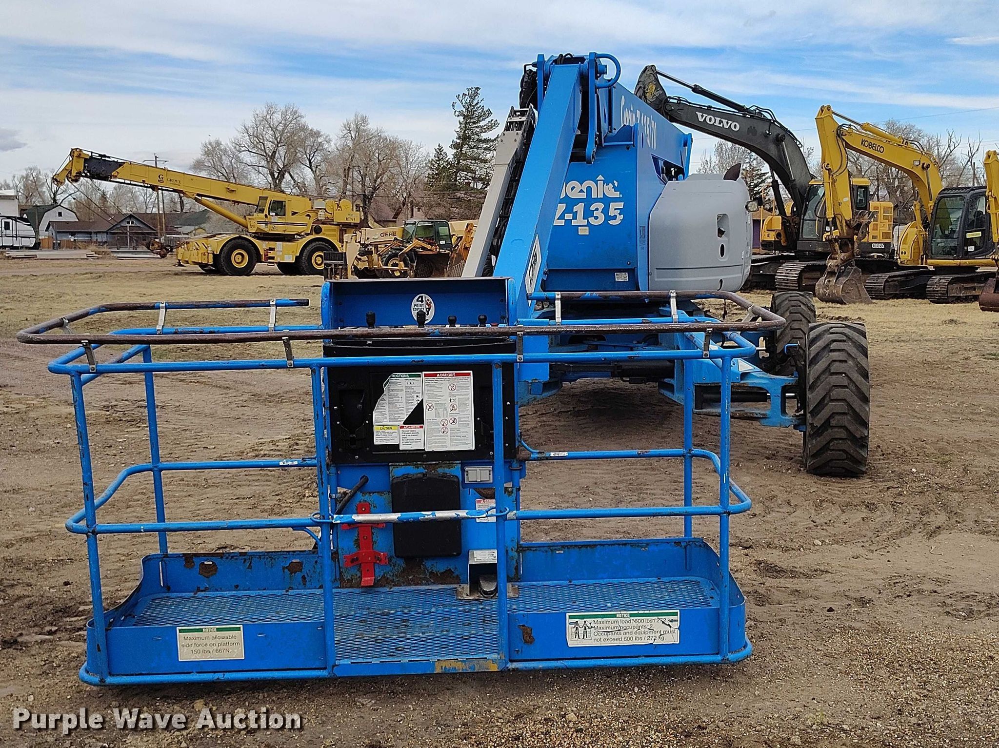 2006 Genie Z-135 boom lift. Hours: 4,056 on meter, Serial: Z13506-300. Engine Perkins, Cylinders: 4, Fuel type: Diesel. Chassis Four wheel drive, Steering: Four wheel. Features Rough terrain, Boom type: Articulating, Telescopic, Maximum lift capacity: 600 lbs, Maximum reach length: 69', Maximum lift height: 135', Hydraulic extendable jib, Platform: 93" L x 35" W, AC power outlet, Controls: Platform, Ground, Platform rotation: Hydraulic. Tires Tire size: 445/60D22.5. Notes Platform jib issues, intermittent. Prairie Equipment, LLC. Laramie, WY 82072