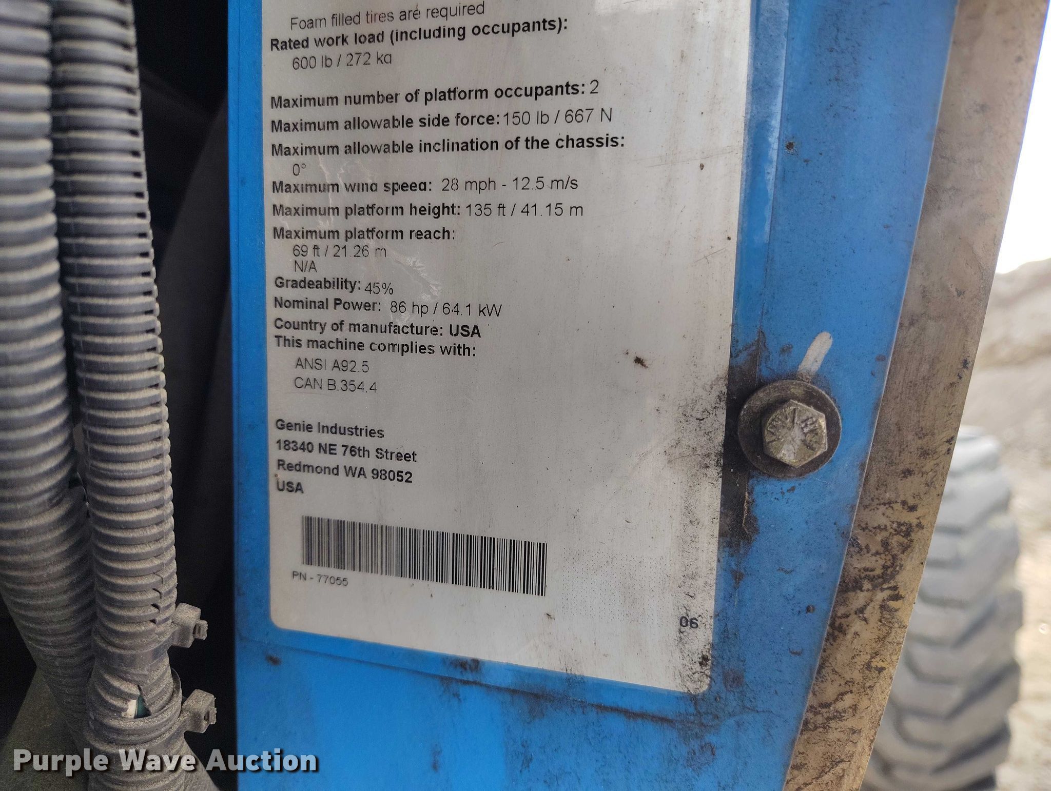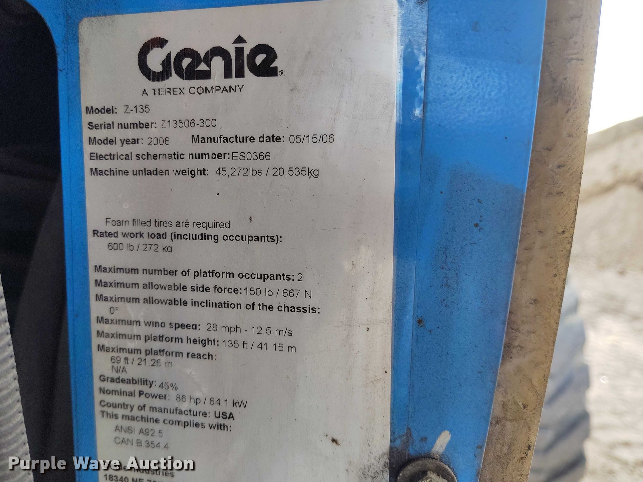 Purple Wave is selling a used Boom Lift in Wyoming. This item is a 2006 Genie Z-135 boom lift with the following: Hours: 4,056 on meter, Serial: Z13506-300