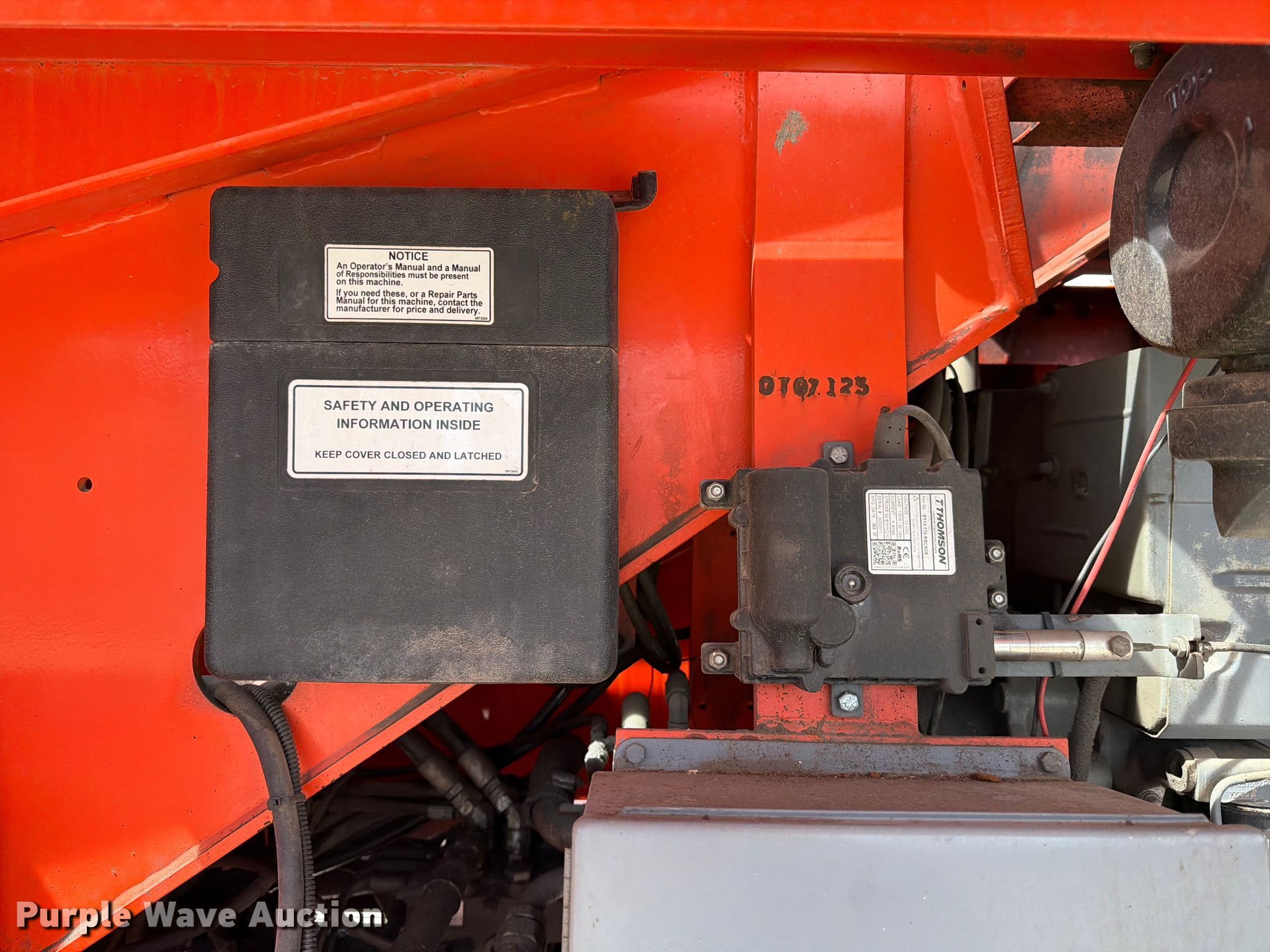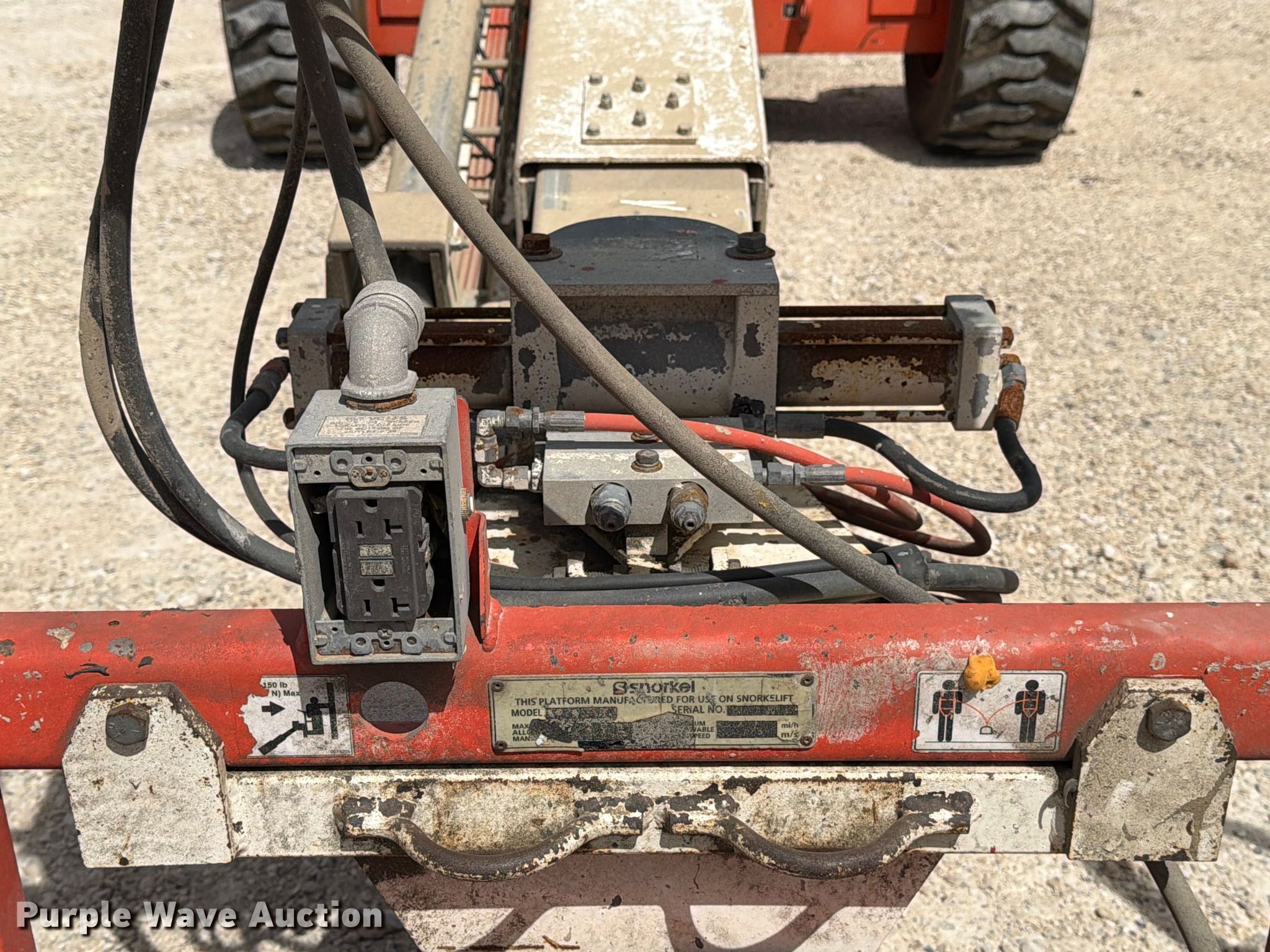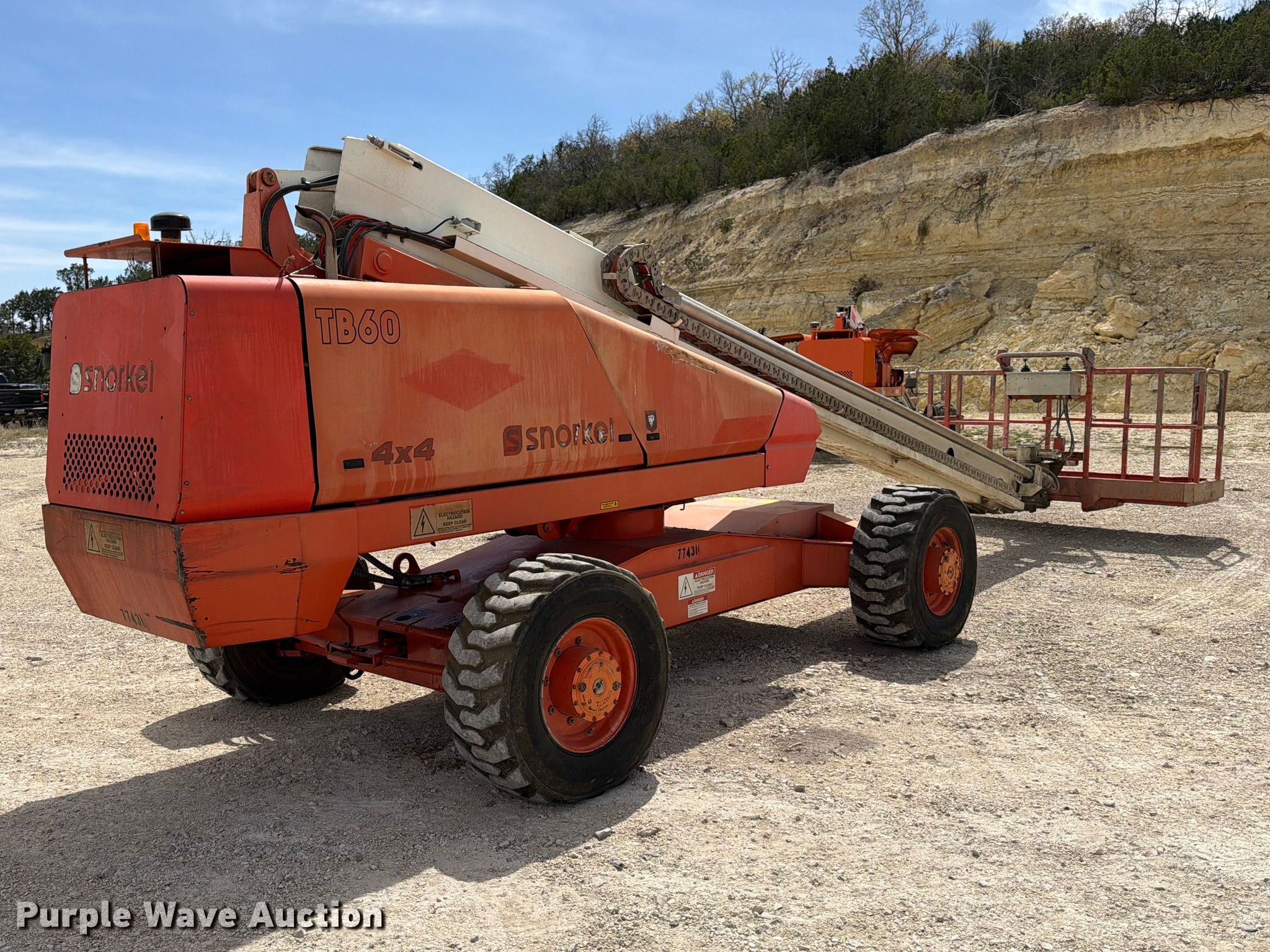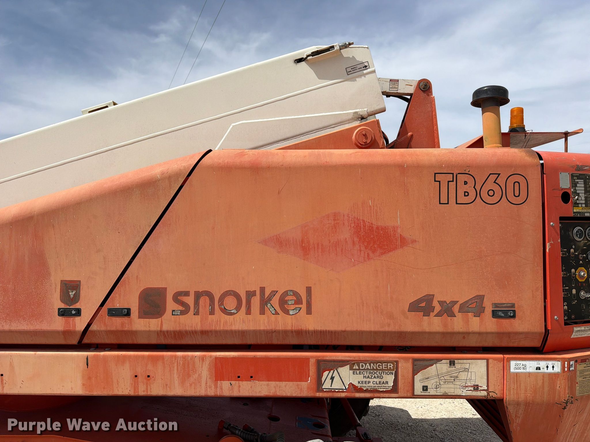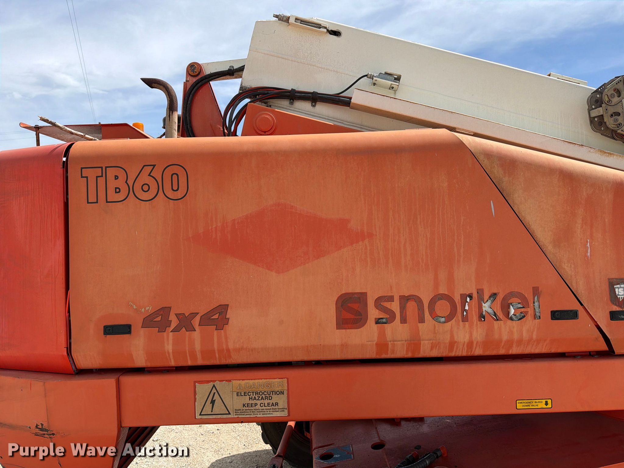 2018 Snorkel TB60DZ boom lift. Hours: 5,896 on meter, Serial: 0T07125RBLT. Engine Deutz, Cylinders: 4, Fuel type: Diesel. Chassis Four wheel drive. Features Rough terrain, Boom type: Telescopic, Maximum lift capacity: 500 lbs, Maximum reach length: 50', Maximum lift height: 60', Platform: 96" L x 40" W, AC power outlet, Controls: Platform, Ground, Platform rotation: Hydraulic, Safety alarm. Tires Tire size: 15-19.5. Notes Hydraulic issues, leak. S & S Bridge Painting, Inc... Kerrville, TX 78028