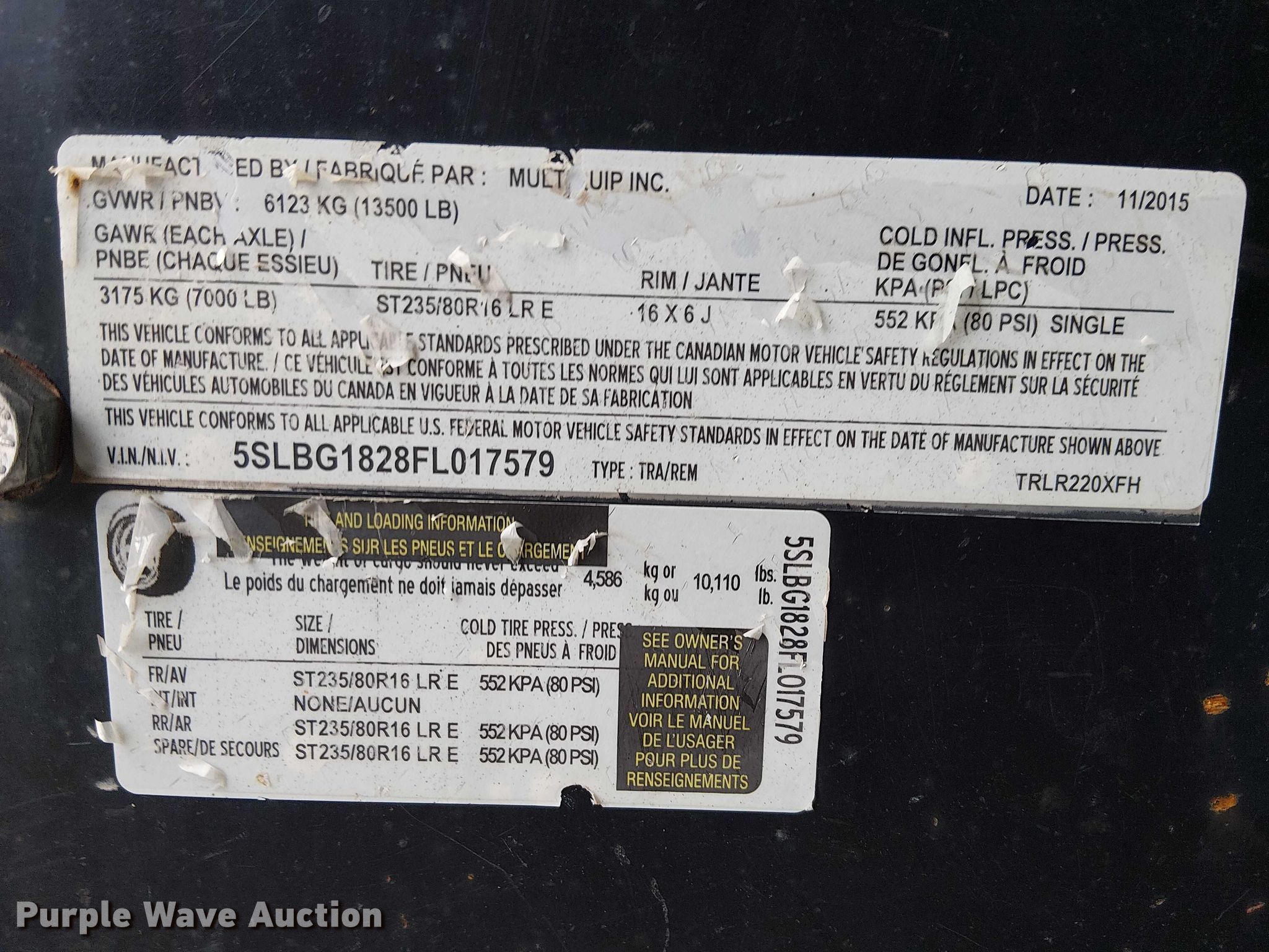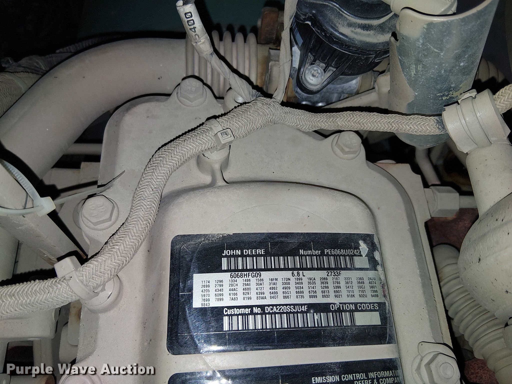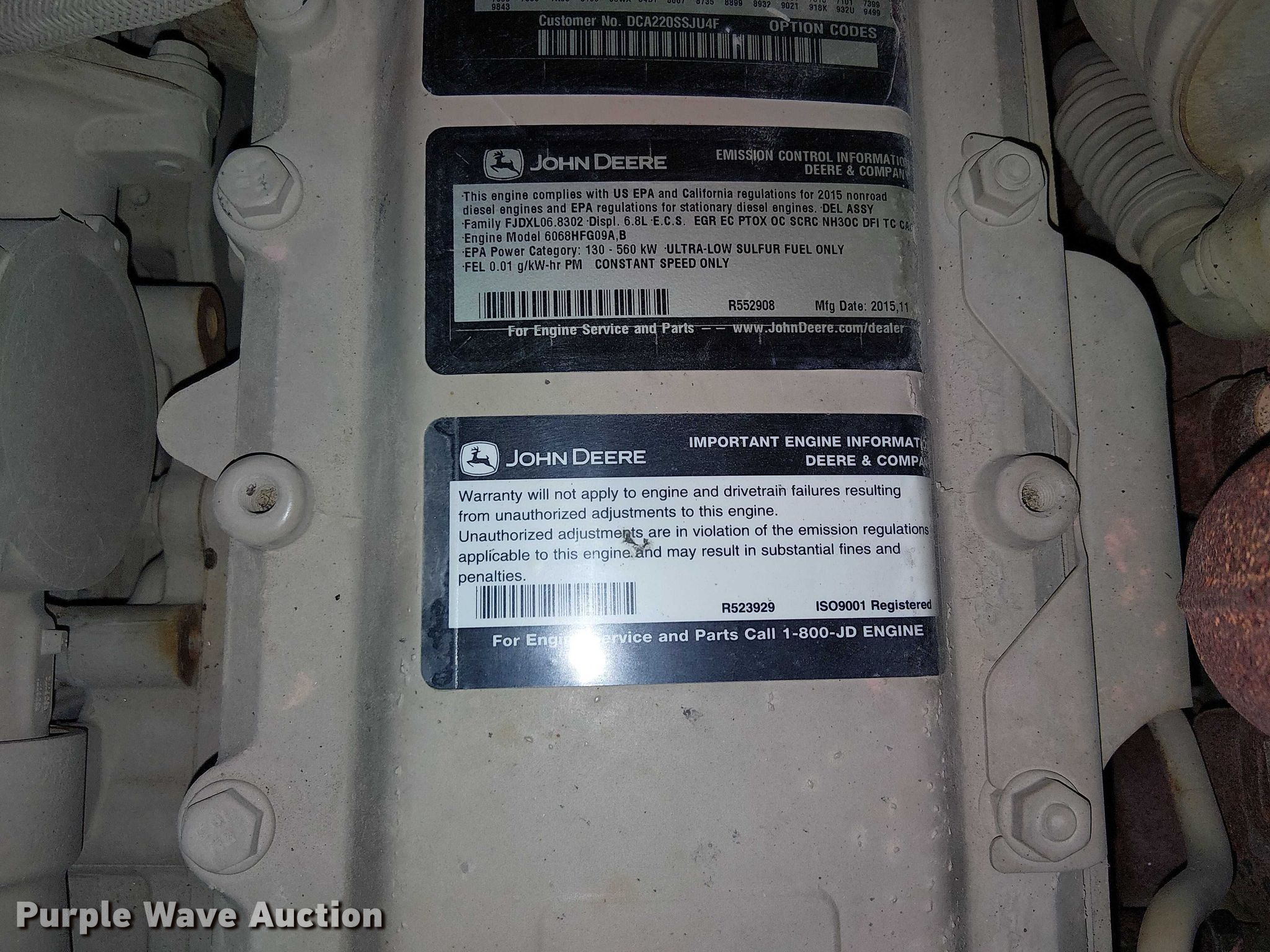2015 MQ Power DCA-220SSJU4F generator. Hours: 16,085 on meter, VIN: 5SLBG1828FL017579, Serial: 8010852. Engine John Deere 6068HFG09, Serial: PE6068U02427, Displacement: 6.8L, Cylinders: 6, Fuel type: Diesel. Features Generator MQ DF-2400J (T4), kVA: 220, Phase: Three, Electric start, Fuel tank. Trailer 2015 Multiquip TRLR220XFH, 20' L x 98" W, Hitch: Pintle, Suspension: Spring, Brakes: Electric, Axles: Tandem, Tire size: ST235/80R16, GVWR: 13,500 lbs, GAWR: 7,000 lbs. This is worksite support equipment and will not come with a title. Transfer of ownership documentation will be a bill of sale. Sunbelt Rentals. Orem, UT 84057