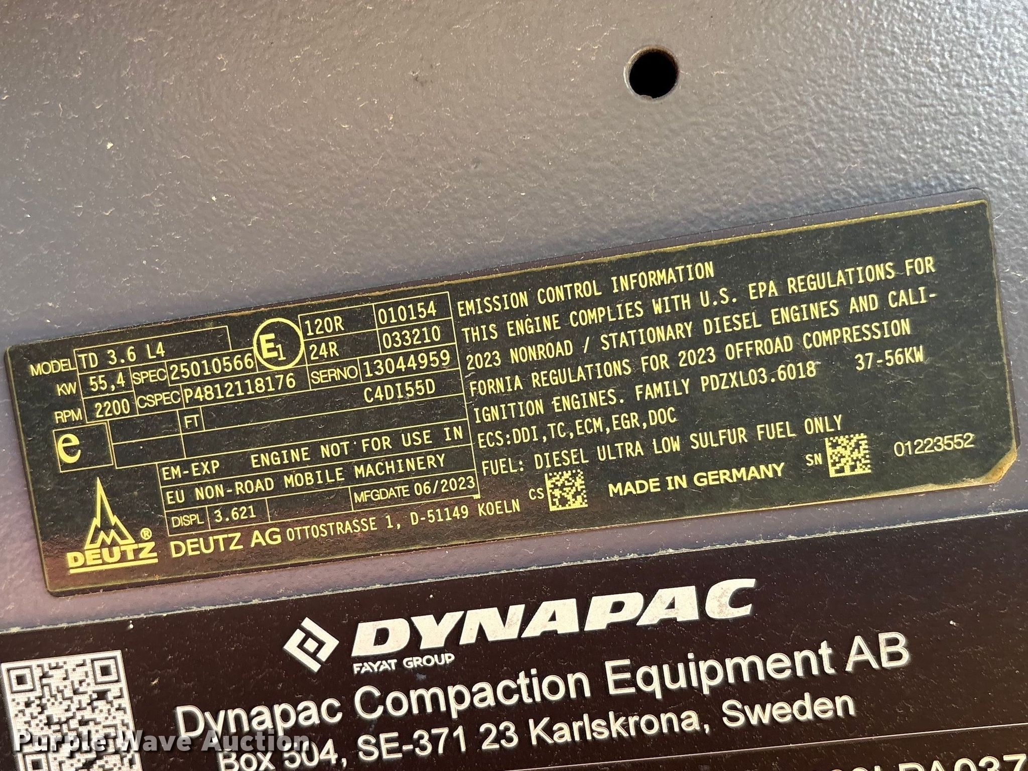 2023 Dynapac CA1500PD single drum vibratory roller. Hours: 3 on meter, Serial: 10000160LPA037340. Engine Deutz TD3.6 L4, Serial: 13044959, Displacement: 3.6L, Cylinders: 4, Fuel type: Diesel. Transmission Hydrostatic. Operators station OROPS. Features Drum Drum type: Padfoot, Vibratory system: Single, Width: 67", Diameter: 48", Drum scrapers. Tires Size: 14.9-24. Notes Dynapac warranty valid through one year or 1,000 hours, Warranty information available upon request to [email protected]. Dynapac North America. Claxton, GA 30417