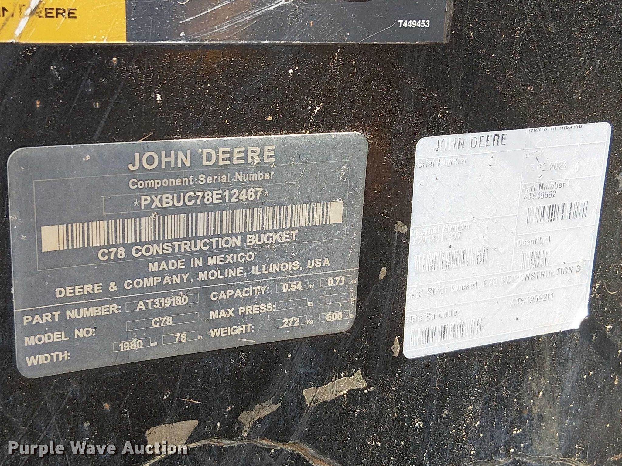 2024 John Deere 325G tracked skid steer loader. Hours: 369 on meter, Serial: 1T0325GMARJ467797. Engine Yanmar 4TNV98CT, Serial: CH4Y33T050767, Displacement: 3.3L, Cylinders: 4, Fuel type: Diesel, kW: 52.5. Transmission Hydrostatic, Two speed travel. Operators station Enclosed cab, AC, Heat, Backup camera, Bucket control: Hand. Features Auxiliary hydraulics, Auxiliary electrical outlet, Quick coupler: Hydraulic, Bucket John Deere C78, Capacity: 0.71 cu.yd., Width: 78", Cutting edge: Bolt-on. Tracks Width: 15". Yearly Construction Liquidation. Hemingway, SC 29554