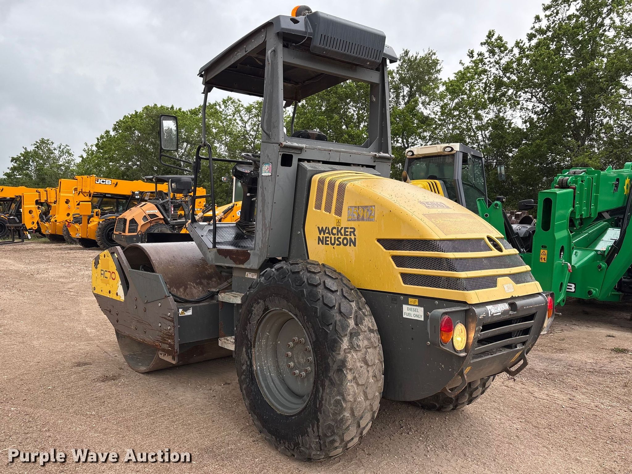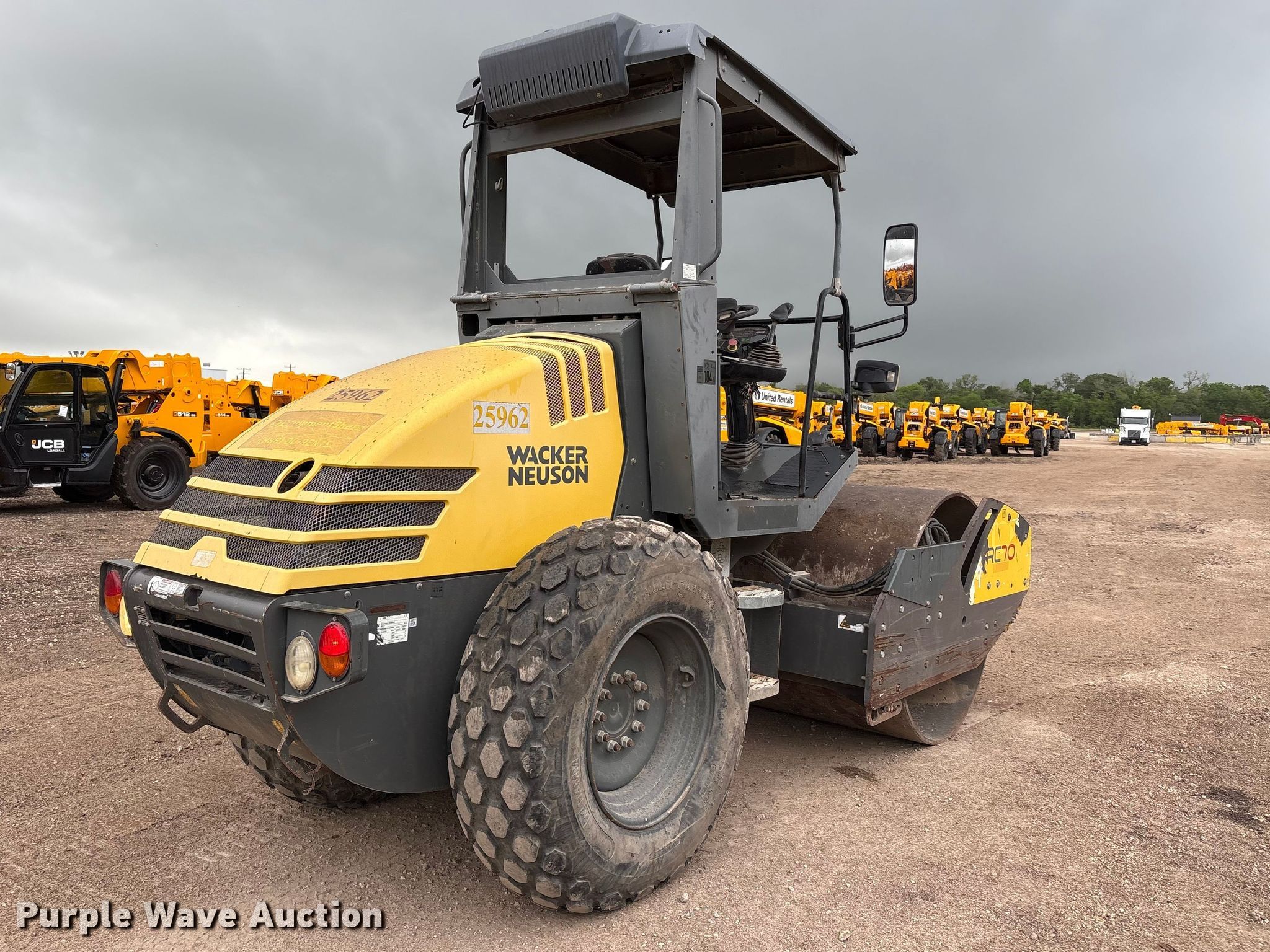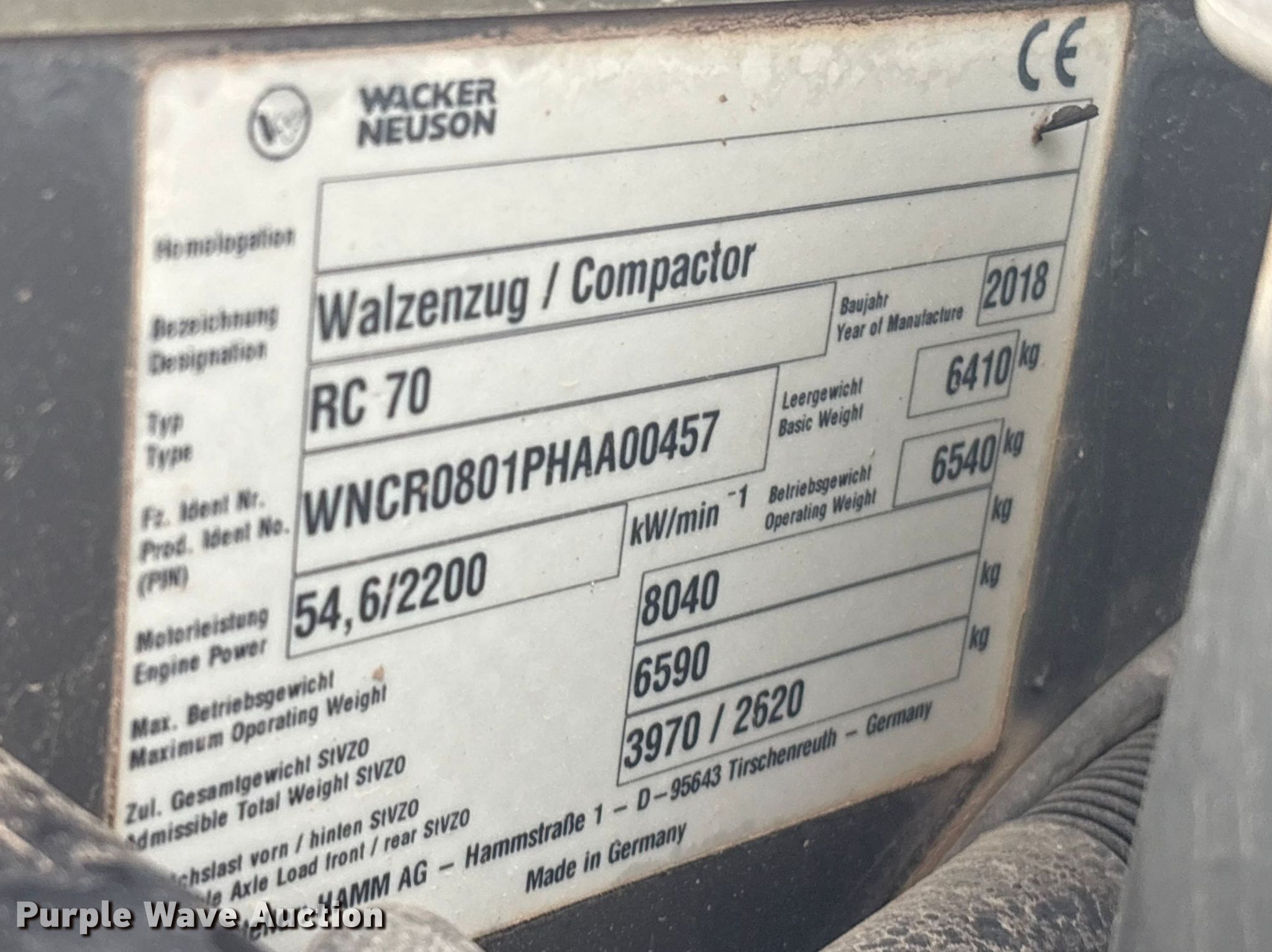 2018 Wacker Neuson RC70 single drum vibratory roller. Hours: 1,100 on meter, Serial: WNCR0801PHAA00457. Engine Kubota V3307-CR-T-EF05, Displacement: 3.3, Cylinders: 4, Fuel type: Diesel, kW: 54. Transmission Hydrostatic. Operators station OROPS. Features Drum Drum type: Smooth, Vibratory system: Single, Two speed, Width: 66", Diameter: 48", Drum scrapers. Tires Size: 14.9-24, Steel wheels. Dynapac North America. Sweeny , TX 77480