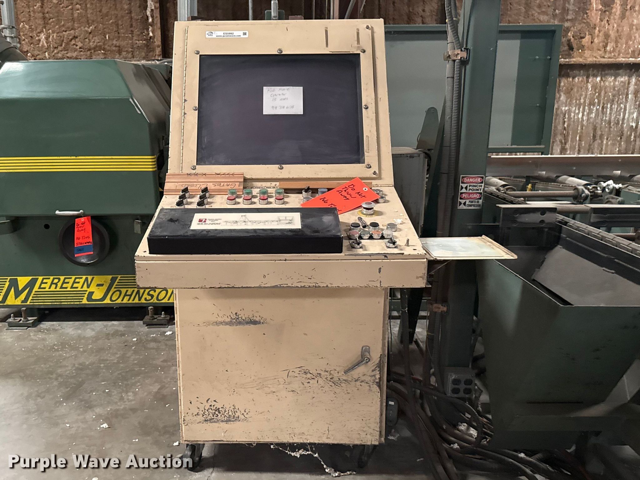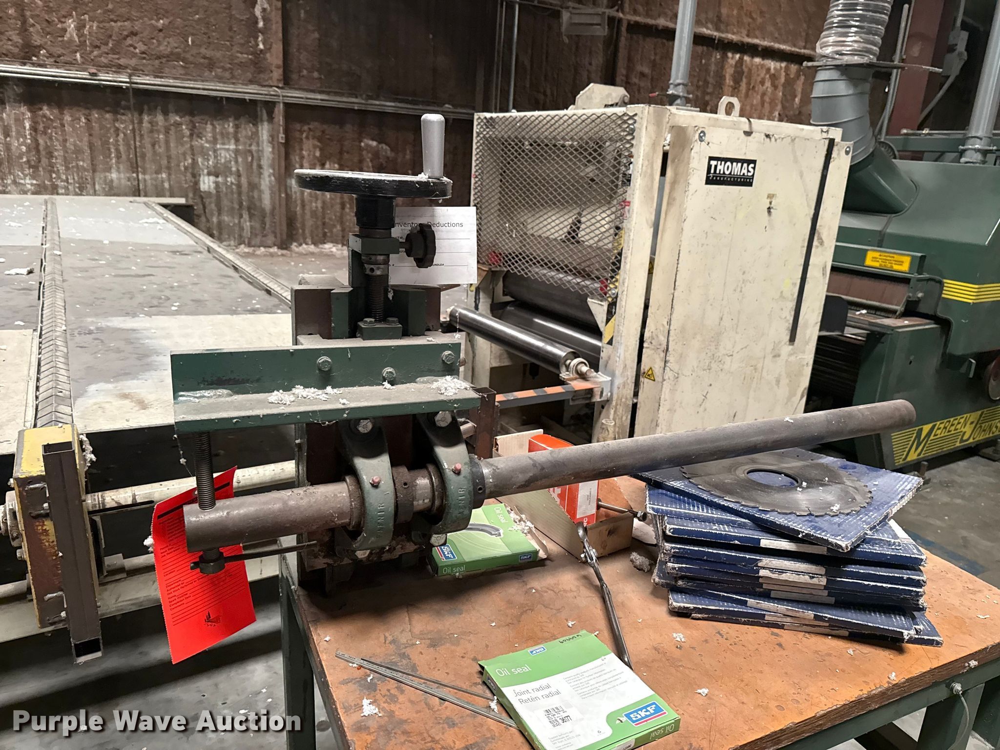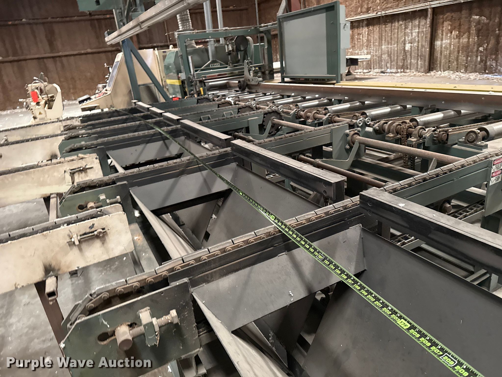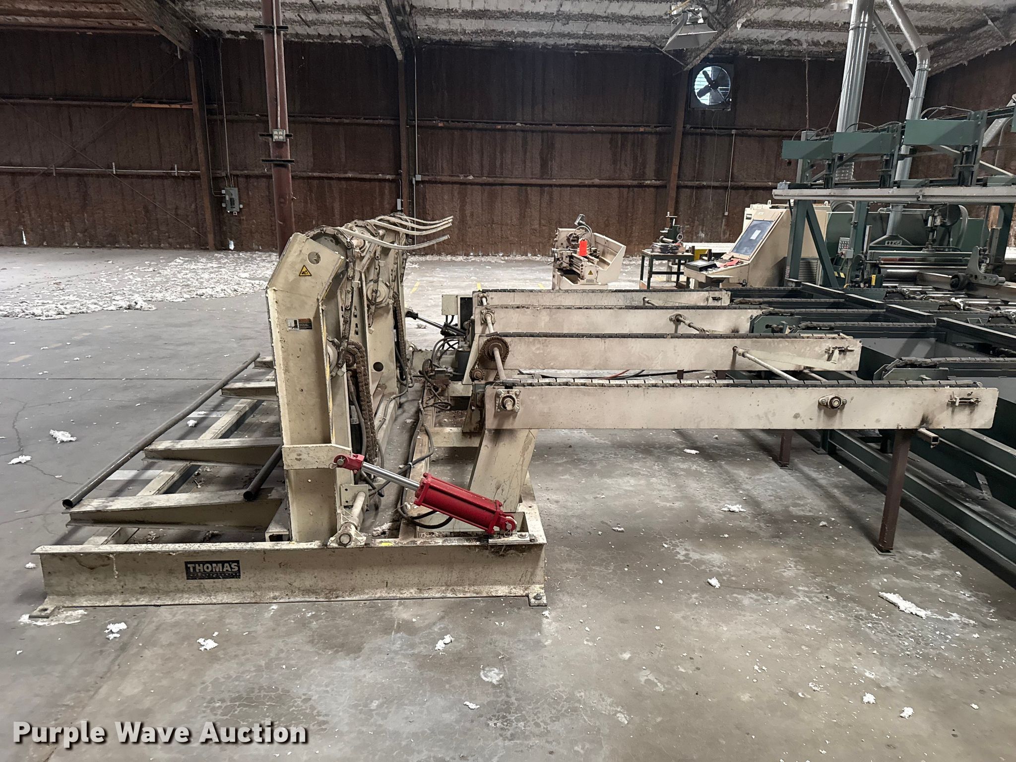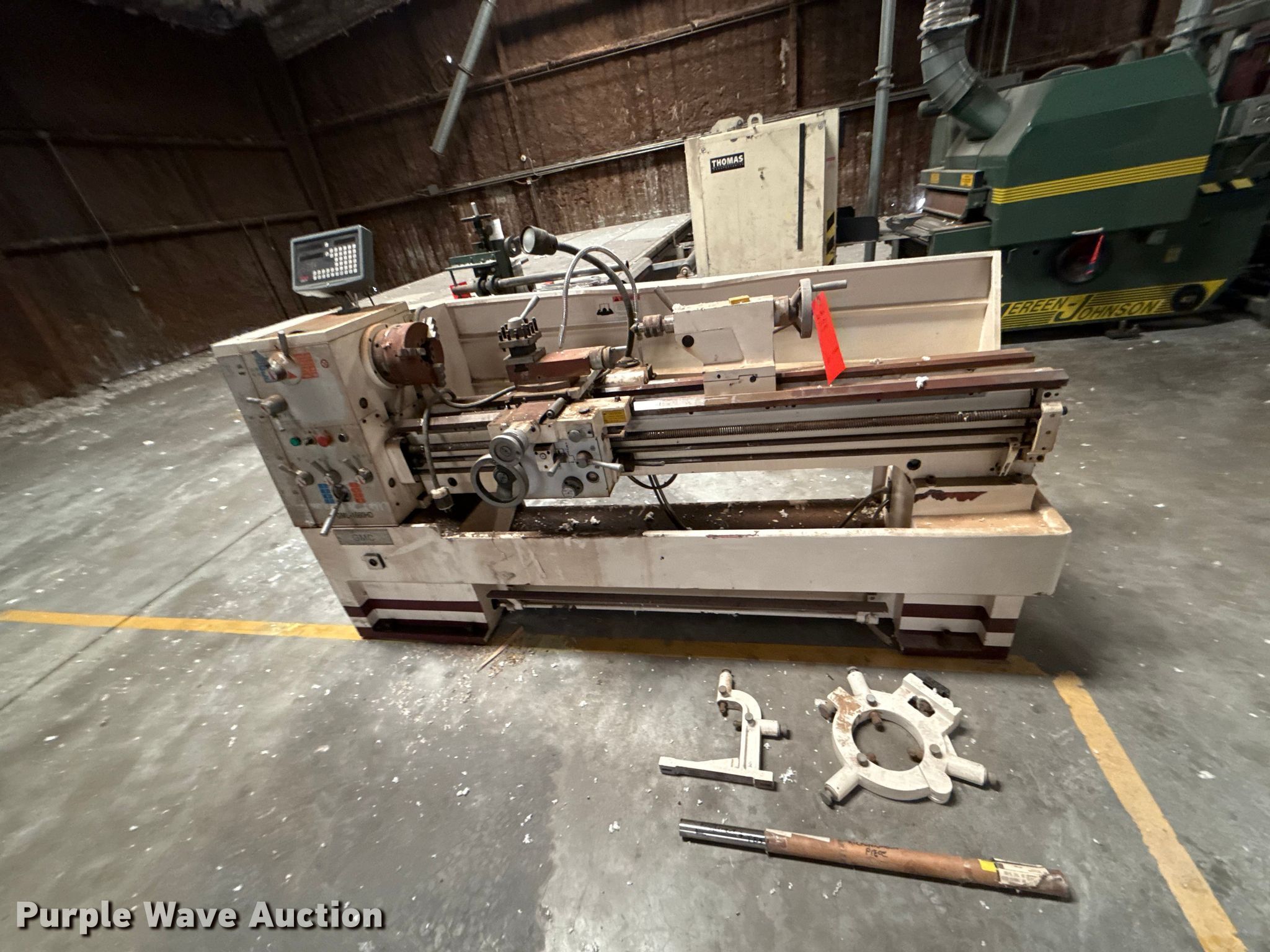 Woodworking equipment. Hours: 8,529 on meter, Serial: MJ-5699. Electric Motor Volts: 460, Phase: Three. Features Thomas bundle dumper, Thomas conveyor, Group 7 Systems conveyor Volts: 460, Phase: Three, Hertz: 60, Mereen-Johnson 431 gang rip saw Serial: MJ5699, Control panel, Thomas roller, Thomas conveyor table, GMC GML-1660HD lathe. Mark Brewer. Broken Arrow, OK 74014