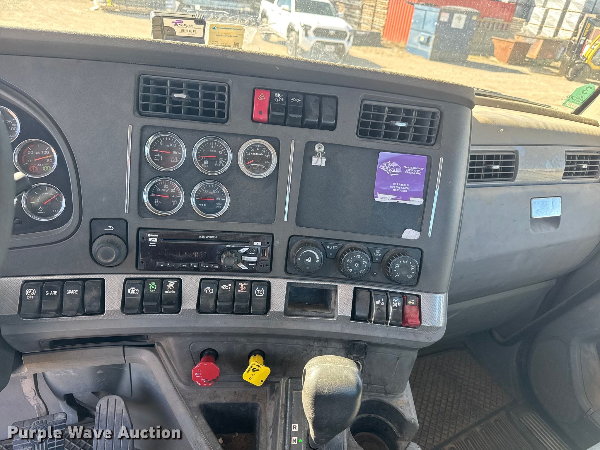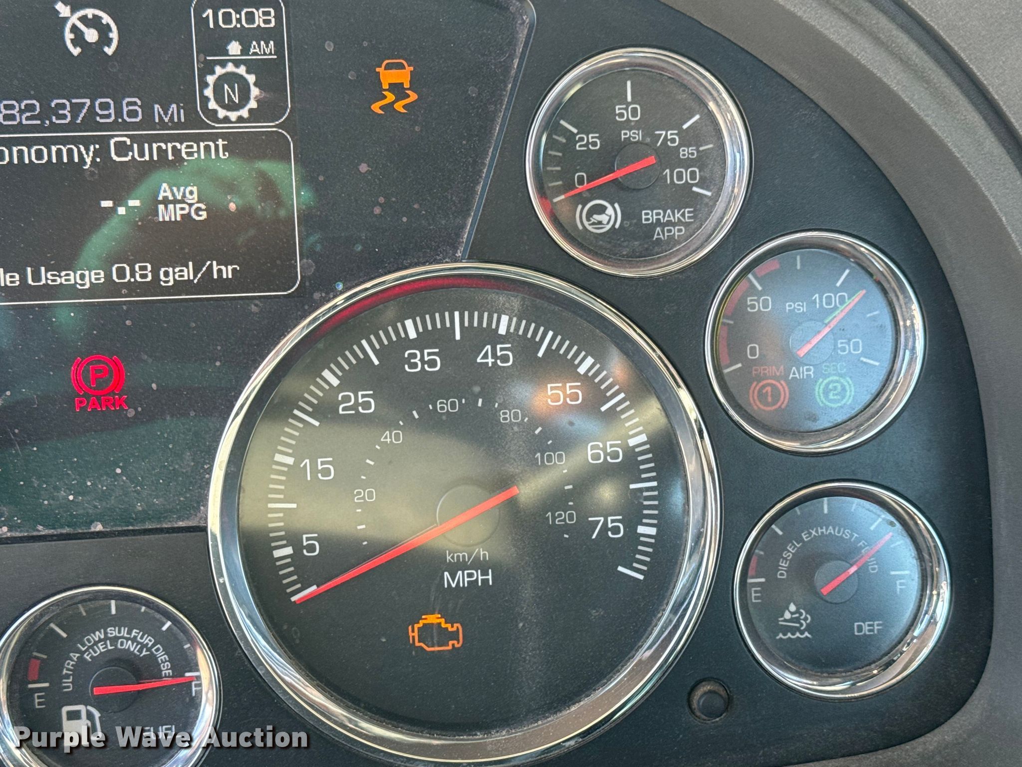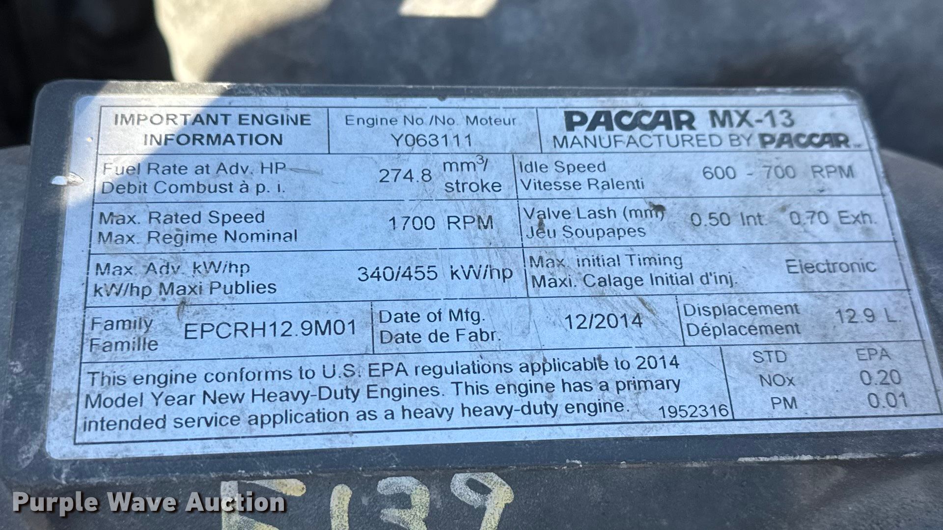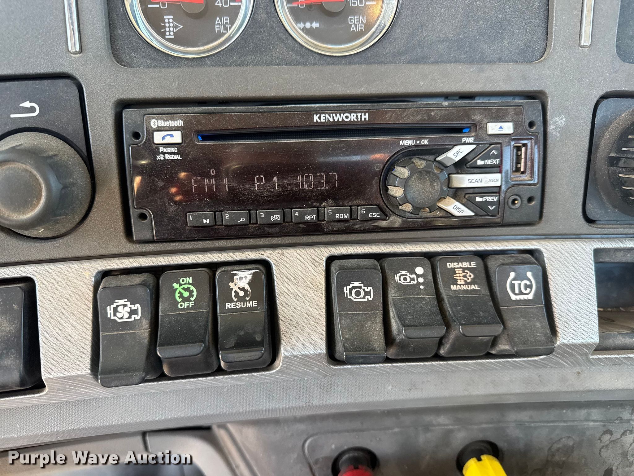 2015 Kenworth T880 semi truck. Miles: 582,380 on odometer, Hours: 2,404 on meter Actual hours: Unknown, VIN: 1XKZDP9X0FJ471061, Unit #: 15. Engine Paccar MX-13, Serial: Y063111, Displacement: 12.9L, Cylinders: 6, Fuel type: Diesel, Engine brake. Transmission Automated manual. Chassis Axles: Tandem, Differential lock: Inter-axle, Suspension: Air Dump valves, Brakes: Air, GVWR: 53,200 lbs FAWR: 13,200 lbs, IAWR: 20,000 lbs, RAWR: 20,000 lbs. Interior AC, Heat, Heated mirrors, Power windows, Power locks, Cruise control, Air ride cab, Auxiliary controls. Features Deck plate: Aluminum, Fifth wheel type: Air operated, Sliding, Fuel tank: Dual. Tires Size: 295/75R22.5. Notes Dash warning indicator: Check engine, ABS, Traction control, Windshield chipped or cracked. Kansas title. The Monarch Cement Company. Wichita, KS 67209