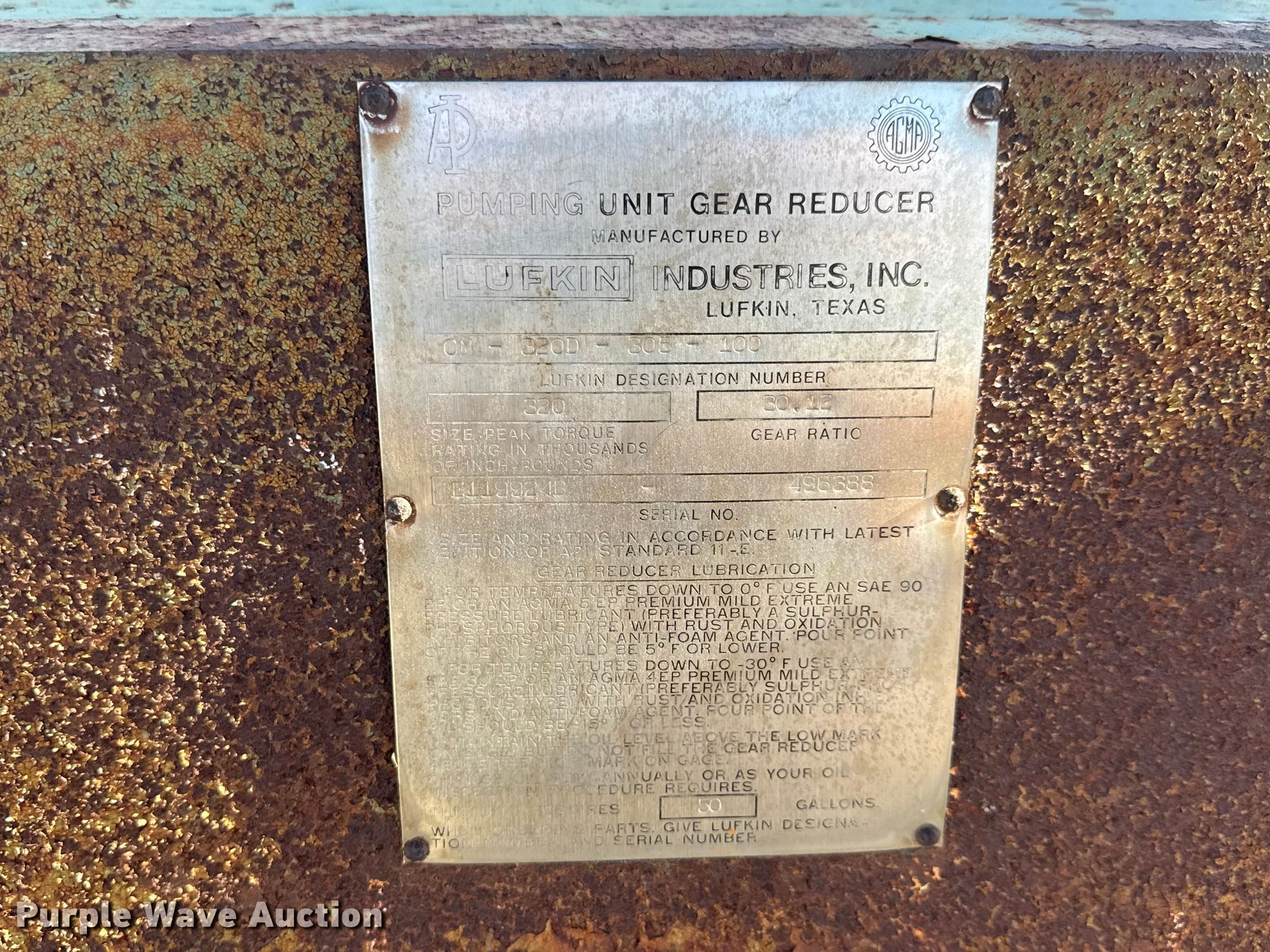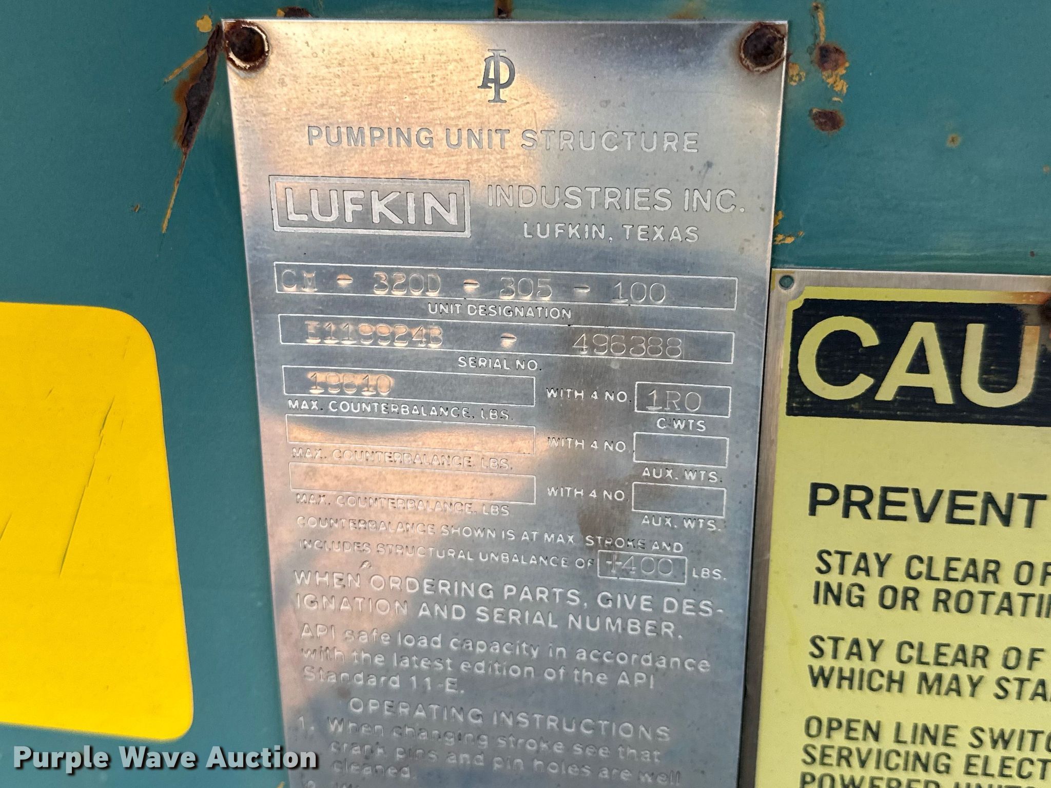 Purple Wave is selling a used Oilfield Equip. in Kansas. This item is a Lufkin CM-320D-305-100 pump jack with the following: Hours: 6,943 on meter, Serial: E119924B-496388
