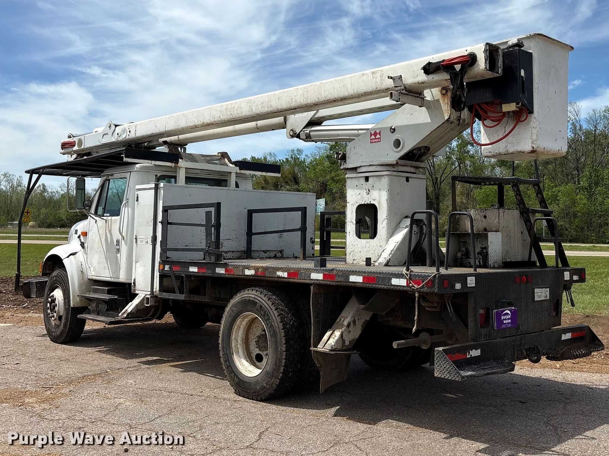 2001 International 4700 bucket truck. Miles: 254,839 on odometer, VIN: 1HTSCAAPX1H361243. Engine Cylinders: 6, Fuel type: Diesel. Transmission Manual, Speed: 7. Chassis Axles: Single, Suspension: Spring, Brakes: Hydraulic, PTO, GVWR: 33,000 lbs. Interior AC, Heat, Cruise control, Brake controller. Features Bed Length: 15', Width: 93", Boom Terex Hi Ranger XT5, Serial: 2010316448, Maximum lift capacity: 350 lbs, Maximum lift height: 60', Boom type: Articulating, Insulated, Man basket, Boom controls Lower, Basket.. Tires Size: 11R22.5, Brand: Advanta. Kansas title. Title distribution may be delayed up to 14 days from verification of funds. Brown Tree Service. Corinth, MS 38834