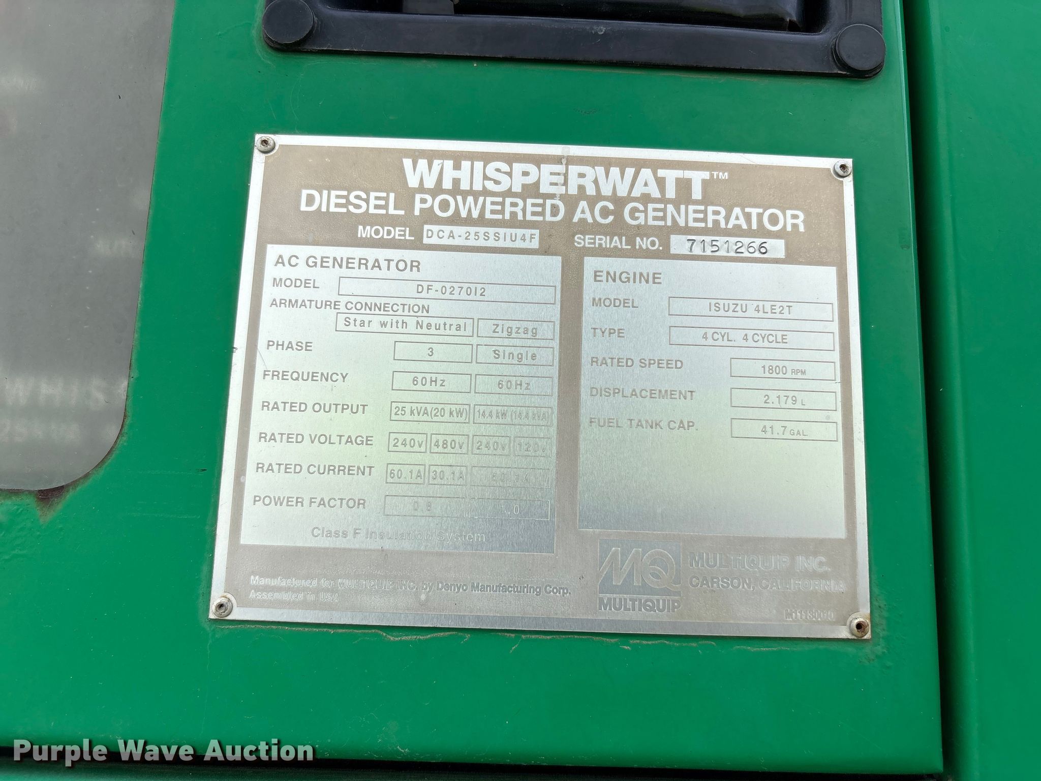 Purple Wave is selling a used Generator Set in Nevada. This item is a 2015 Multiquip WhisperWattDCA-25SSIU4F generator with the following: Hours: 4,414 on meter, Actual hours unknown, Serial: 7151266