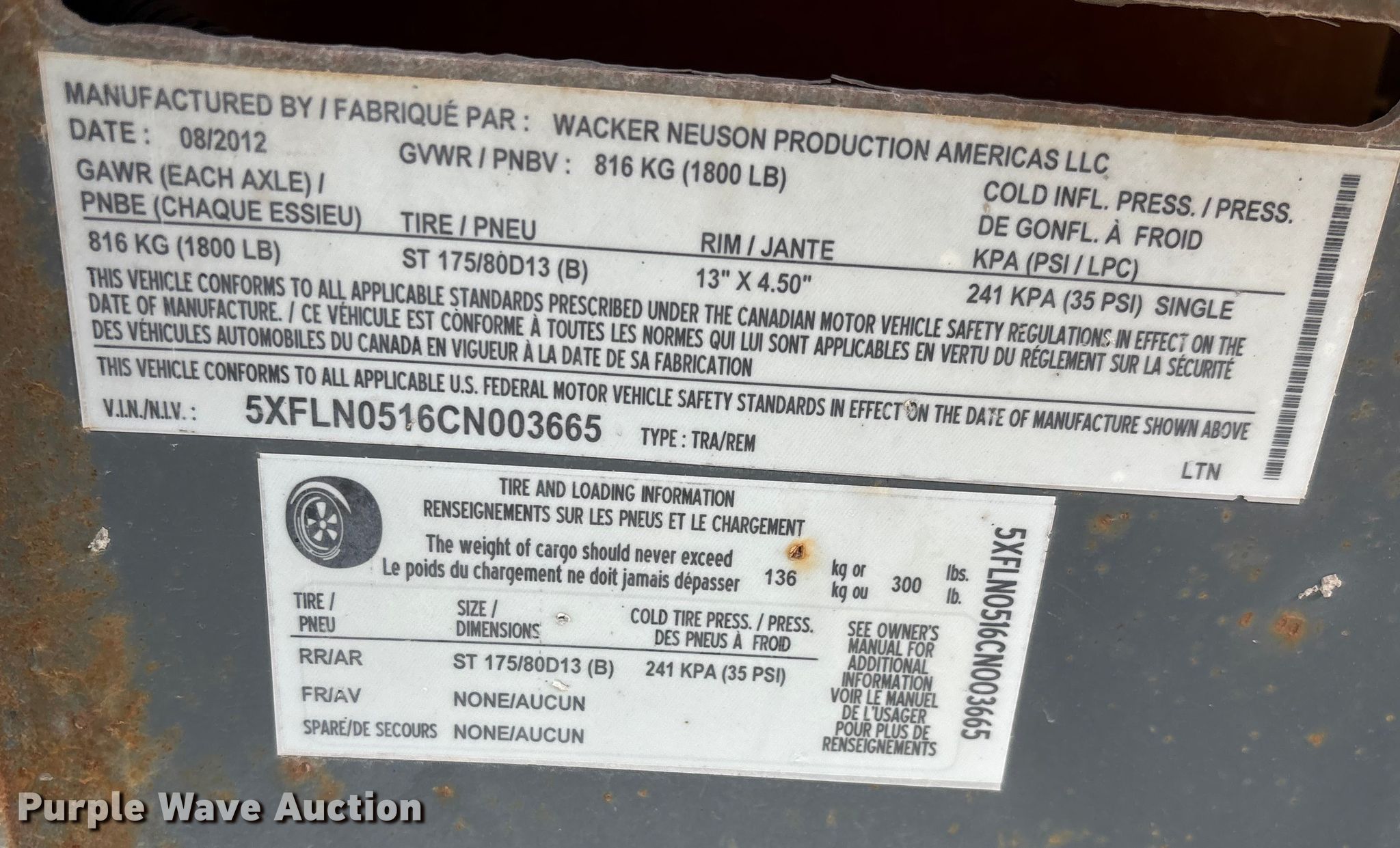 2012 Wacker Neuson LTN6 light plant. Hours: 1,092 on meter, VIN: 5XFLN0516CM003665, Unit #: 494. Engine Kohler, Fuel type: Diesel. Features Stabilizer jacks Front and rear. Trailer 11' L x 44" W, Hitch: Pintle, Axles: Single, Tire size: 175/80D13, GVWR: 1,800 lbs, GAWR: 1,800 lbs. Notes Dead battery. This is worksite support equipment and will not come with a title. Transfer of ownership documentation will be a bill of sale. L.G. Barcus & Sons, Inc... Kansas City, KS 66102