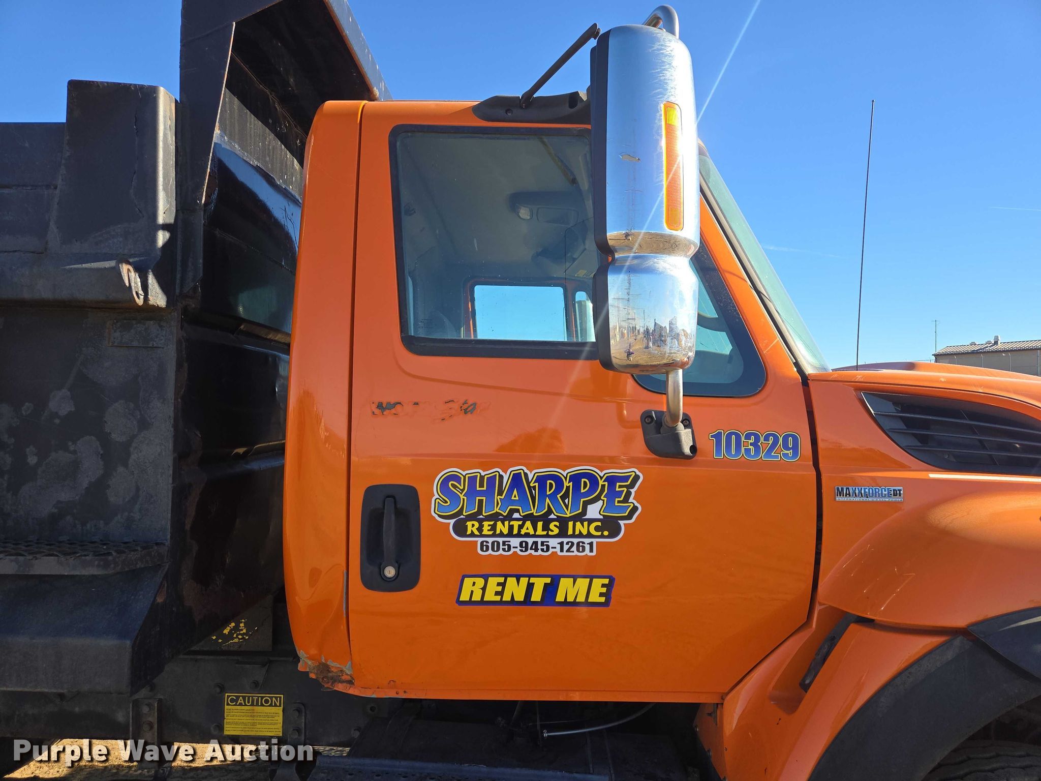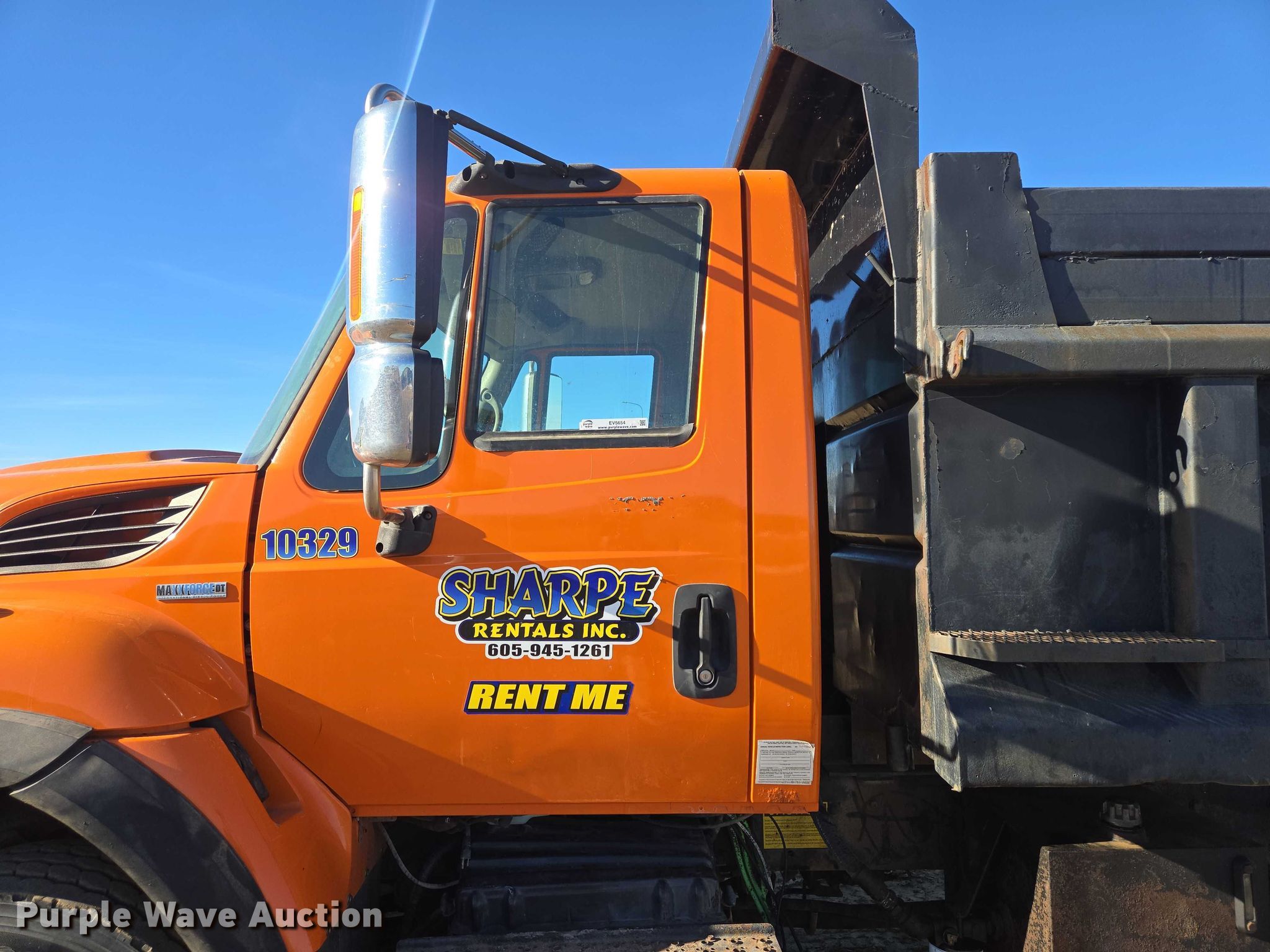 2008 International 7400 dump truck. Miles: 63,140 on odometer, Hours: 6,616 on meter, VIN: 1HTWGAAT98J690036, Unit #: 10329. Engine International GDT260, Displacement: 7.6L, Cylinders: 6, Fuel type: Diesel. Transmission Automatic. Chassis Axles: Tandem, Suspension: Spring over walking beam, Brakes: Air, Front mount PTO. Interior AC, Heat, Heated mirrors. Features Bed Dump bed, Length: 14', Width: 95", Side height: 50", Bed type: Steel, Bed vibrator, Ram: Single, End gate: Air operated. Tires Front: 315/80R22.5, Rear: 11R22.5. Notes Dash warning indicator: ABS, Exhaust filter. South Dakota title. Title distribution may be delayed up to 14 days from verification of funds. Sharpe Rentals, Inc.. Pierre, SD 57501