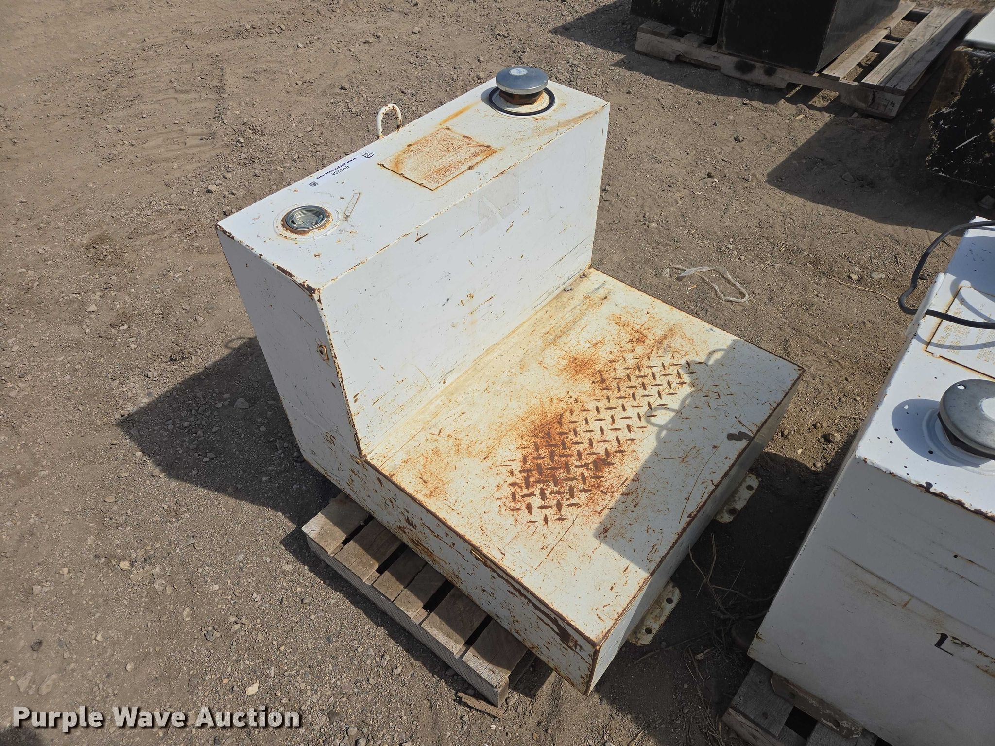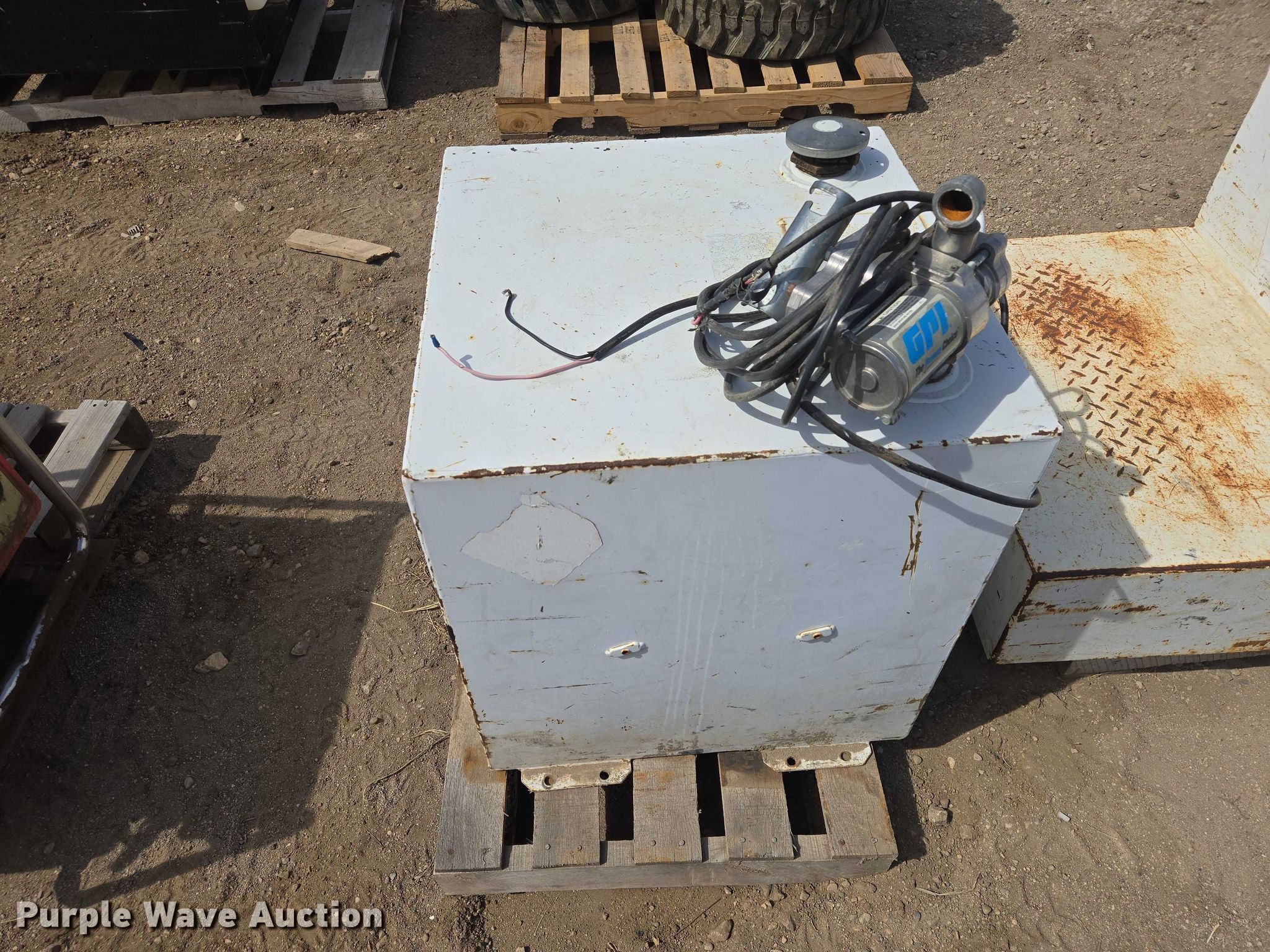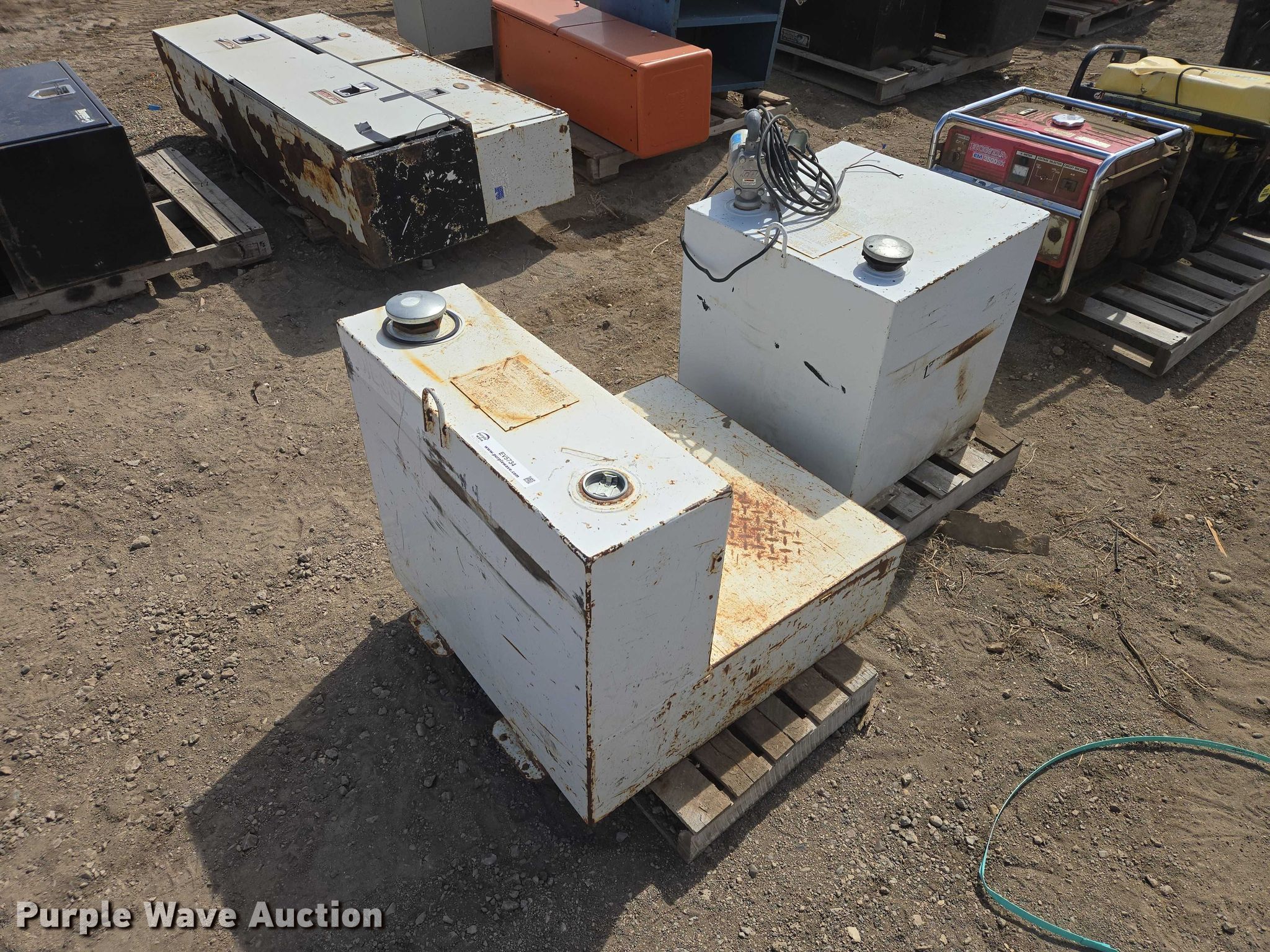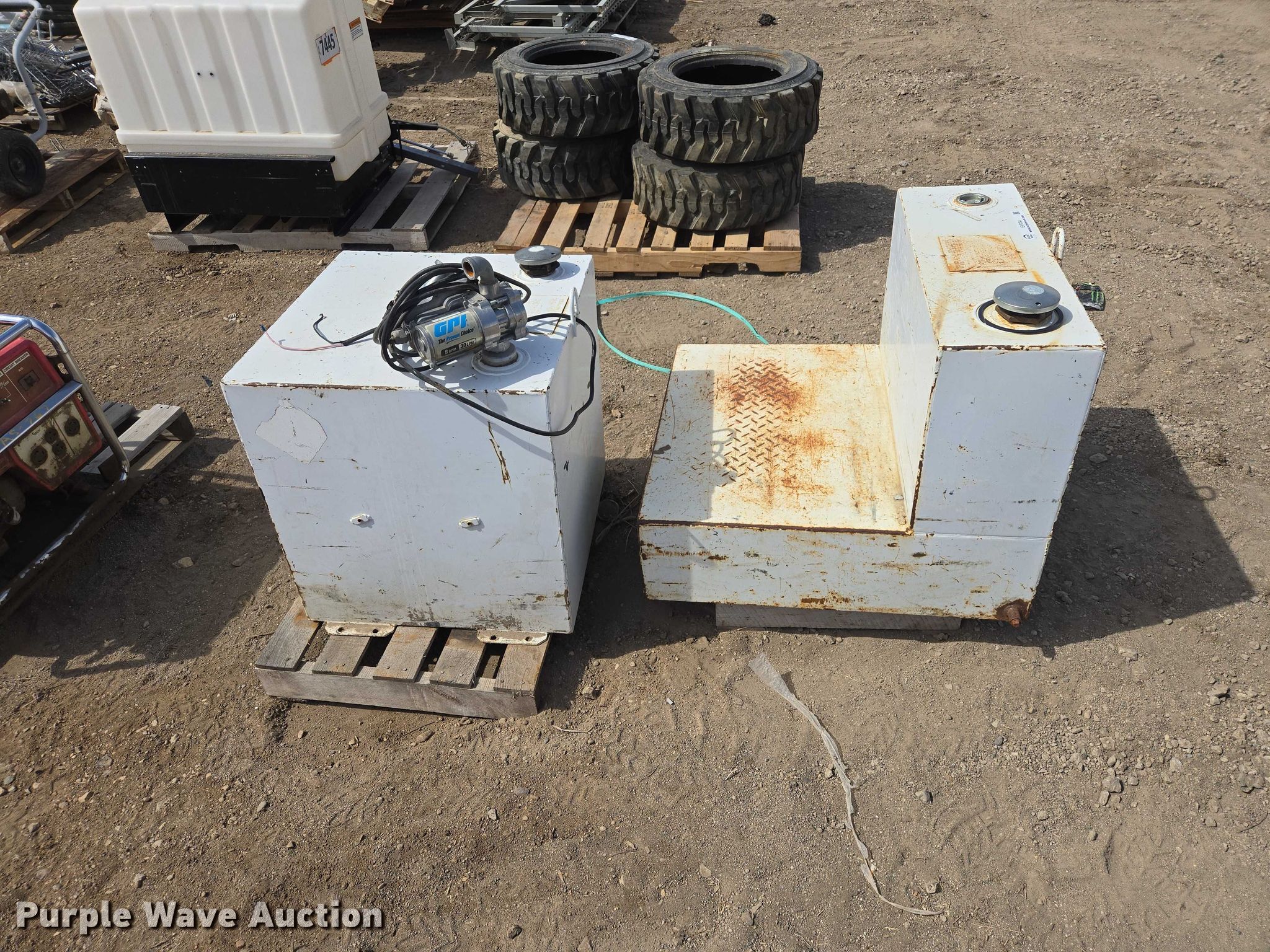 Purple Wave is selling a used Fuel and Lube in South Dakota. This item is a (2) fuel transfer tanks with the following: Square tank, Capacity: 50 gallon, GPI transfer pump, L-Shaped tank, Capacity: 52 gallon