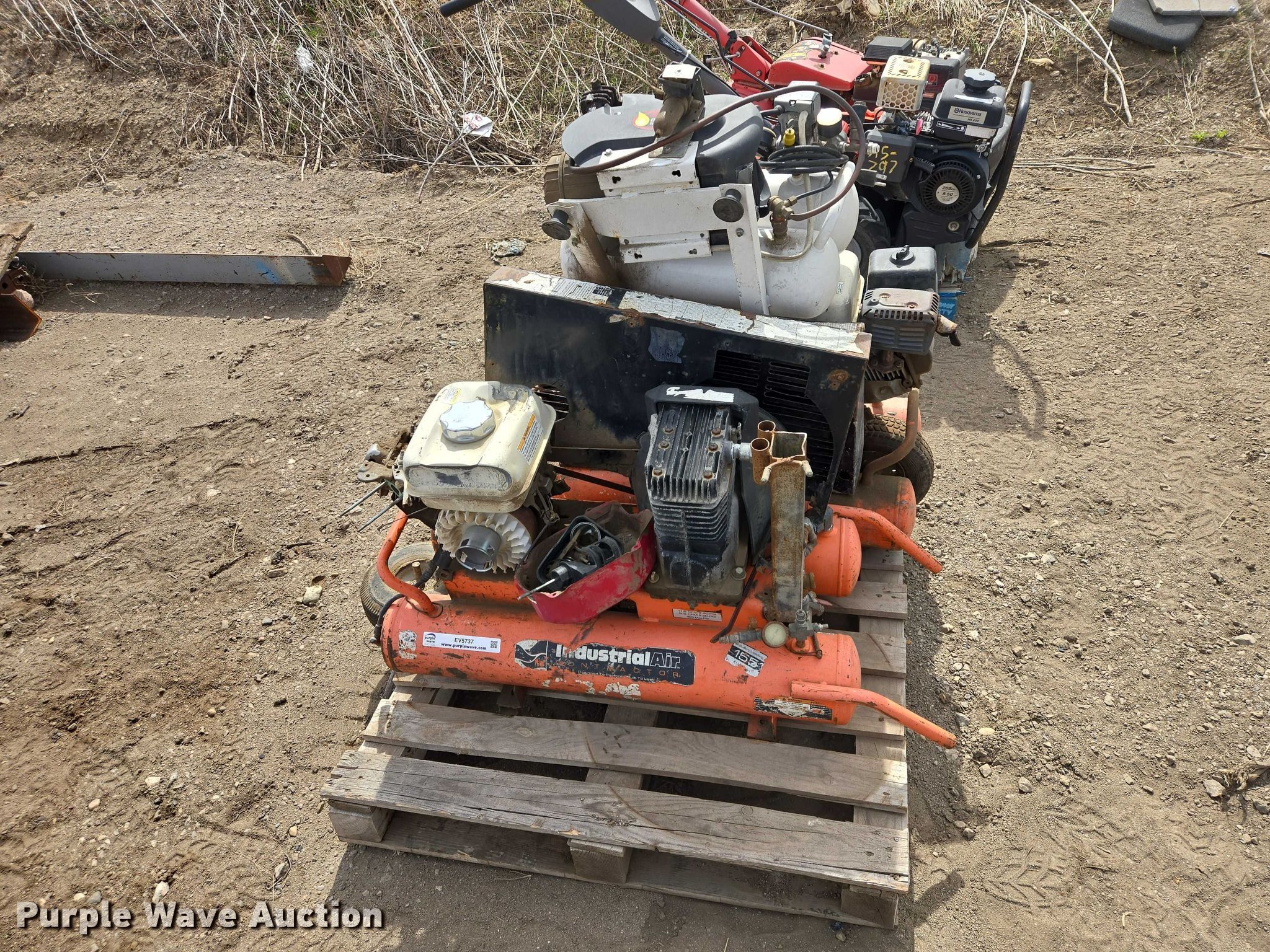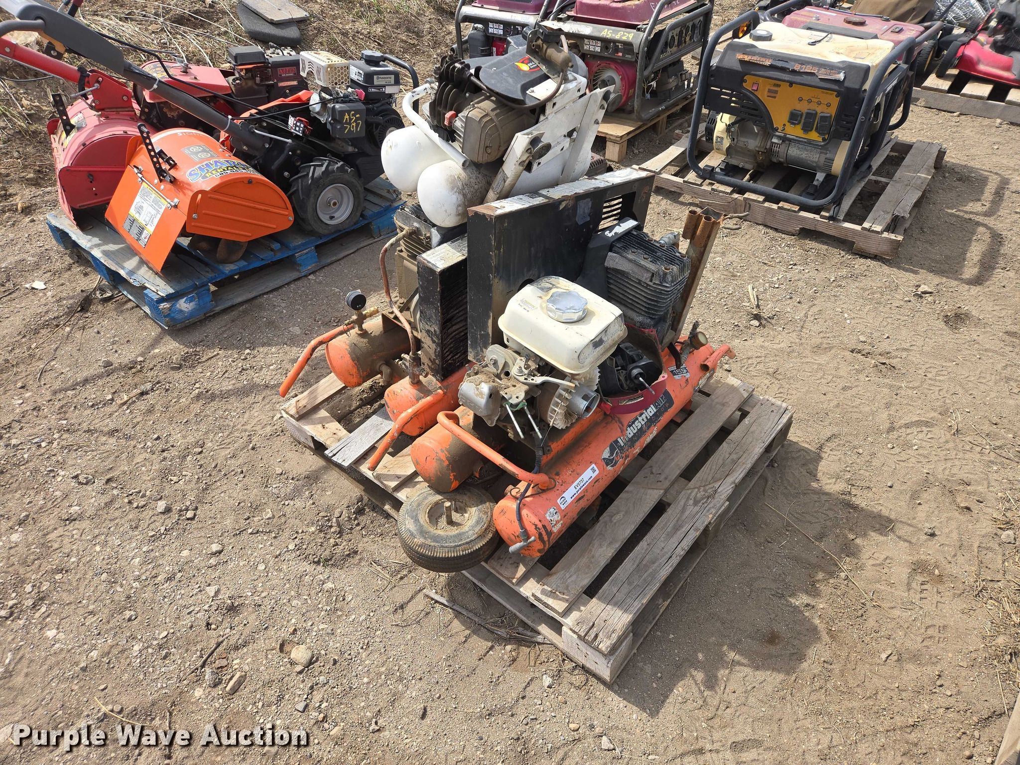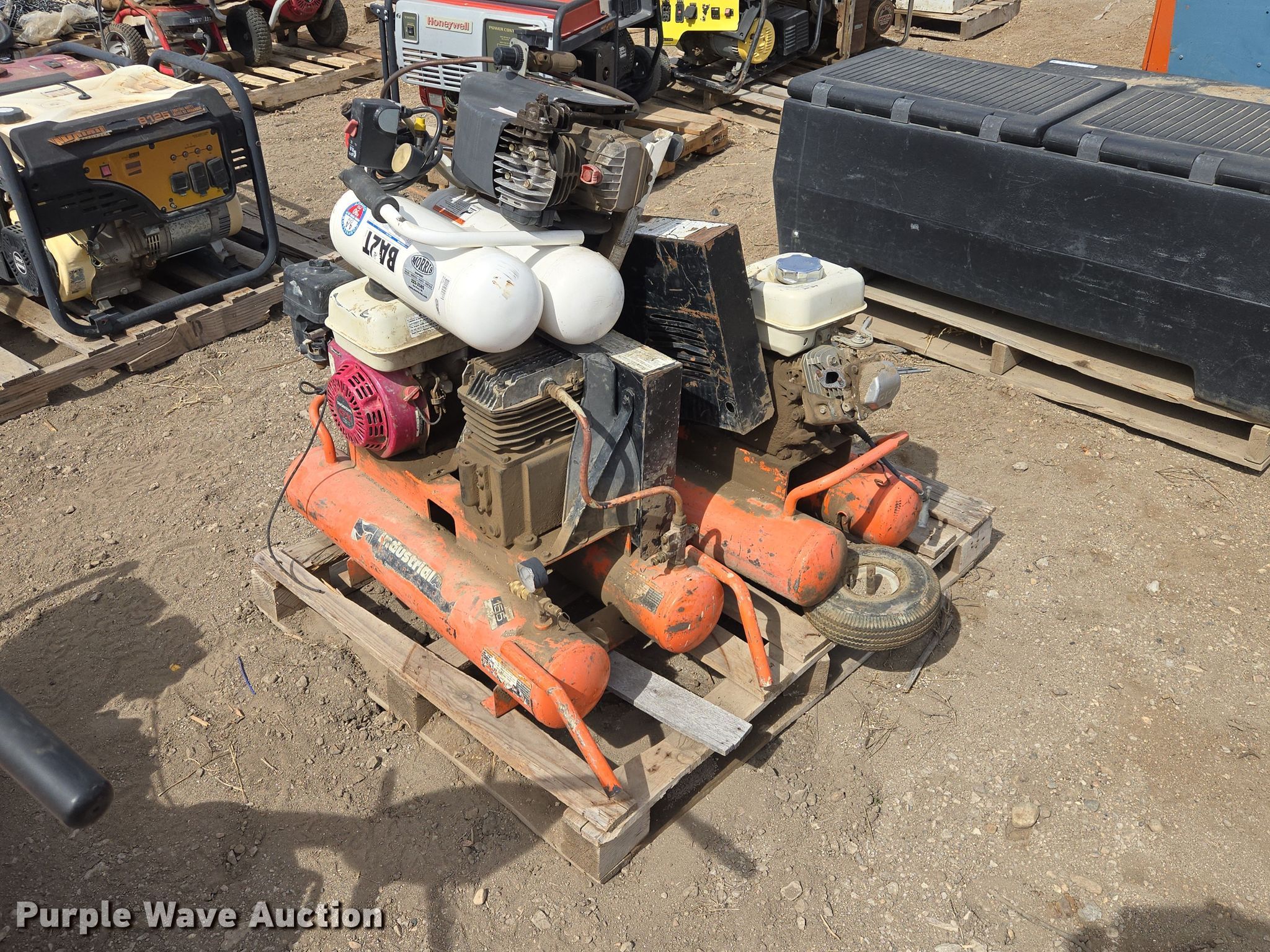 Purple Wave is selling a used Air Compressor in South Dakota. This item is a (3) air compressors with the following: (2) Industrial Air air compressors, Honda GX120 gas engines, BA2T air compressor, 115V