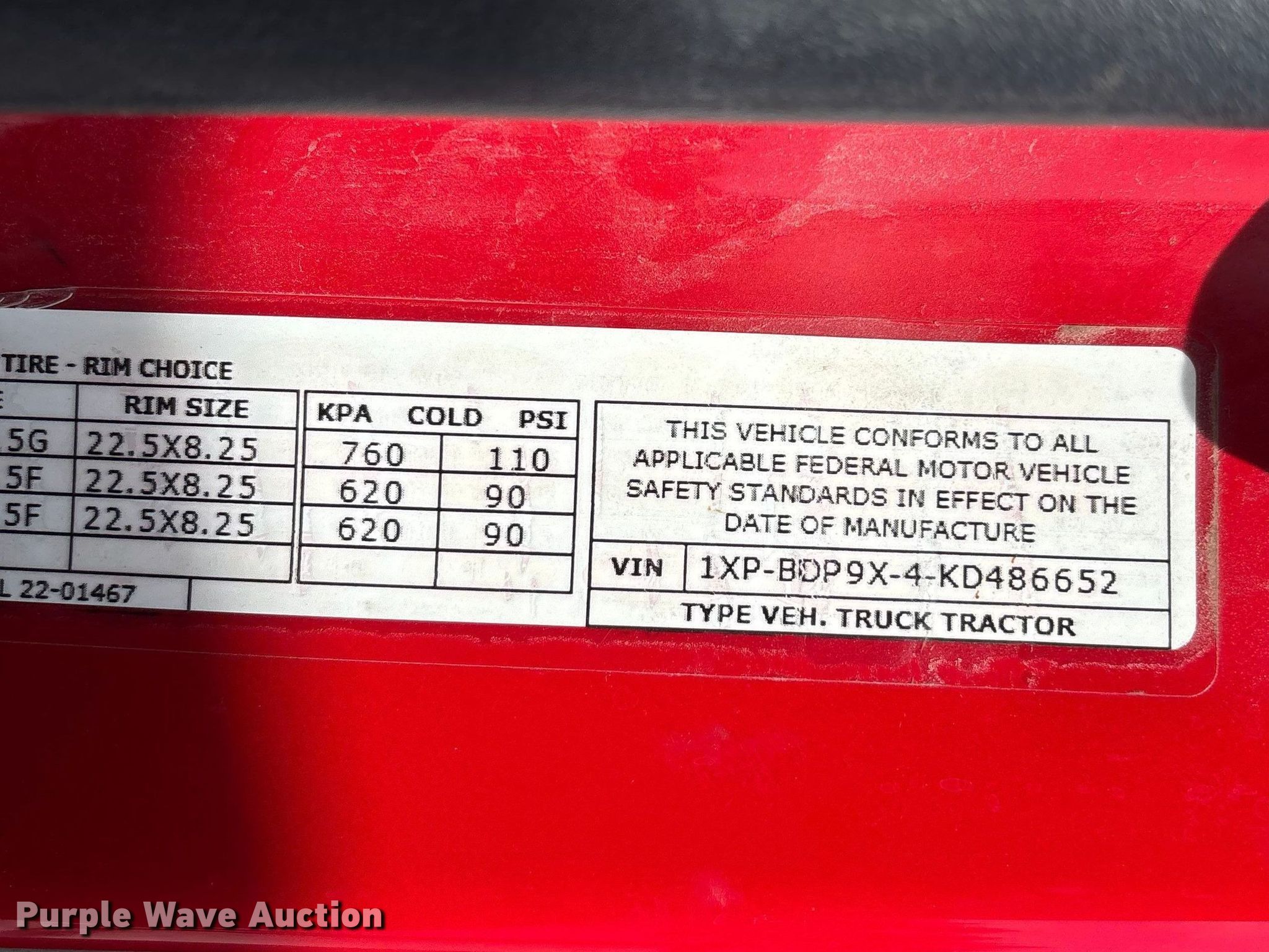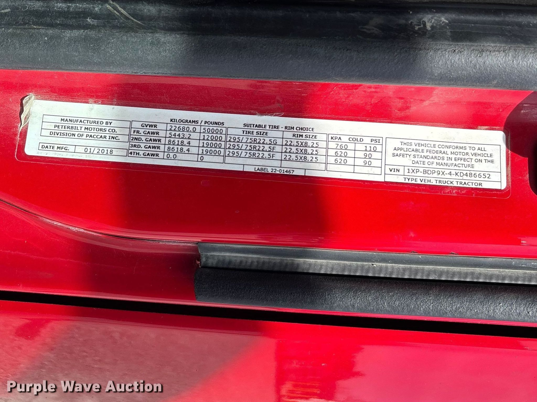 Purple Wave is selling a used Truck Tractor in Missouri. This item is a 2019 Peterbilt 579 semi truck with the following: Miles: 494,574 on odometer, Hours: 14,620 on meter, VIN: 1XPBDP9X4KD486652