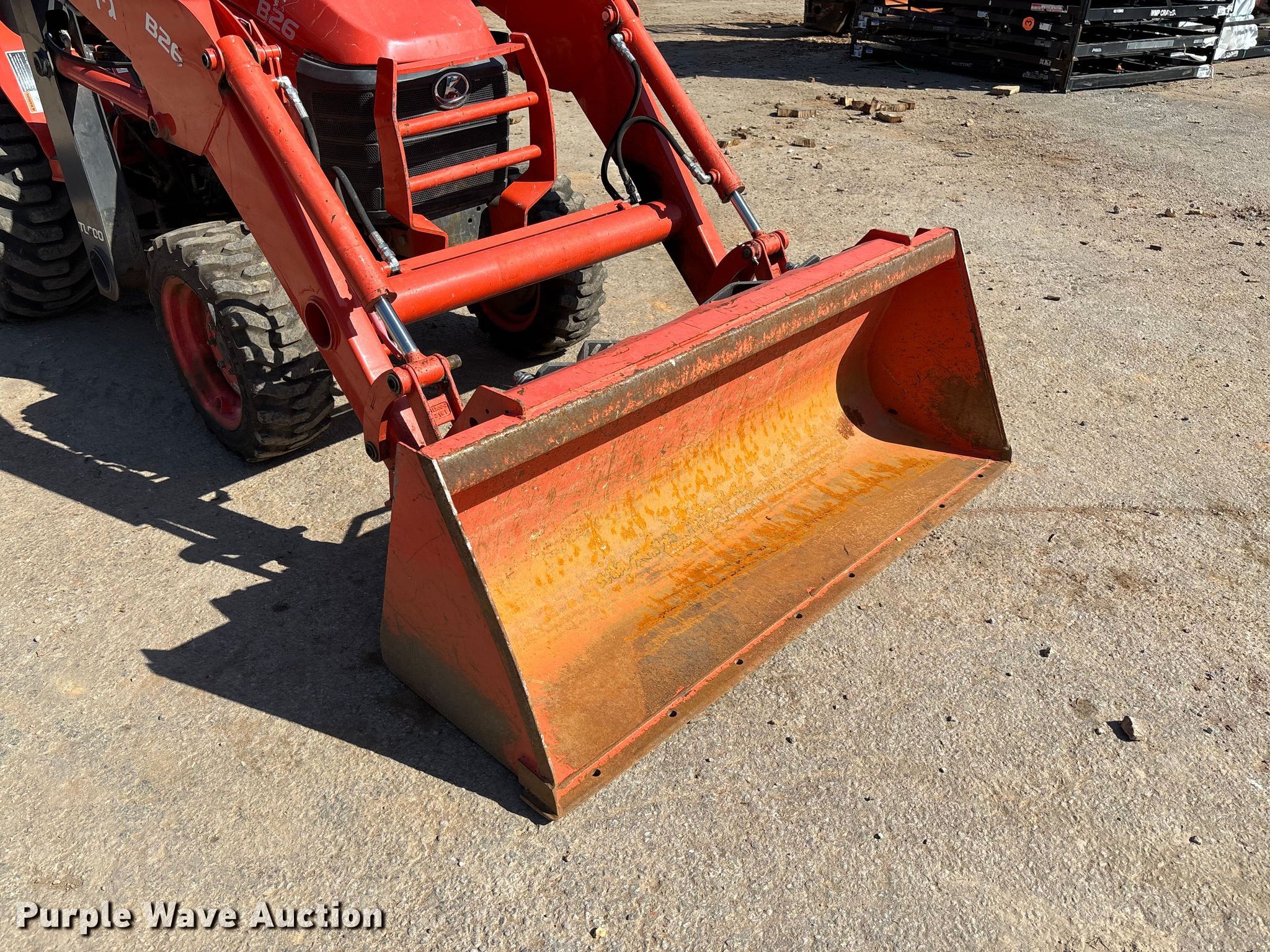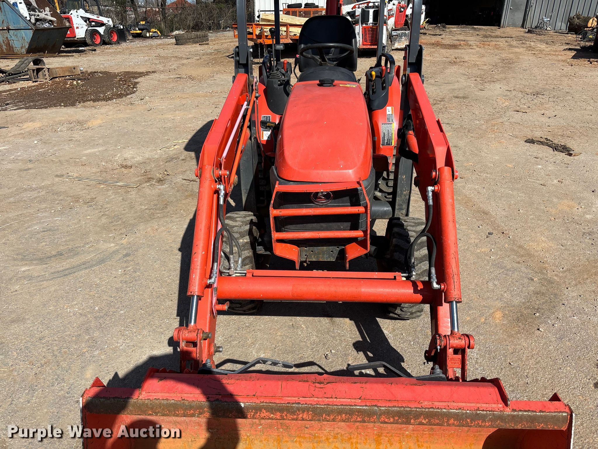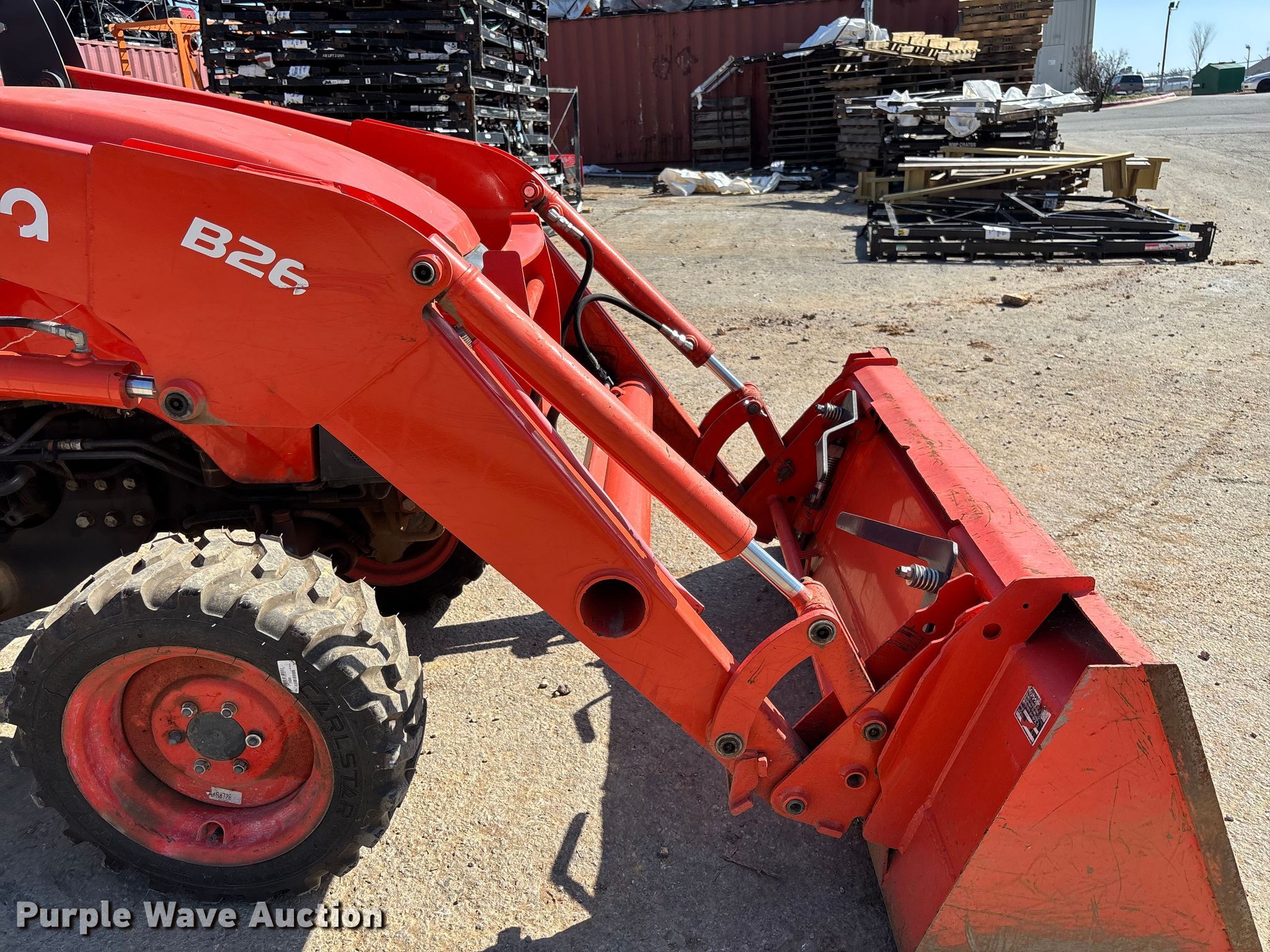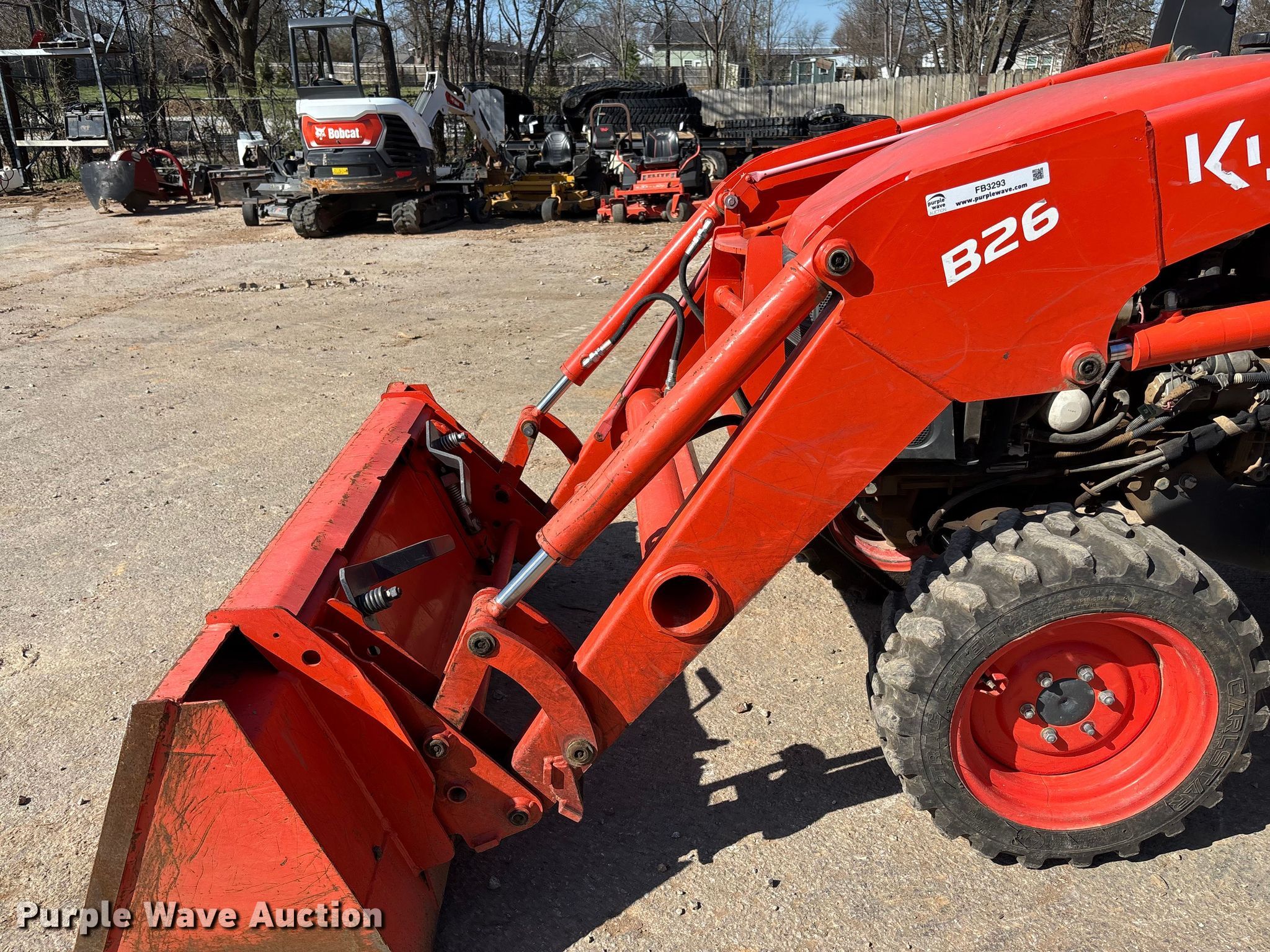 Kubota B26 backhoe. Hours: 426 on meter, Serial: KBU111HRTM1G59596. Engine Kubota D1105-EF03, Displacement: 1.1L, Cylinders: 3, Fuel type: Diesel, kW: 17. Transmission Hydrostatic. Chassis Four wheel drive. Operators station OROPS, Backhoe controls: Wobble stick / two stick. Features Loader Quick coupler: Manual, Bucket Kubota TL2142, Bucket leveler, Width: 60", Cutting edge: Weld-on.. Tires Front: 23x8.50-14, Rear: 12.4-16. Elite Property Services. Rogers, AR 72758