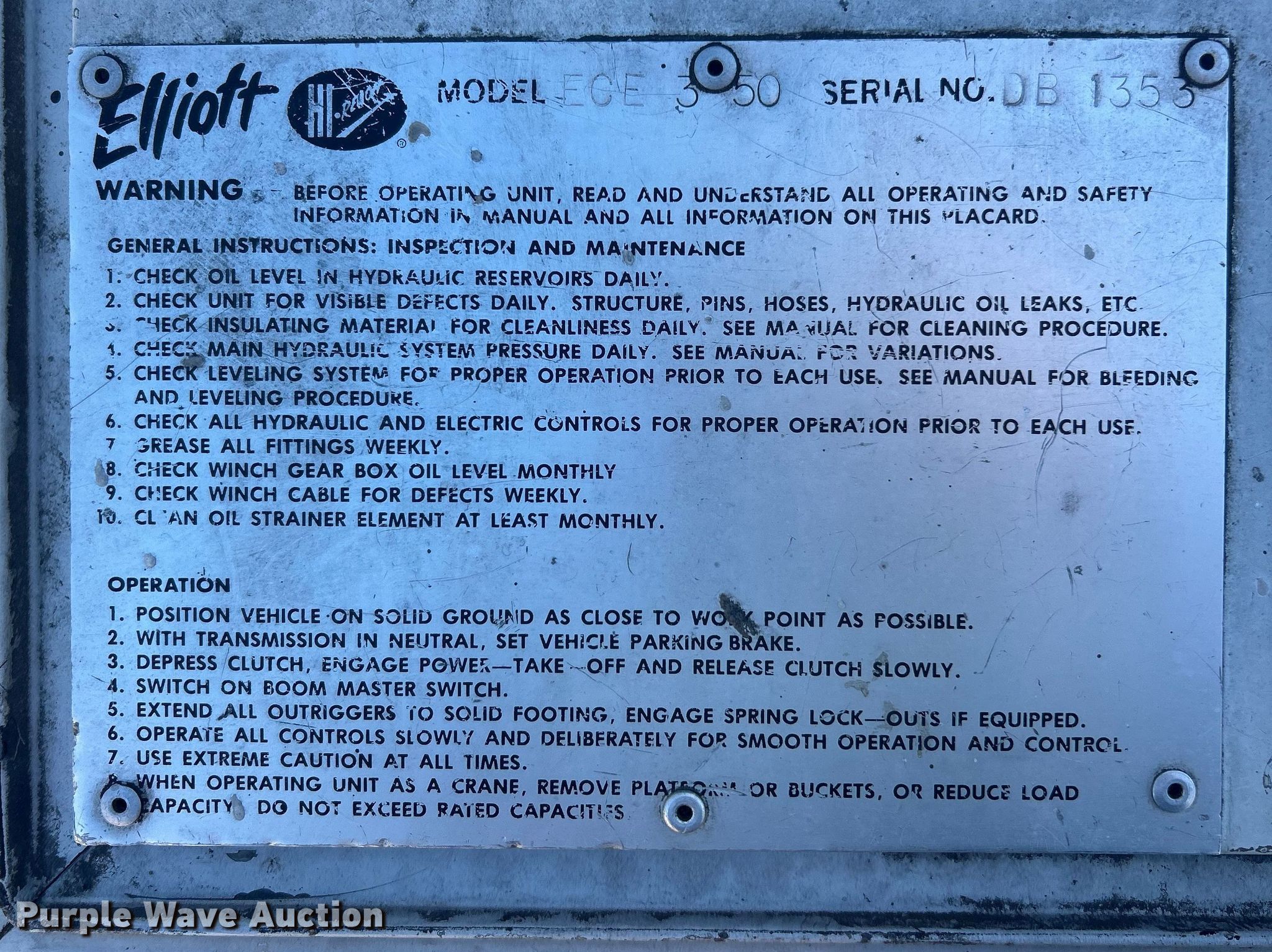 1992 Chevrolet C7 bucket truck. Miles: 210,424 on odometer, Hours: 5,330 on meter, VIN: 1GBL7H1JXNJ103253. Engine Caterpillar, Cylinders: 6, Fuel type: Diesel. Transmission Manual, Speed: 5, plus 2. Chassis Axles: Single, Suspension: Spring, Brakes: Hydraulic, PTO. Interior Heat. Features Bed Flatbed, Length: 21' 6", Width: 96", Boom Elliot ECE 350, Serial: DB1353, Maximum lift capacity: 700 lbs, Maximum lift height: 55', Boom type: Telescopic, Man basket, Boom controls Lower, Basket.. Tires Size: 11R22.5. Illinois title. Title distribution may be delayed up to 14 days from verification of funds. Ace Sign Co. Springfield, IL 62704