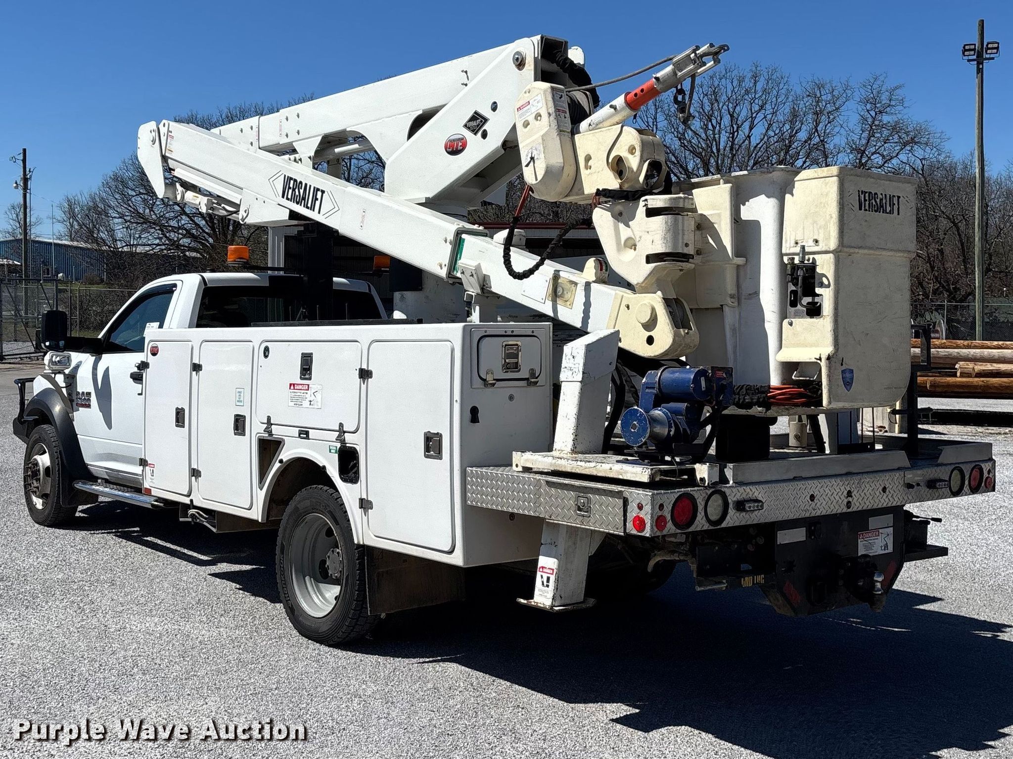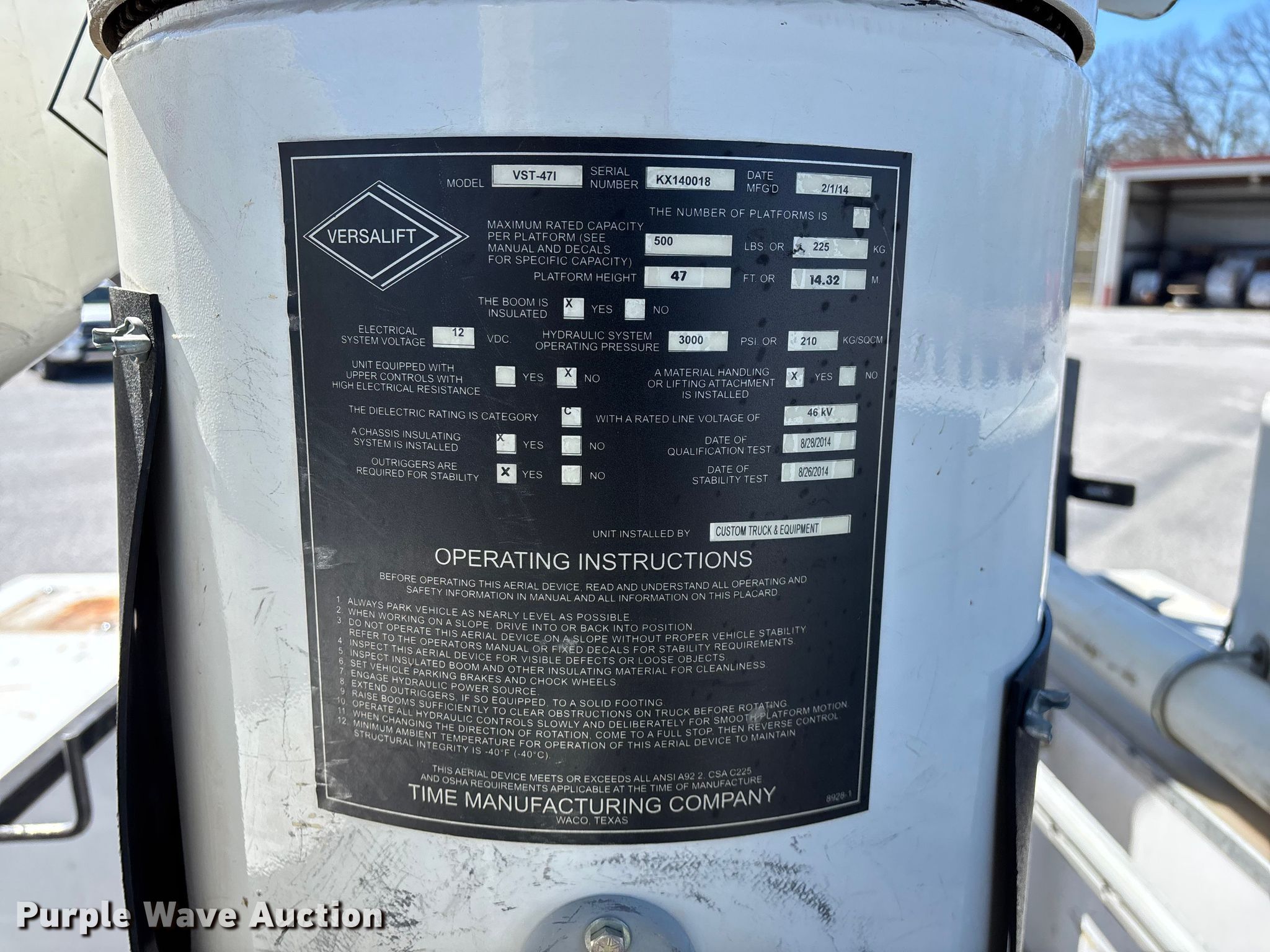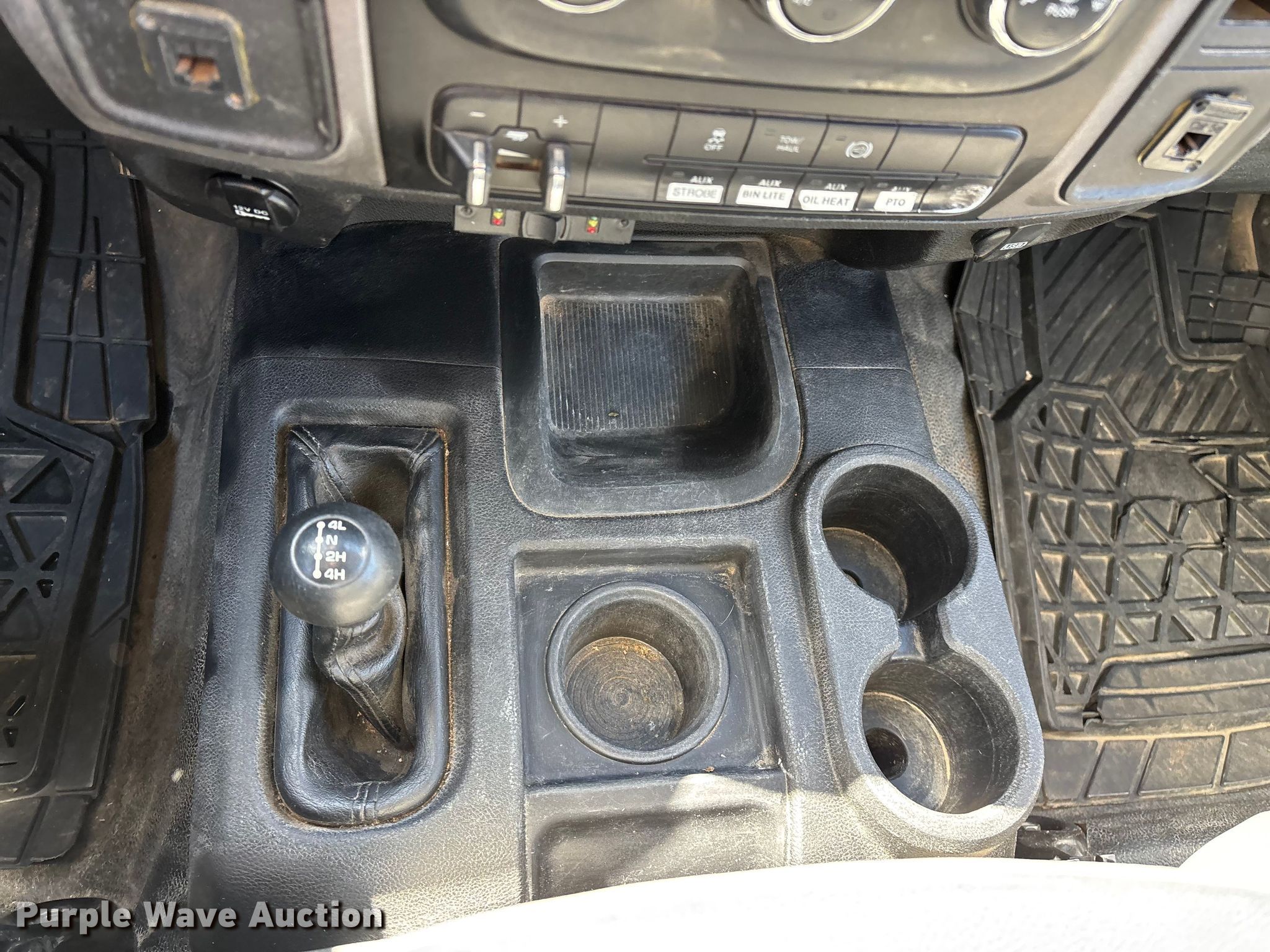 2014 RAM 5500 bucket truck. Miles: 123,031 on odometer, Hours: 9,501 on meter, VIN: 3C7WRNBL3EG211624. Engine Cummins, Displacement: 6.7L, Cylinders: 6, Fuel type: Diesel. Transmission Automatic. Chassis Four wheel drive, Axles: Single, Suspension: Spring, Brakes: Hydraulic, PTO, GVWR: 19,500 lbs. Interior AC, Heat, Heated mirrors, Power windows, Power locks, Cruise control, Backup camera, Auxiliary controls, Brake controller. Features Bed Brand FX, Serial: 14 48883, Length: 11', Width: 97", Height: 60", Boom Versalift VST-47I, Serial: KX140018, Boom length: 16' 8", Maximum lift capacity: 500 lbs, Maximum lift height: 47', Boom type: Articulating, Insulated, Telescopic, Man basket, Boom controls Lower, Basket, Material handler. Tires Size: 225/70R19.5. Notes Dash warning indicator: Change oil soon, coolant low, Port hole in cab roof, Hydraulic leak, Capstan winch issues, possible electrical issue. Missouri title. Title distribution may be delayed up to 14 days from verification of funds. Barry Electric Cooperative. Cassville, MO 65625