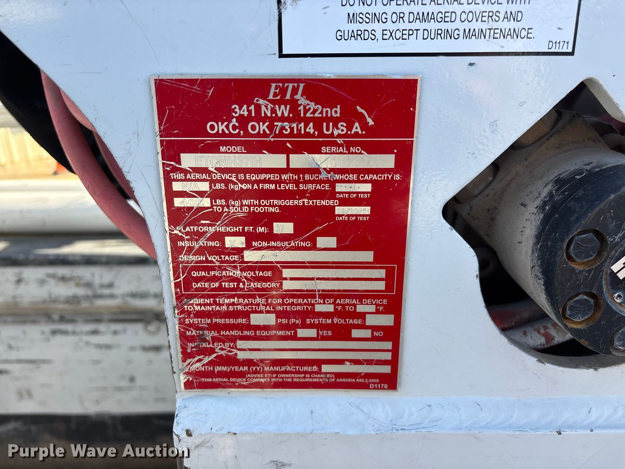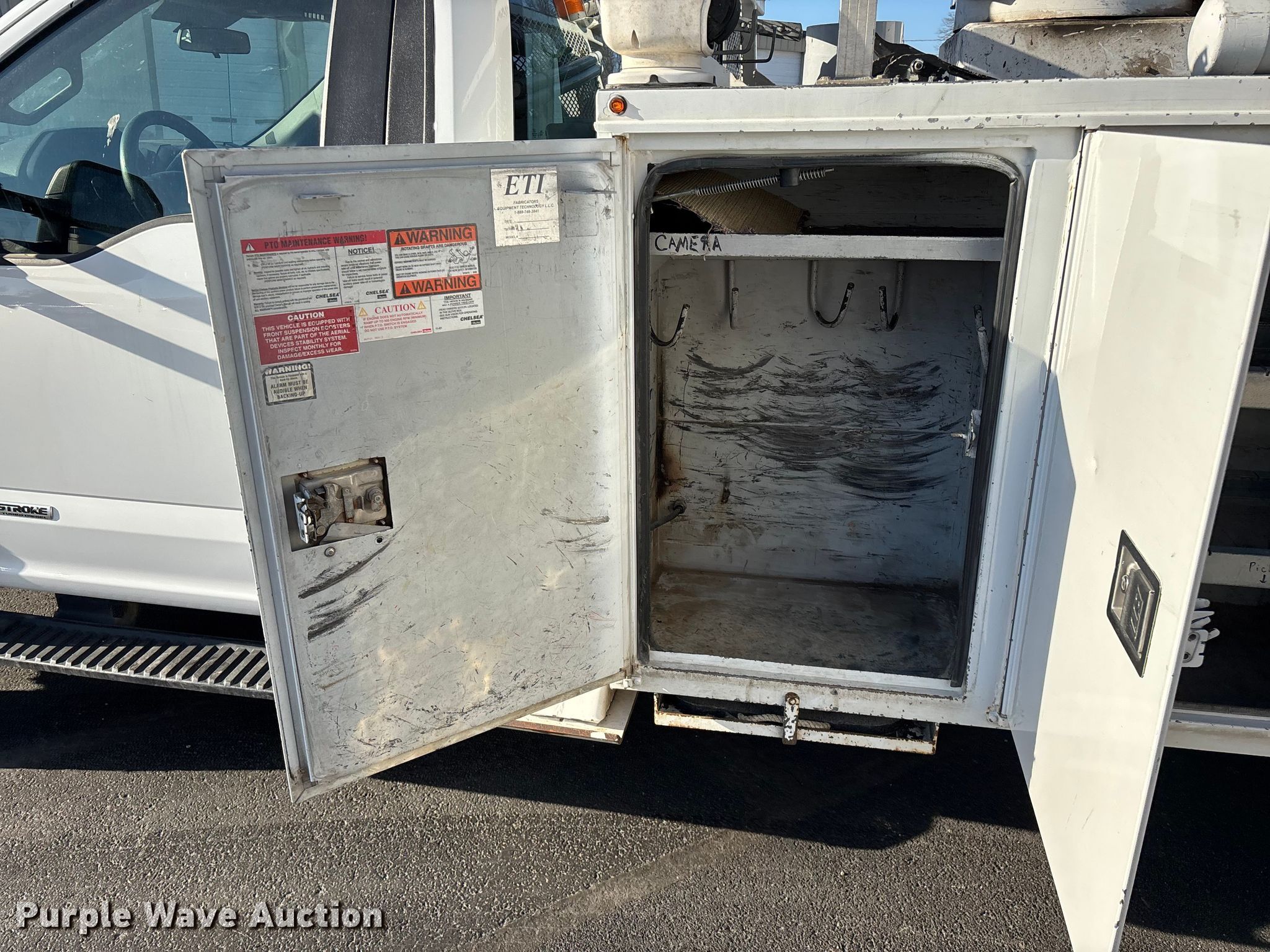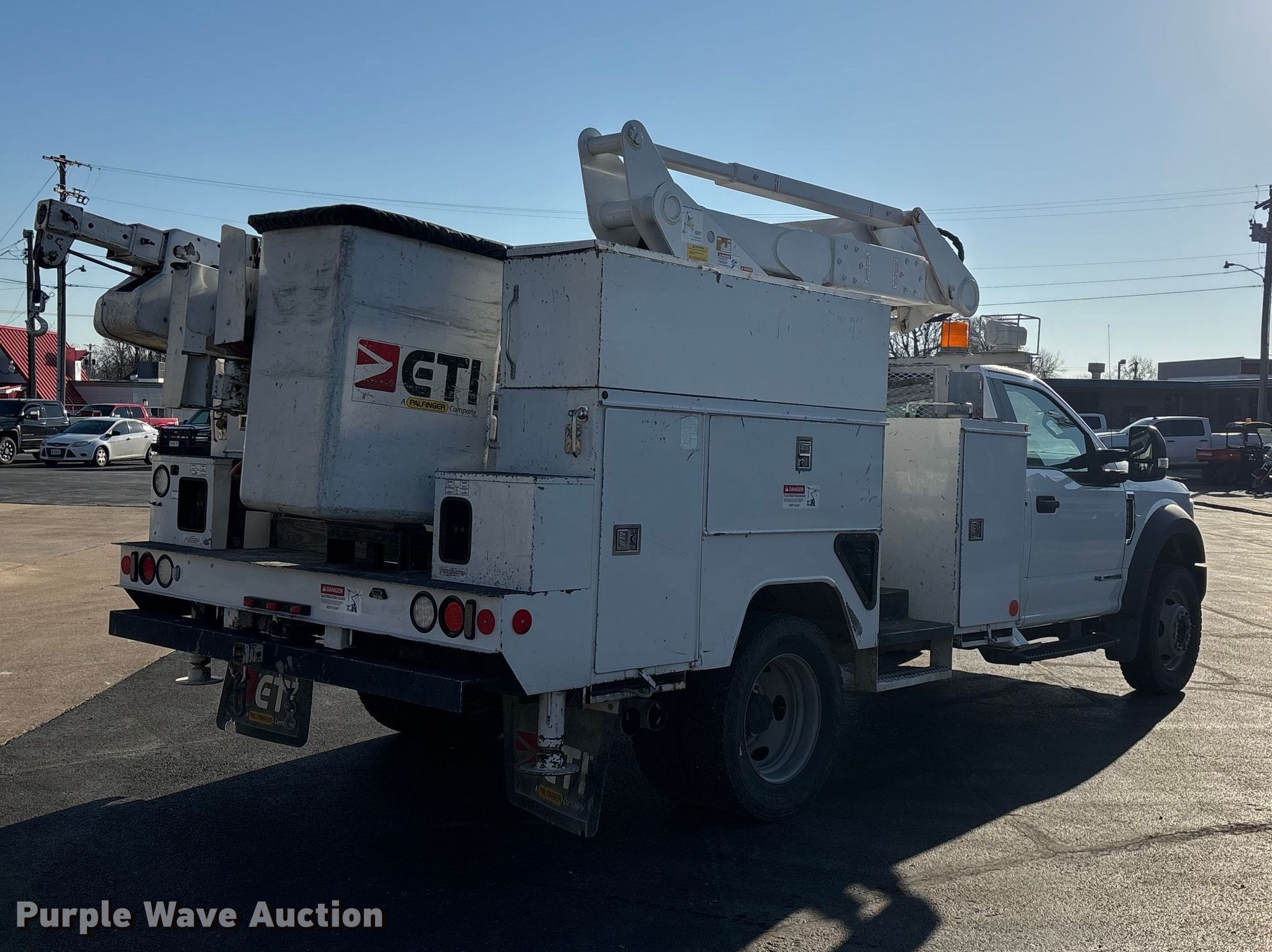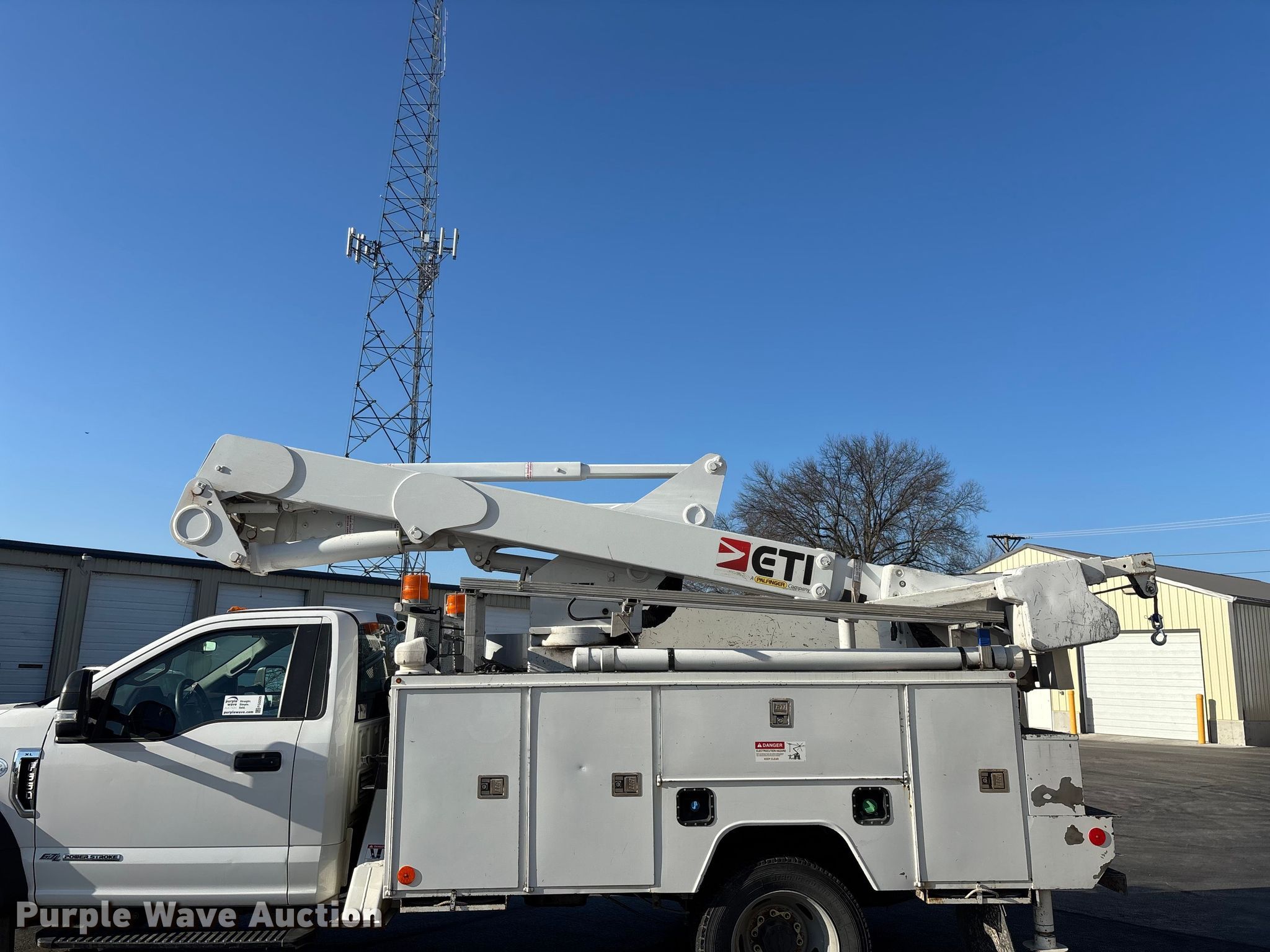 2018 Ford F550 Super Duty bucket truck. Miles: 126,078 on odometer, Hours: 8,652 on meter, VIN: 1FDUF5HT6JEC47843. Engine Displacement: 6.7L, Cylinders: 8, Fuel type: Diesel. Transmission Automatic. Chassis Four wheel drive, Axles: Single, Suspension: Spring, Brakes: Hydraulic, PTO, GVWR: 19,500 lbs, Wheelbase: 169". Interior AC, Heat, Heated mirrors, Power windows, Power locks, Cruise control, Backup camera, Auxiliary controls, Brake controller. Features Bed ETI SB122DD96B18Q, Serial: 14427, Length: 11' 9", Width: 96", Height: 60", Boom ETI ETCMH37IH, Serial: 0911CM78646, Boom length: 15' 4", Mast height: 37', Maximum lift capacity: 400 lbs, Boom type: Articulating, Insulated, Telescopic, Man basket, Boom controls Lower, Basket, Material handler. Tires Size: 245/70R19.5. Notes Dash warning indicator: Check engine, Jump start required during on-site data collection, Oil leak. Missouri title. Title distribution may be delayed up to 14 days from verification of funds. Southwest Electric Cooperative, Inc. Bolivar, MO 65613